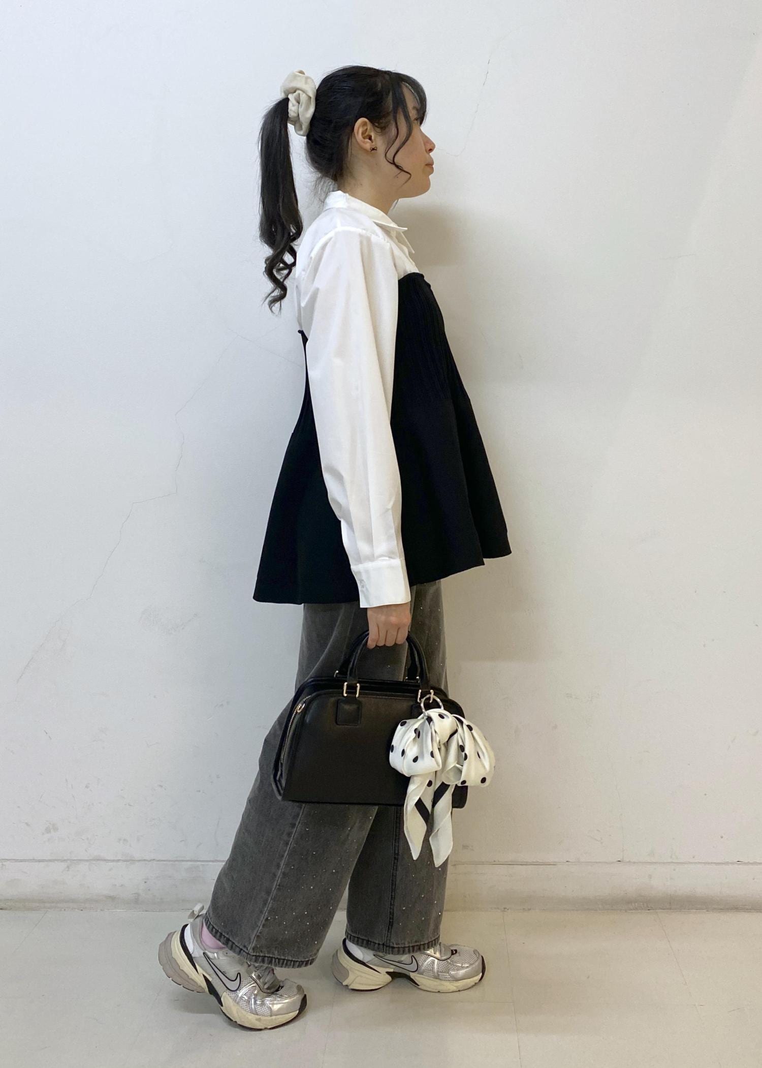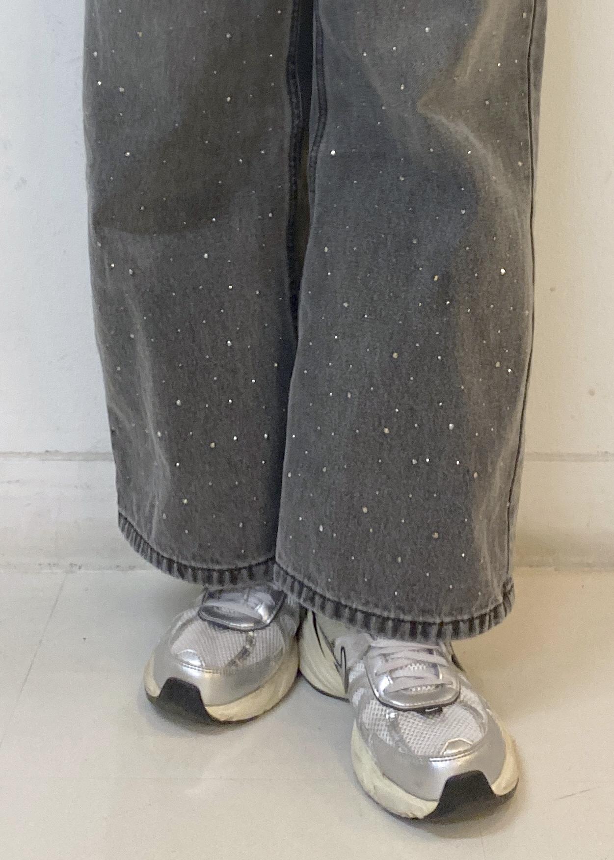 パンツのビジューやシューズのシルバーカラーがシンプルさの中で程よいアクセントになっています。
