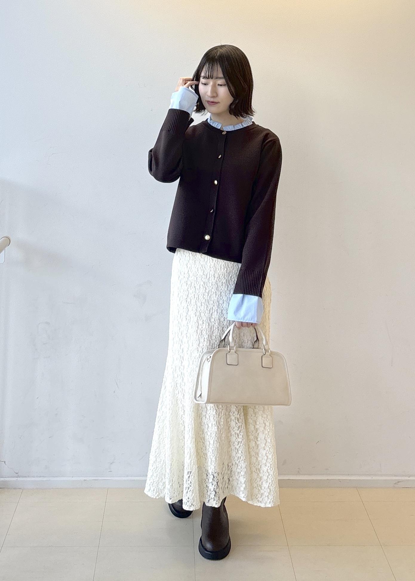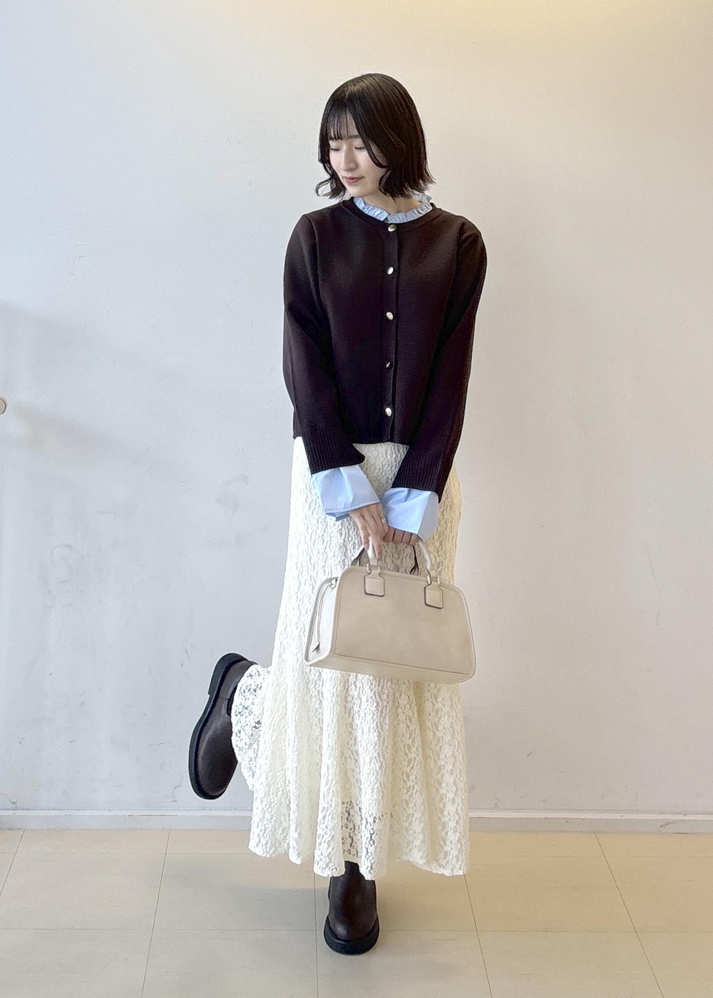 カーディガンの襟と首元のフリルがとても可愛い!レースのスカートを合わせてフェミニンさもプラス♪