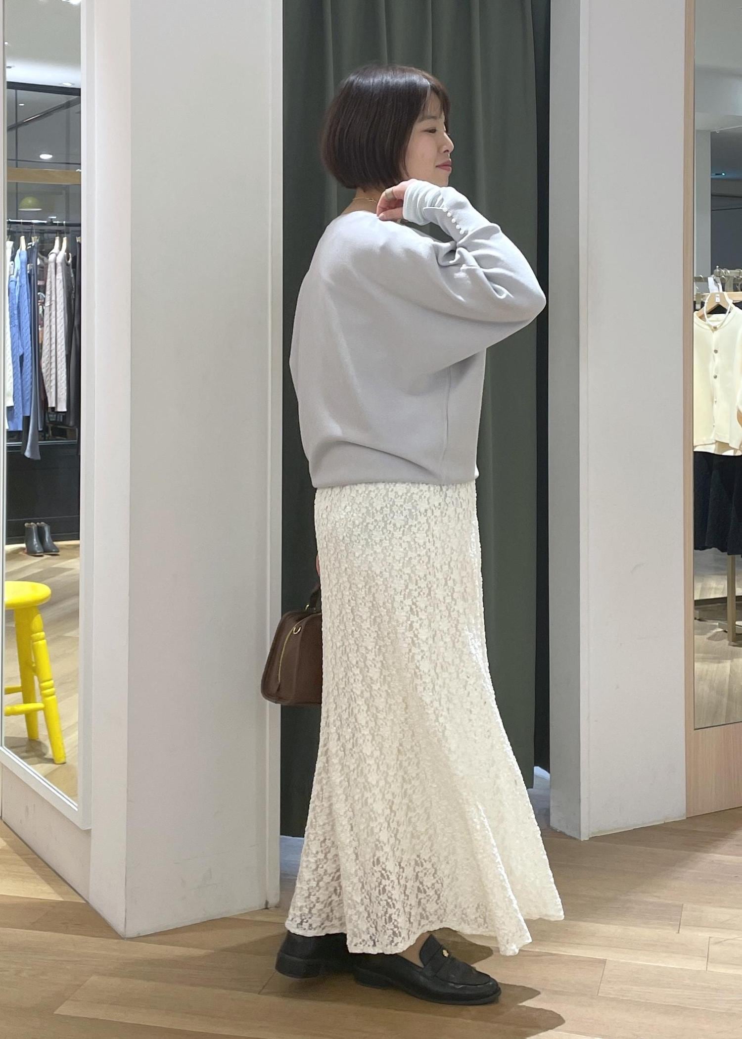 なめらかな質感で品良く合わせることができるマシュマロニットに、レースのスカートを合わせた、オンオフ兼用で使えるきれいめコーデです!