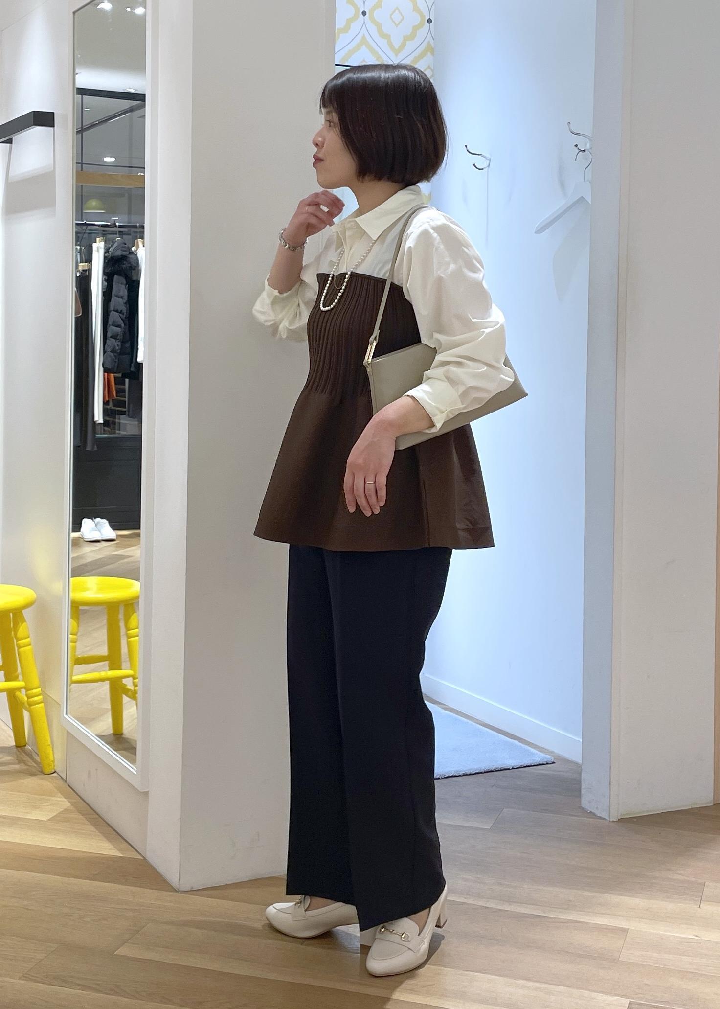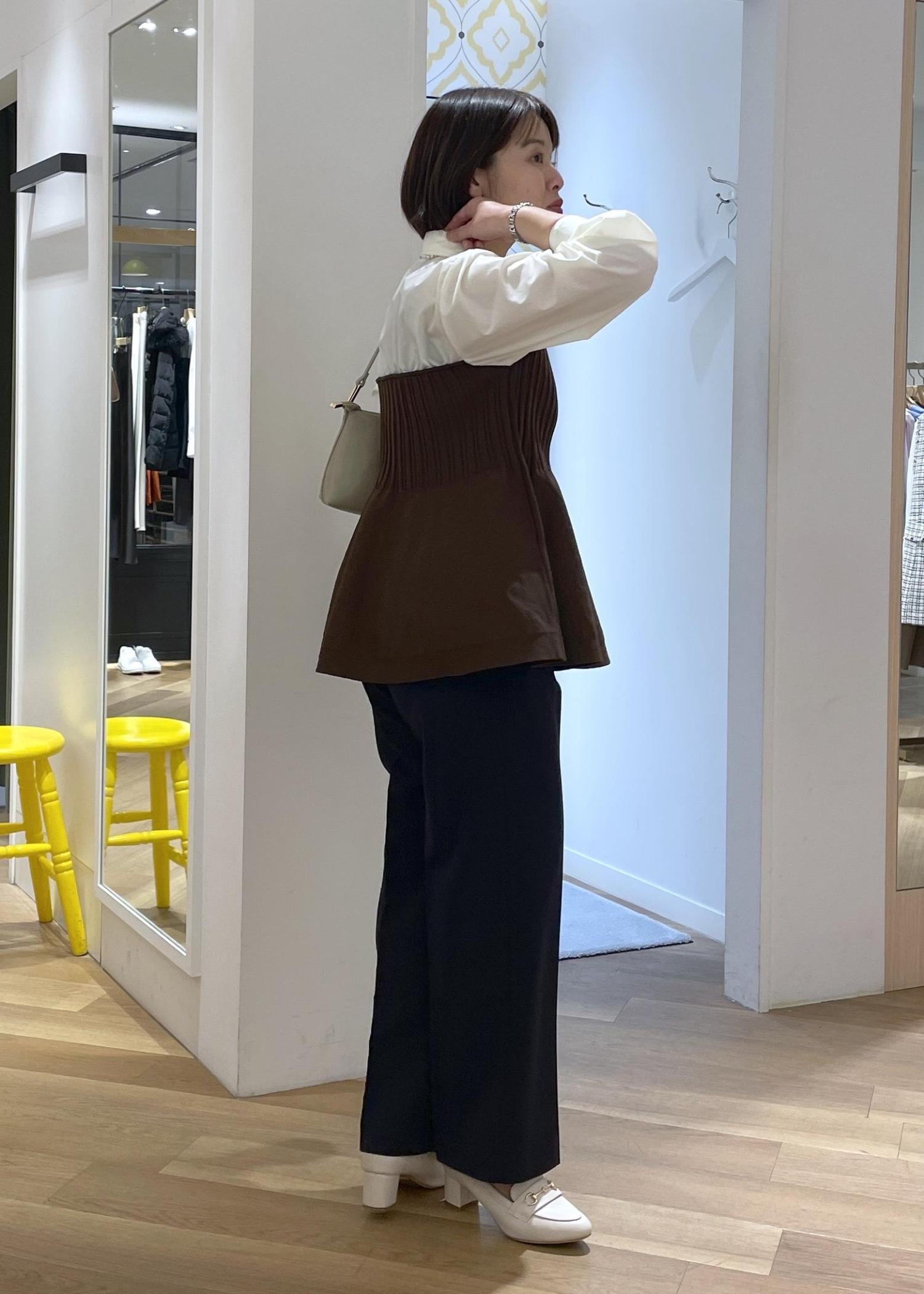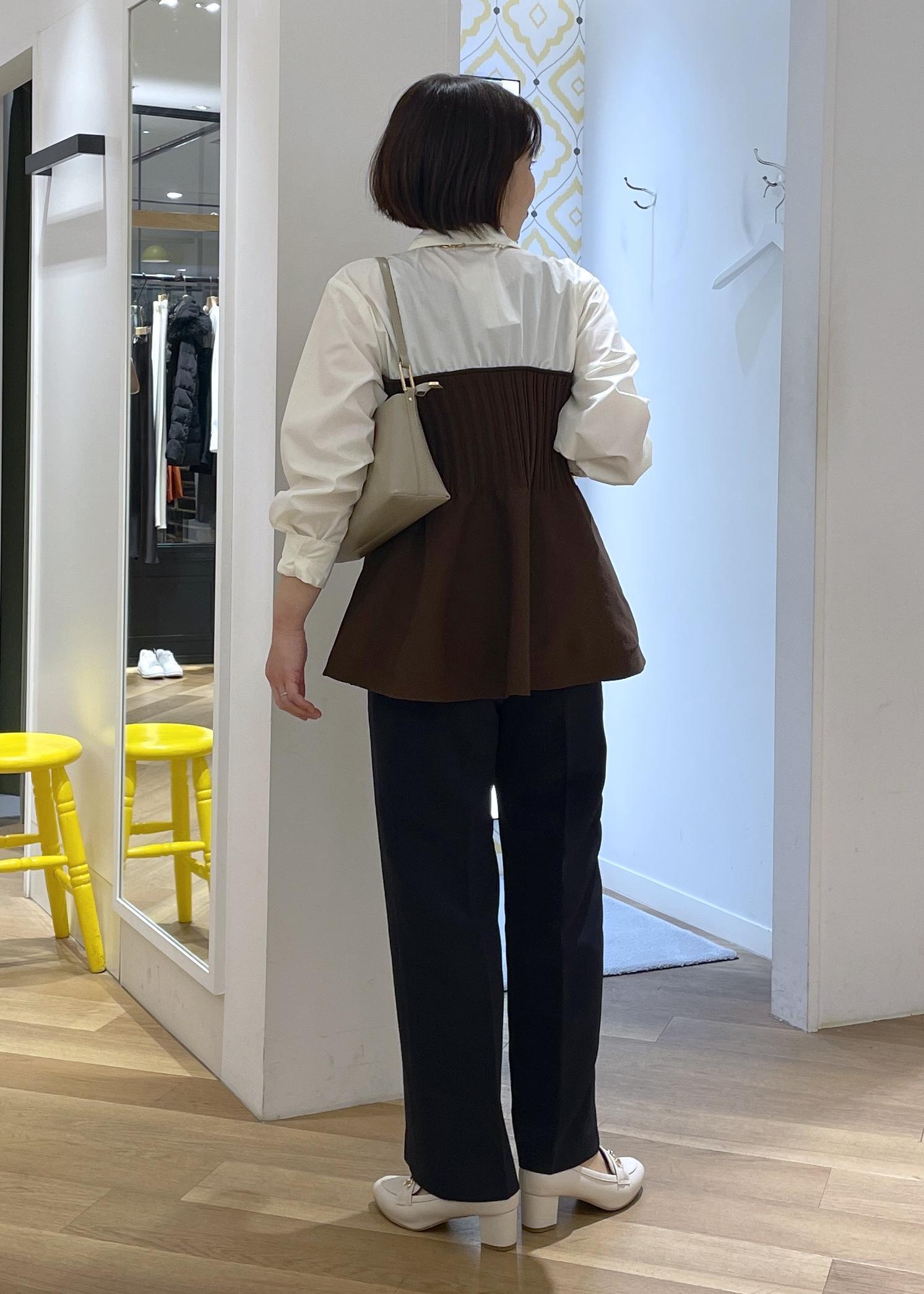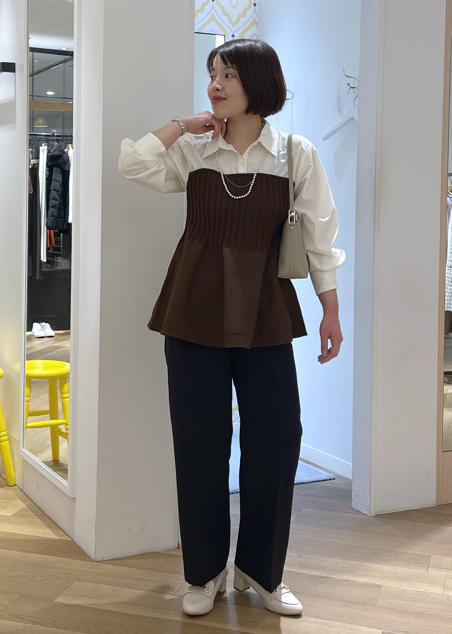トップスがペプラムでふんわりと裾が広がるデザインなので、ボトムはすっきりめのワイドで合わせてメリハリのあるコーデで合わせました!