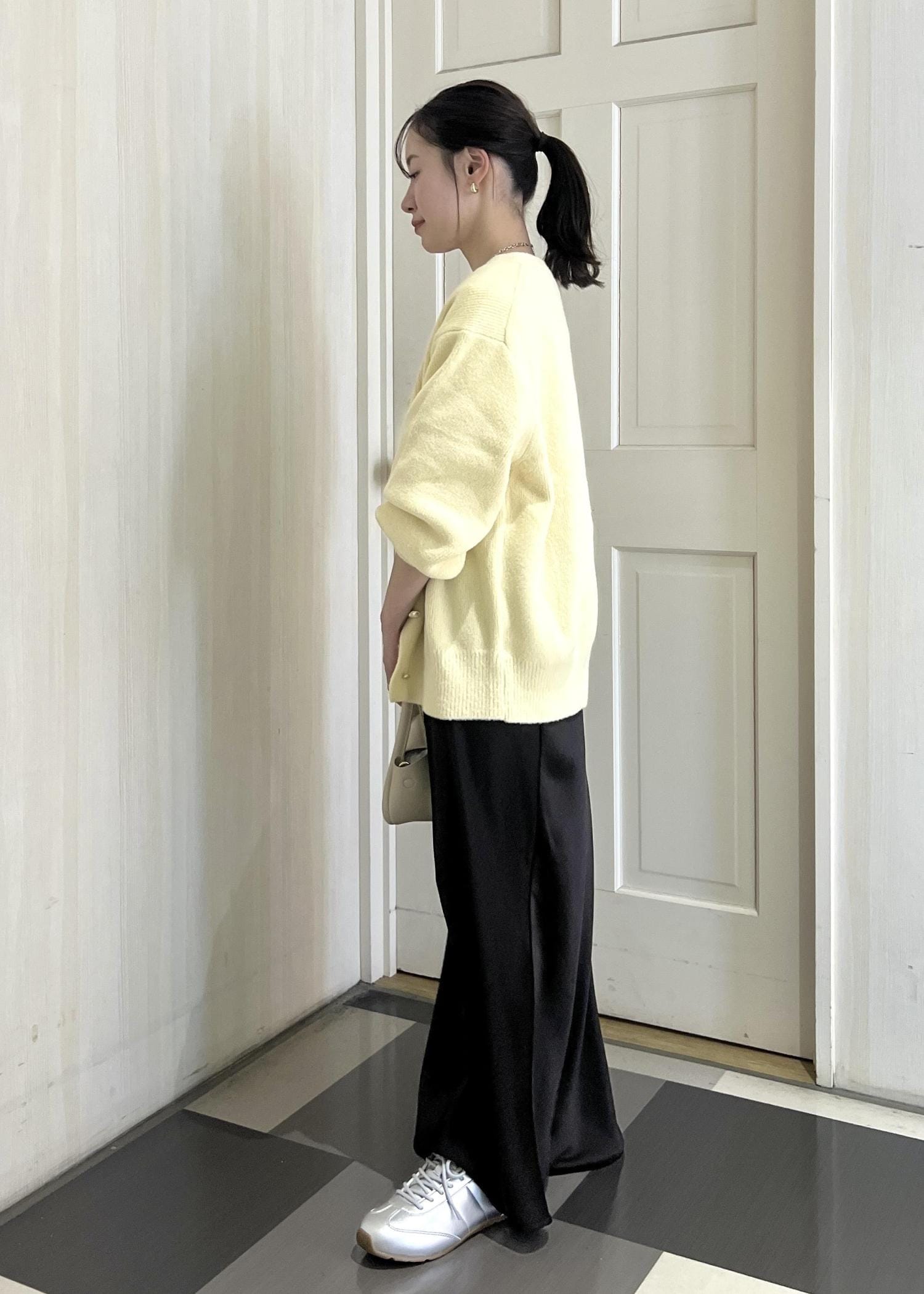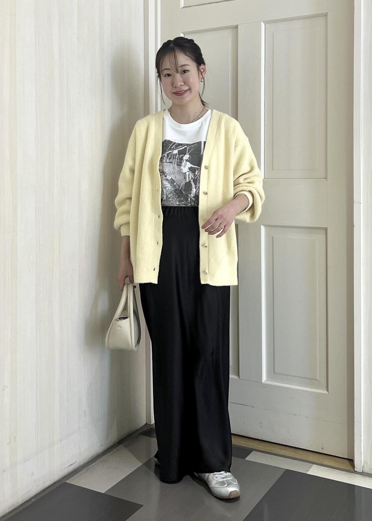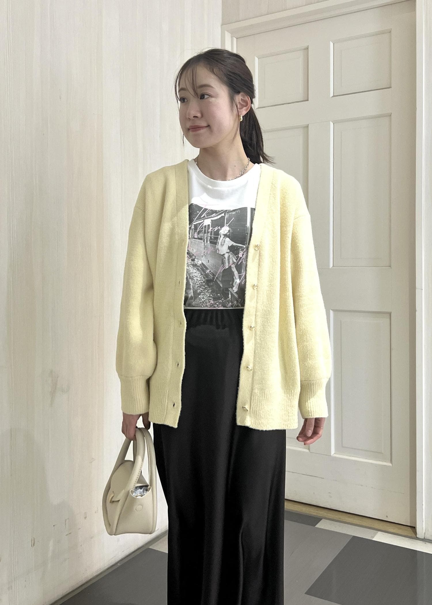 ゆったりめのカーディガンを、フォトTシャツとスニーカーでカジュアルに。