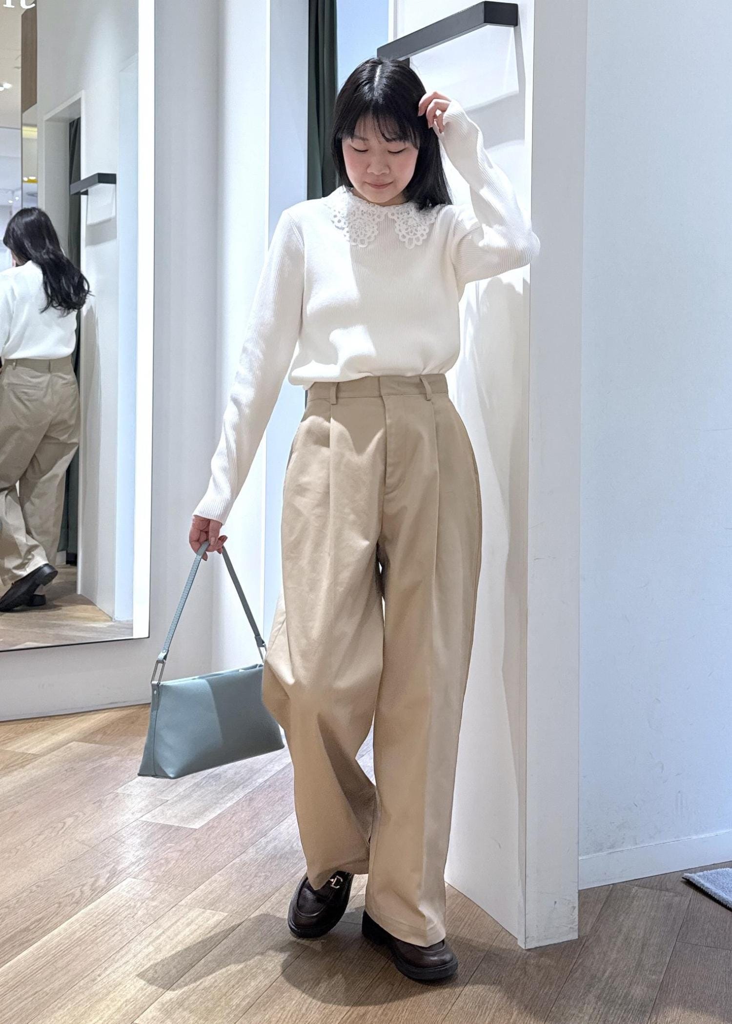 襟付きトップスにチノパンツを合わせたマニッシュなルックです。