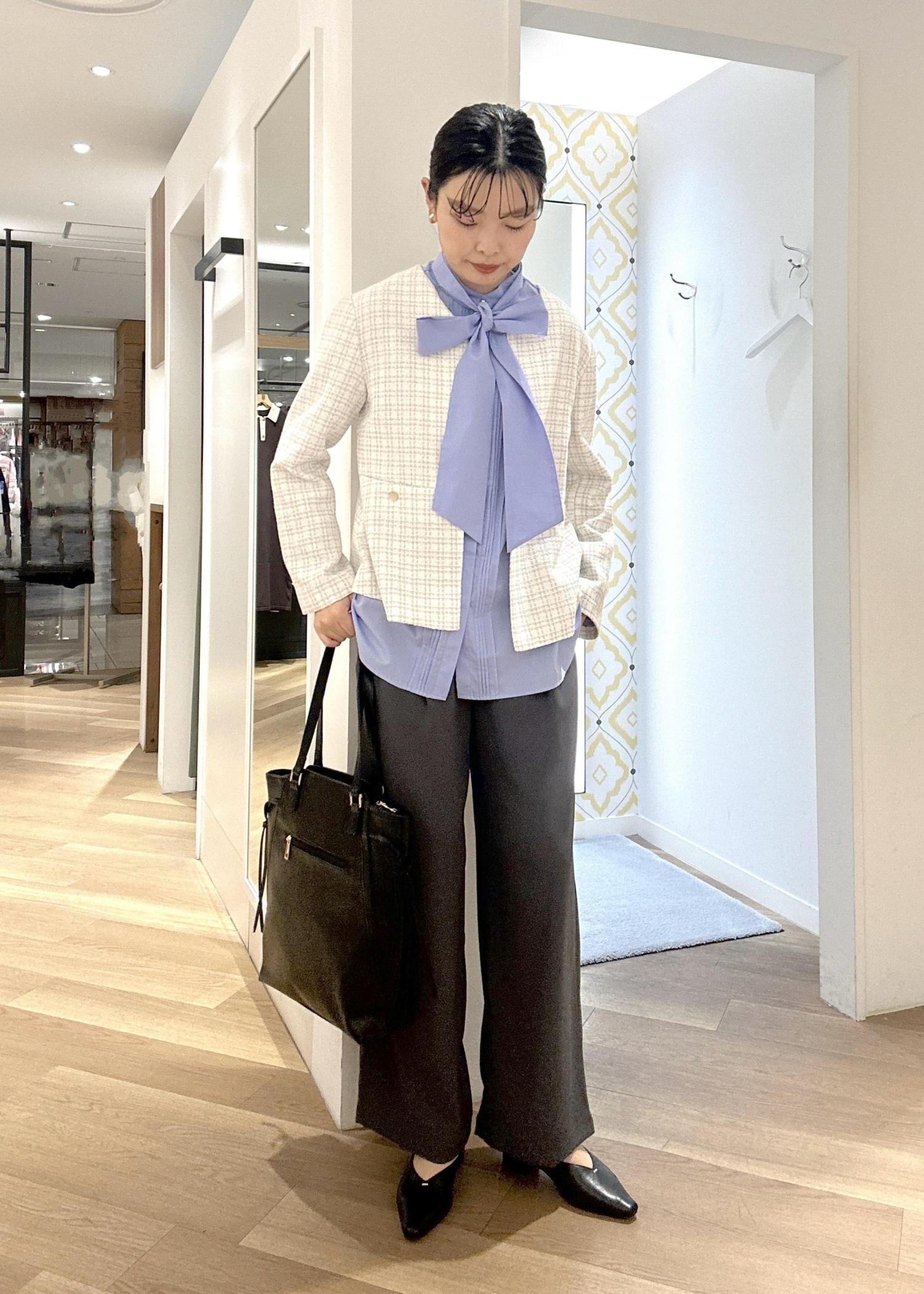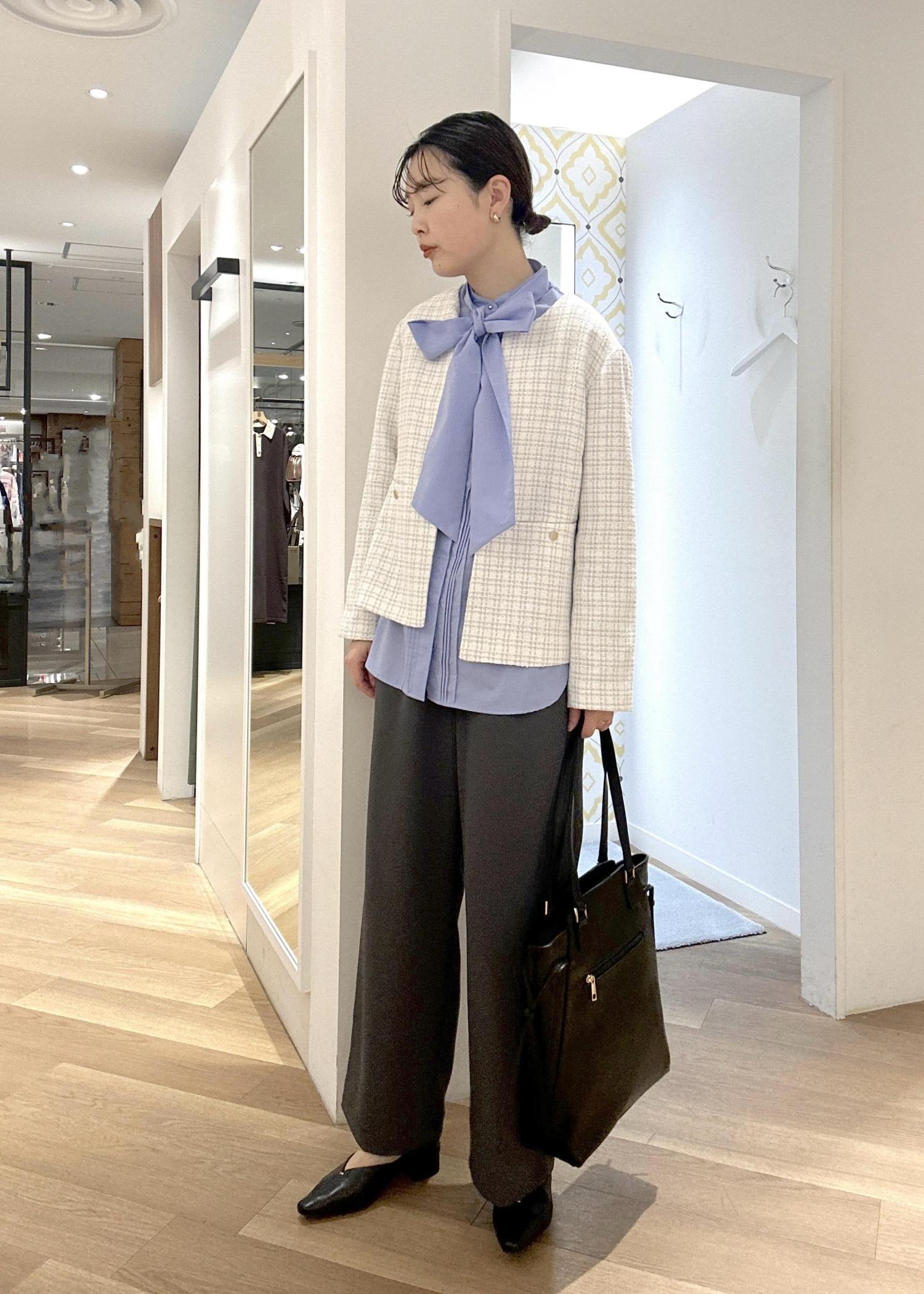 存在感のあるボウタイブラウスと、ツイードのジャケットで華やかに♪ ボトムはリラックス感のあるジョガーパンツで、キレイめカジュアルなスタイリングです。