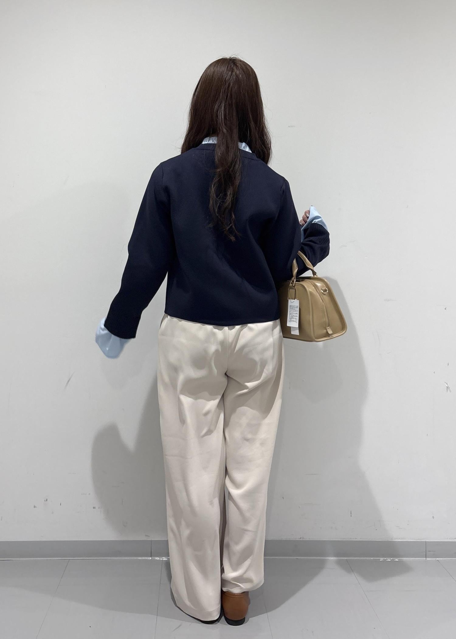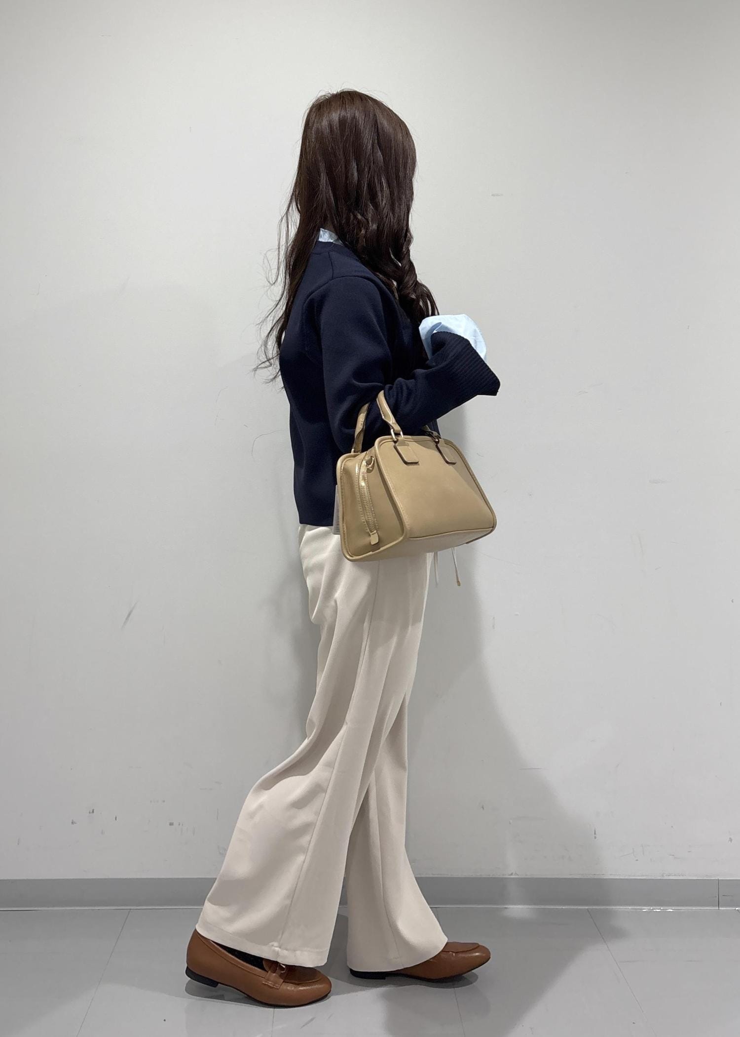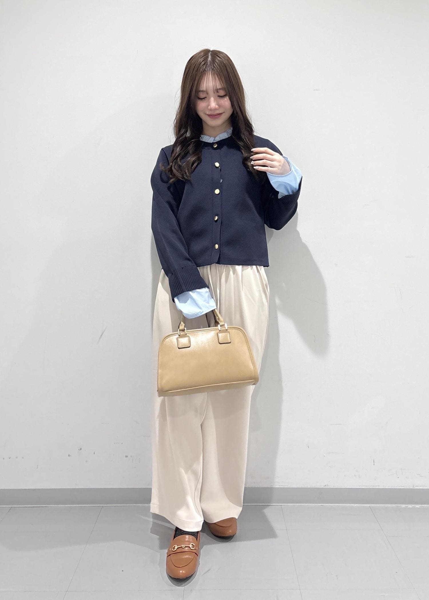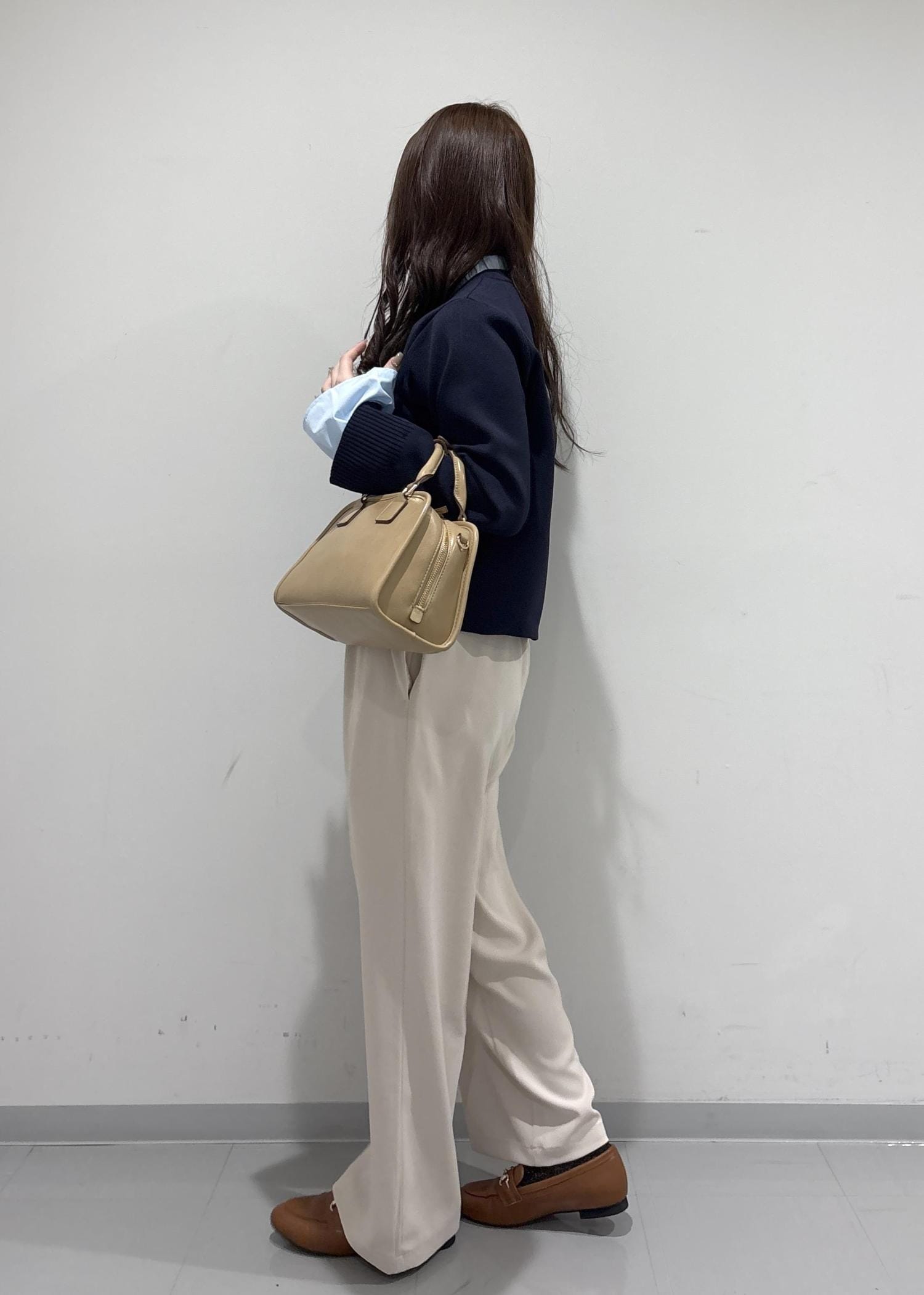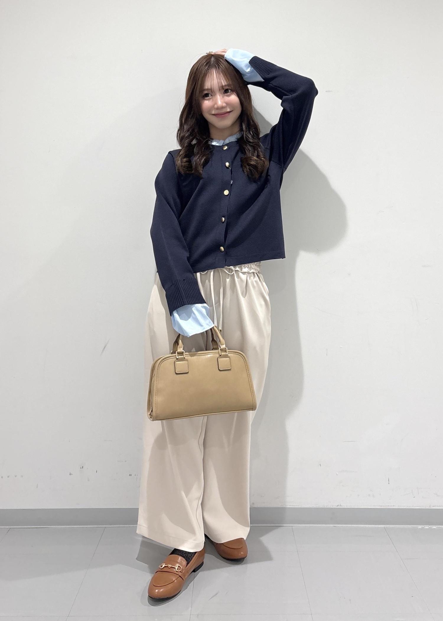 こちらのコーデは、ブルベさんが絶対似合うようなコーデを組んでみました!ネイビーのトップスは、襟も袖も水色で春っぽくて可愛いです!白いパンツでツヤ感を出して、バッグはうるさい色にならないようにベージュ系にしてみました!シューズは、明るいブラウンのローファで大人っぽいフェミニンな印象にしてみました!