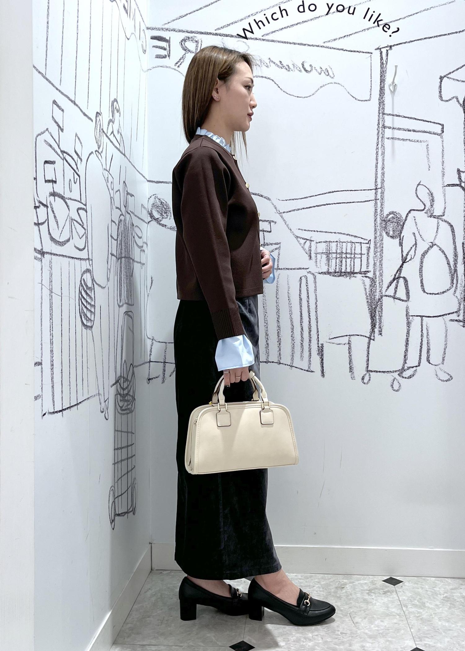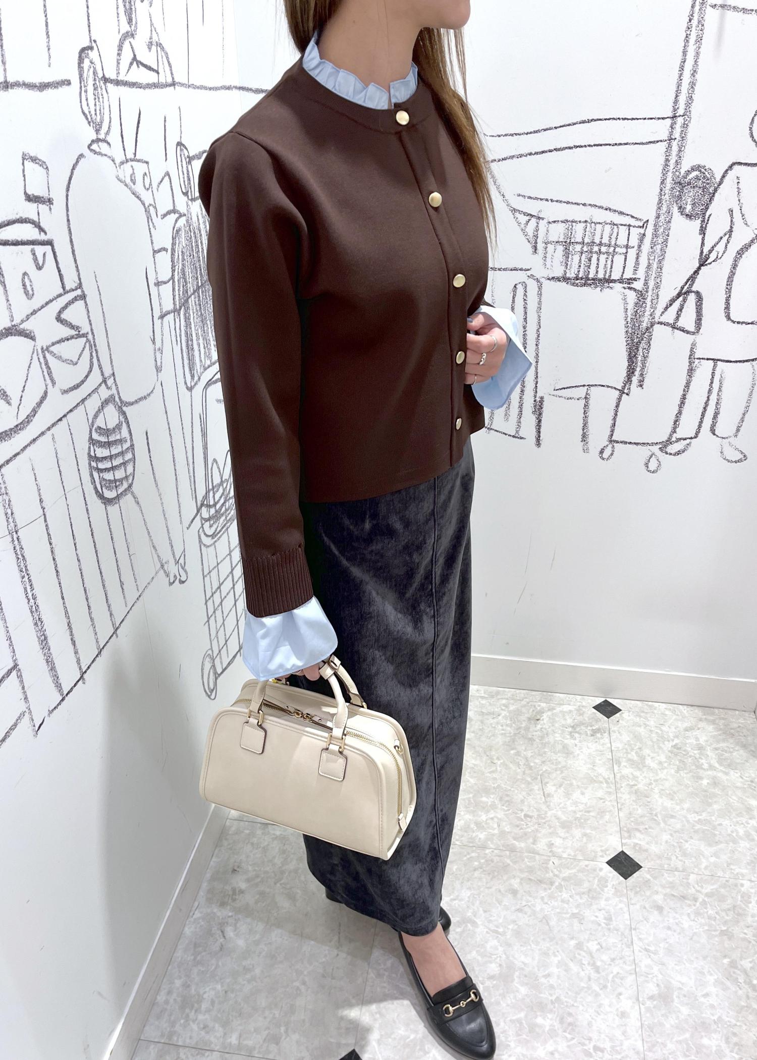 重ね着苦手でも、レイヤードスタイルに見えて可愛いカーディガンにIラインスカートを合わせた、すっきりとしたキレイめカジュアルなスタイル。オフィスカジュアルなどでも着れます。楽な着心地でおしゃれに見えるコーデ。春まで使えるコーデです。