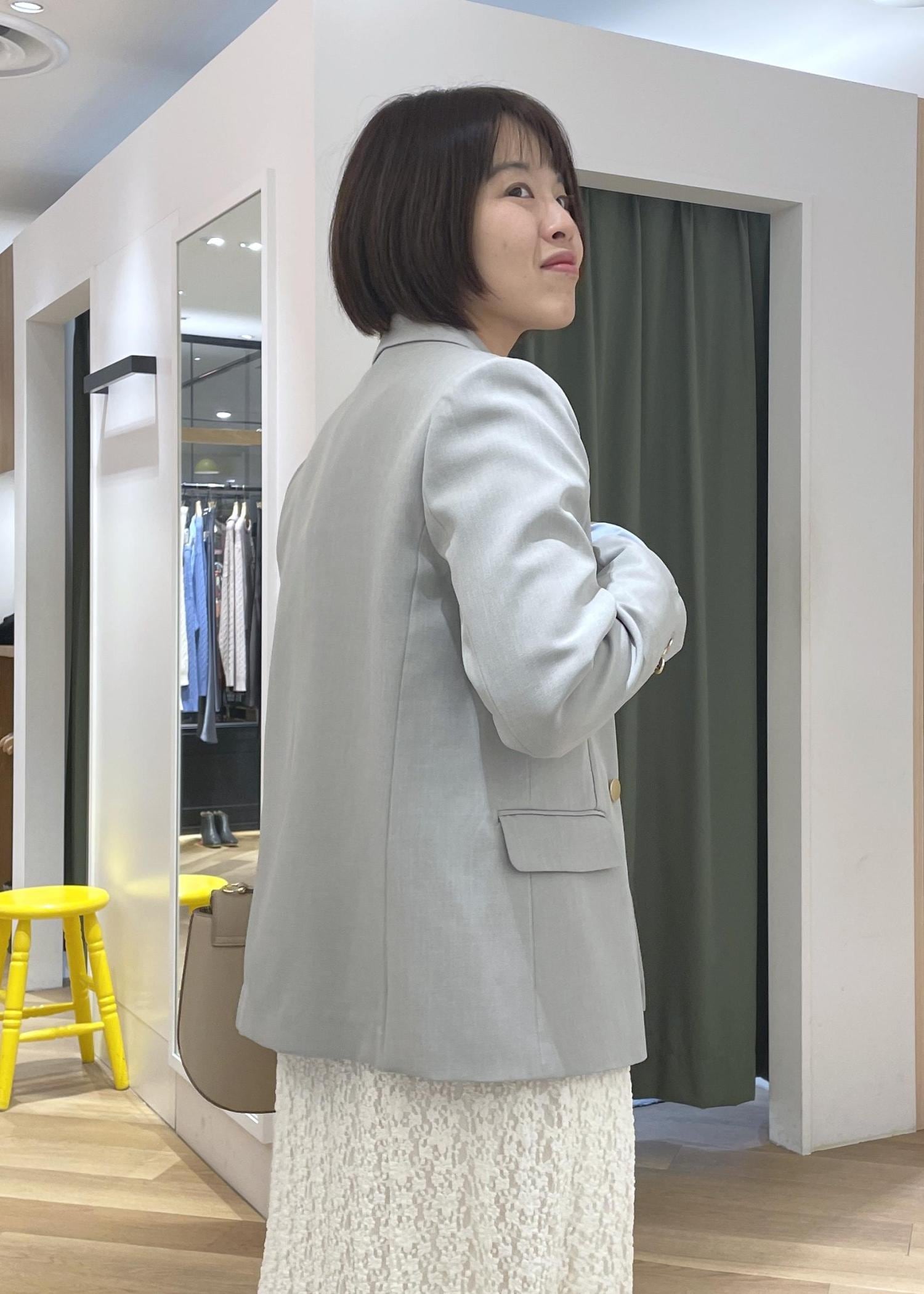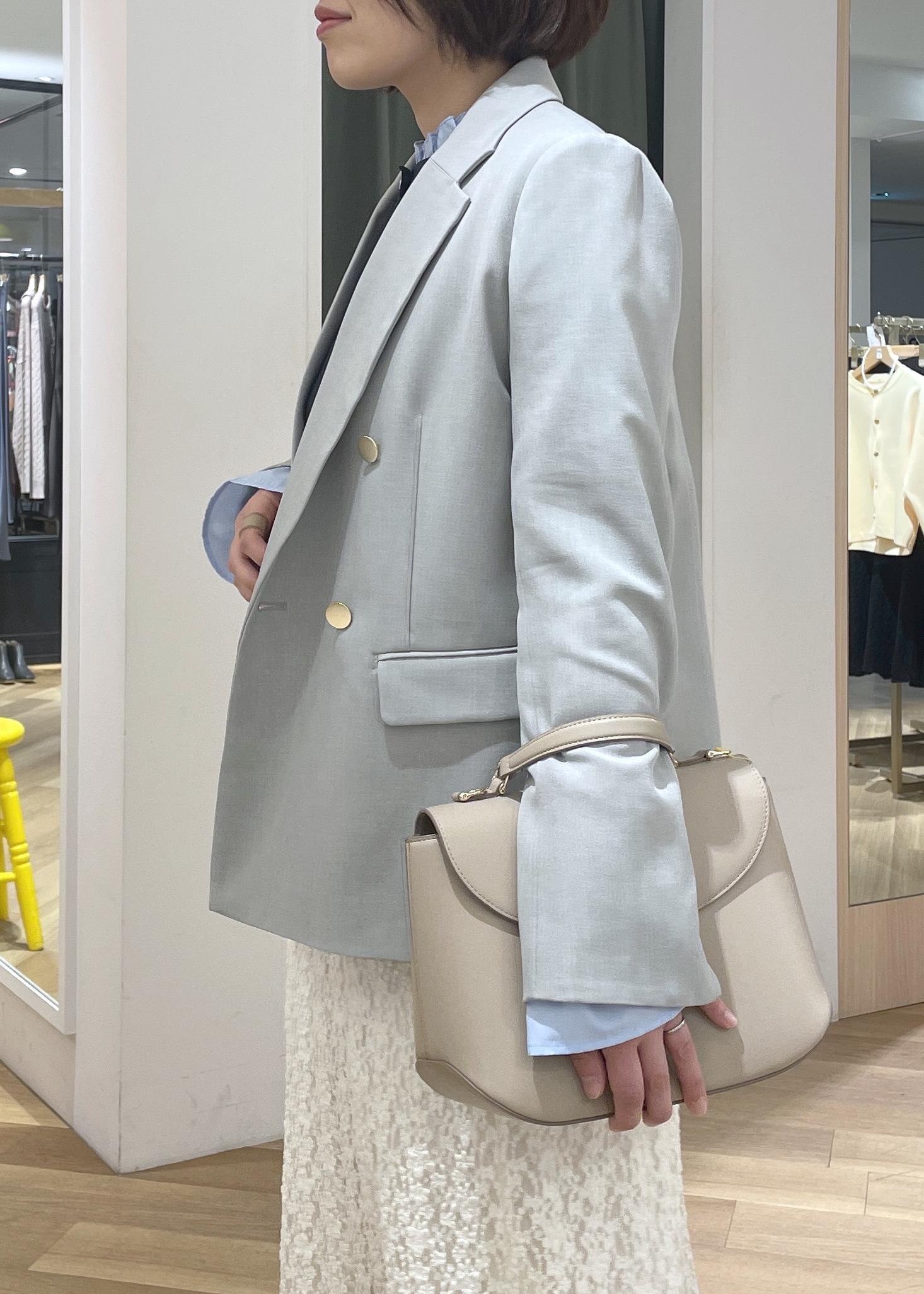 淡いカラーのコーデだったので、ジャケットのインナーにはネイビーのカーディガンを合わせてメリハリのあるコーデに◎
