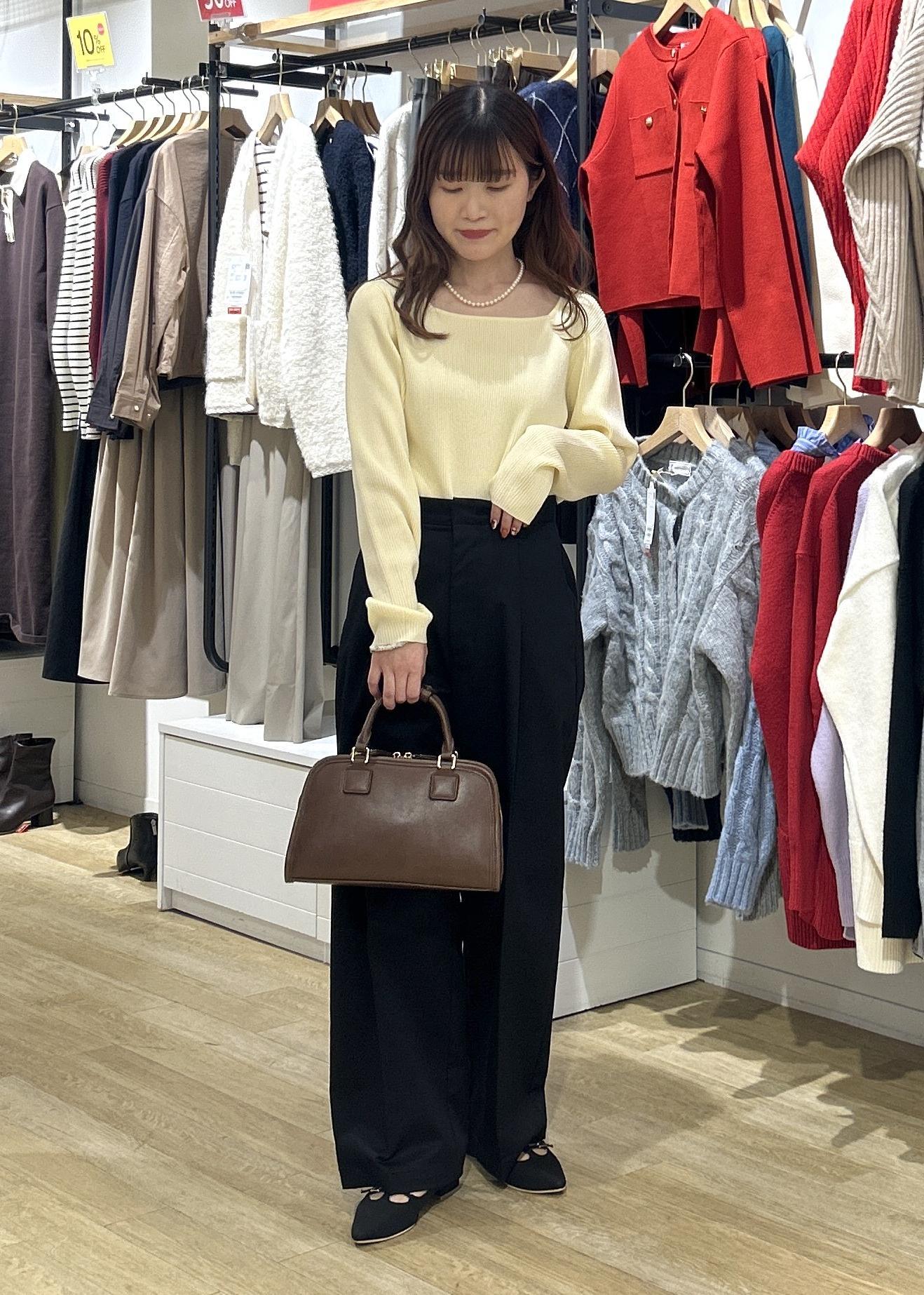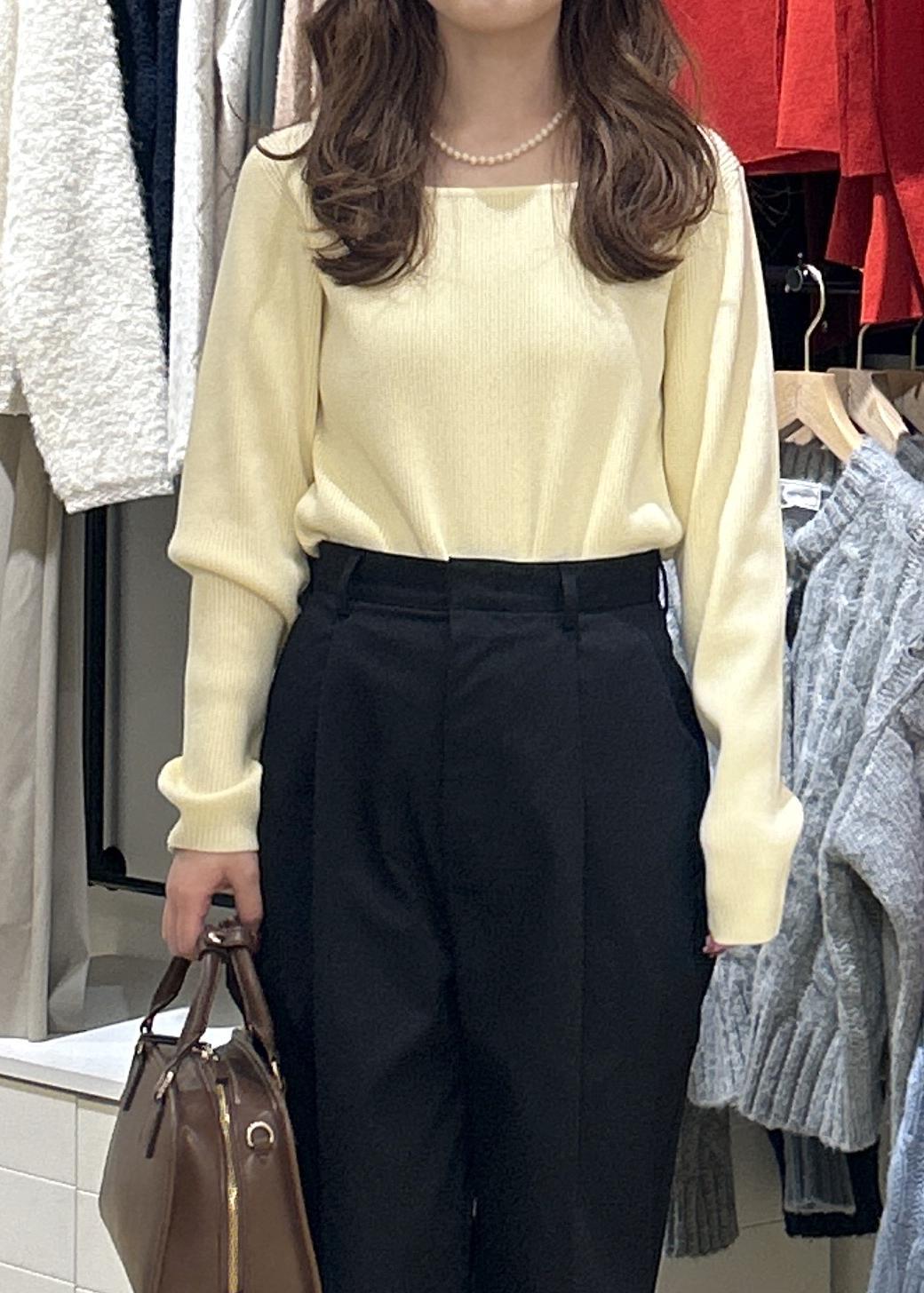 イエローのスクエアニットとネイビーパンツを合わせたカジュアルなコーディネートにしました。
