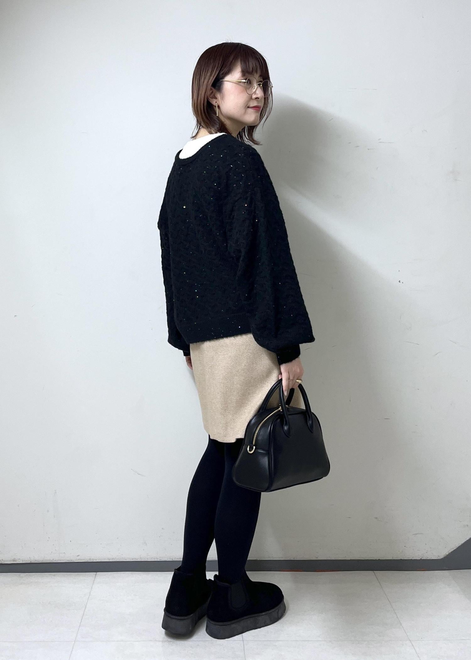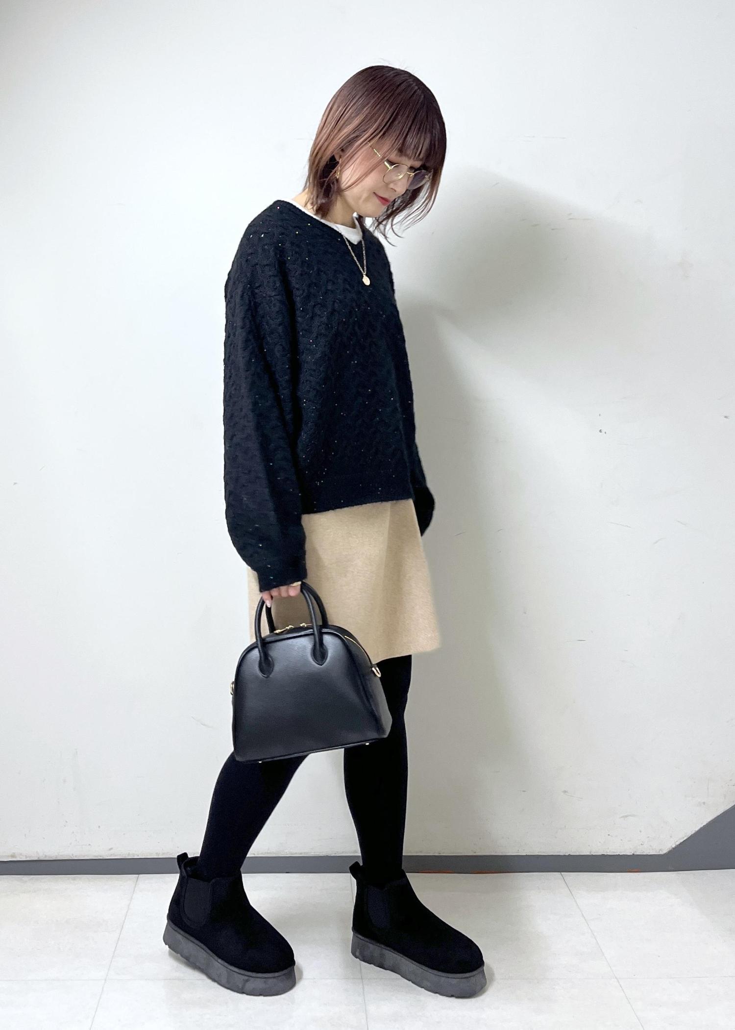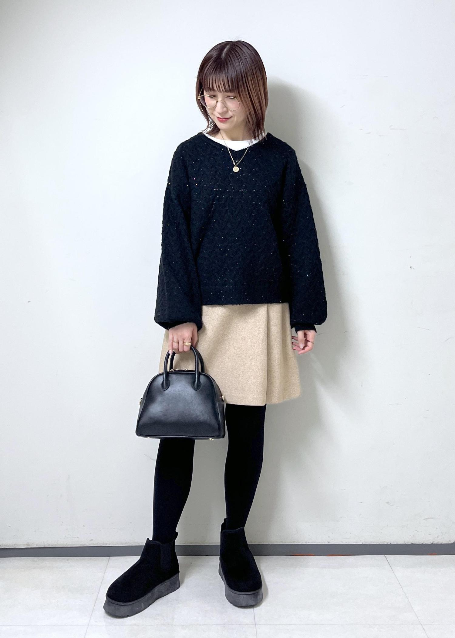 膝上スカートは可愛い印象ですが、ニットと小物を黒にして落ち着いた印象もプラスしました!