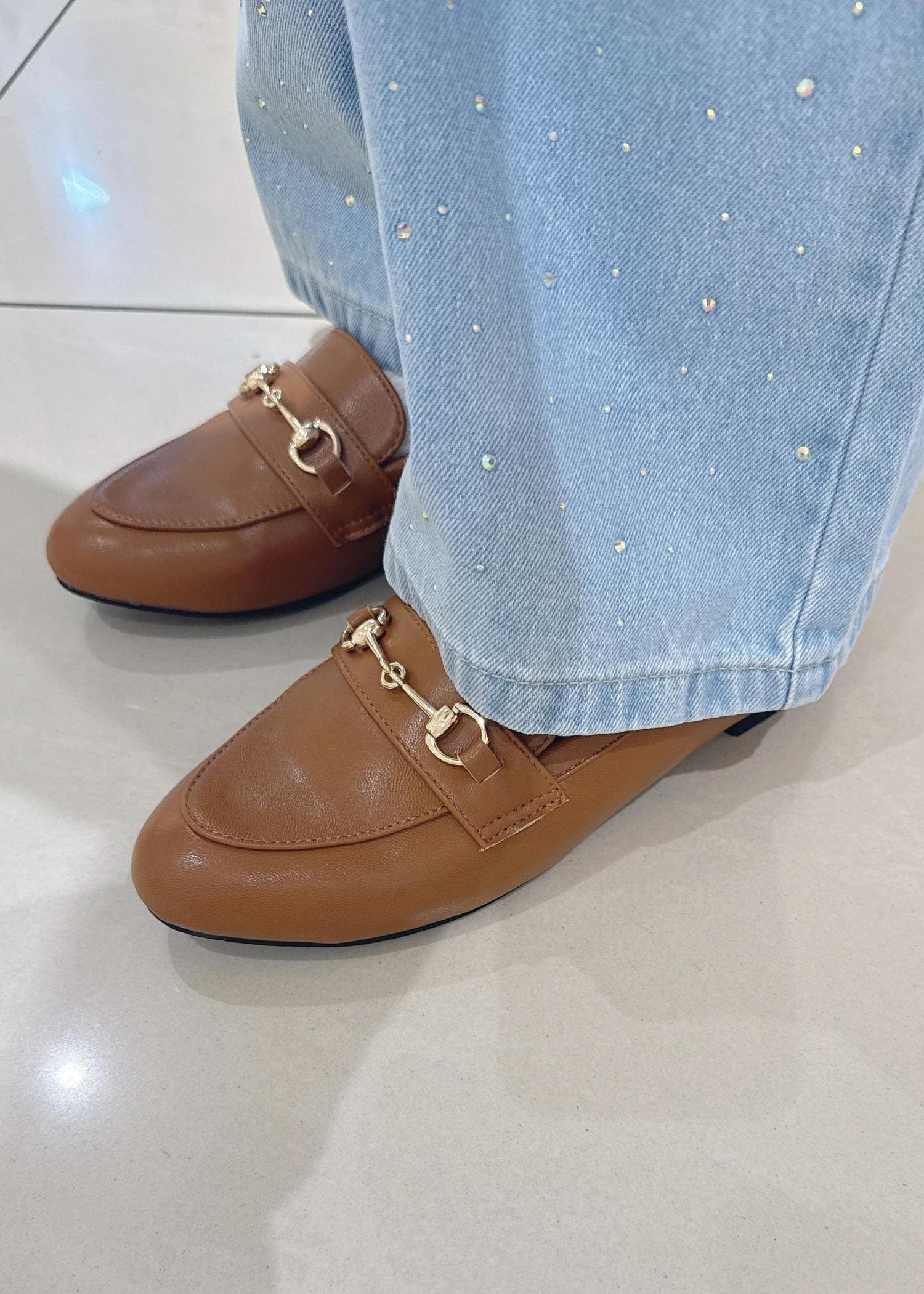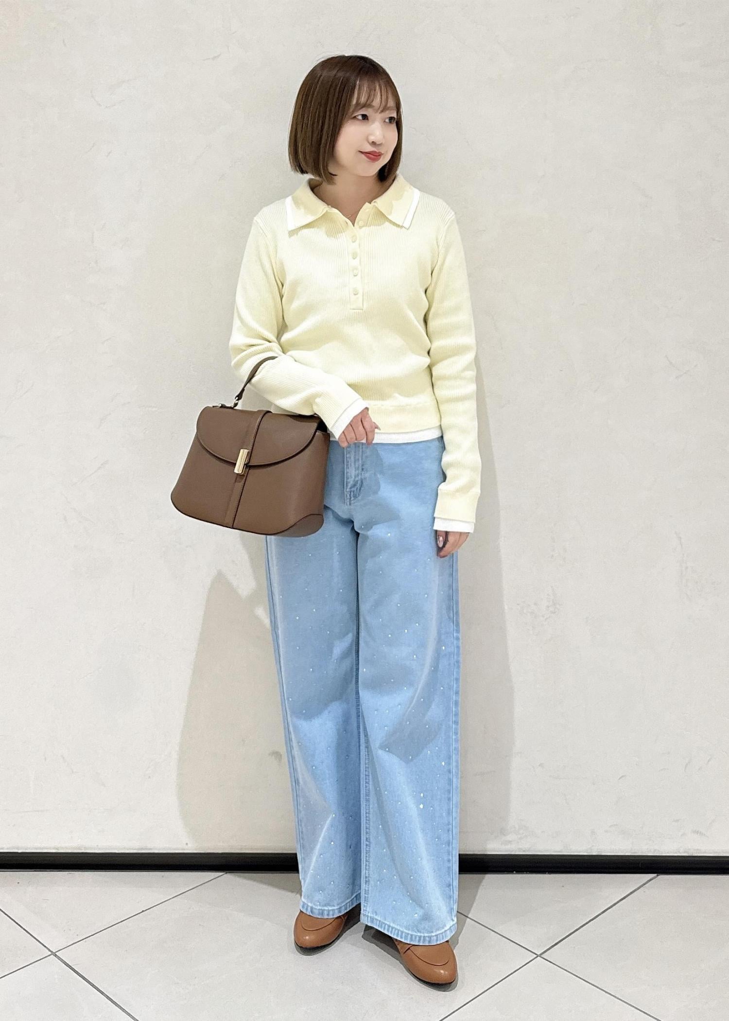 イエローのトップスにビジューデニムを合わせました。