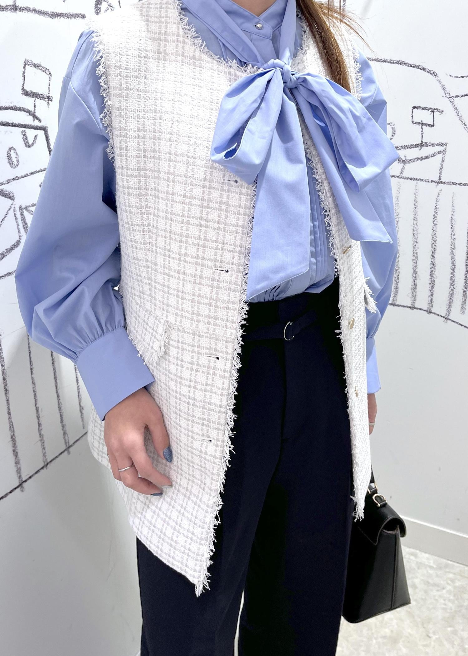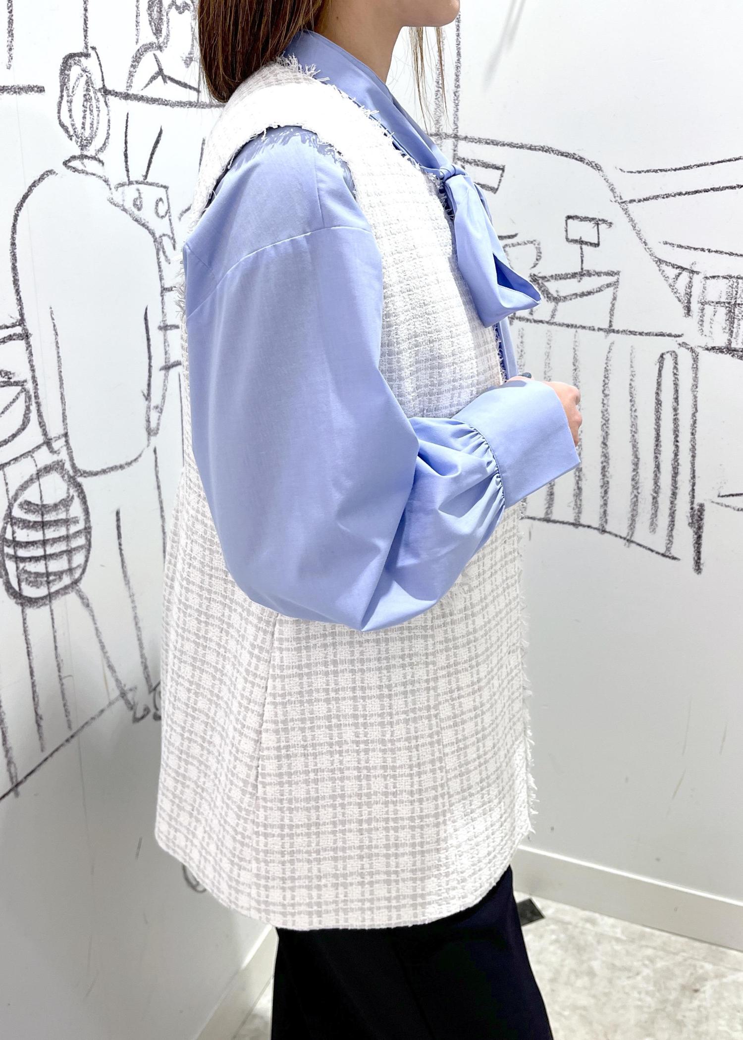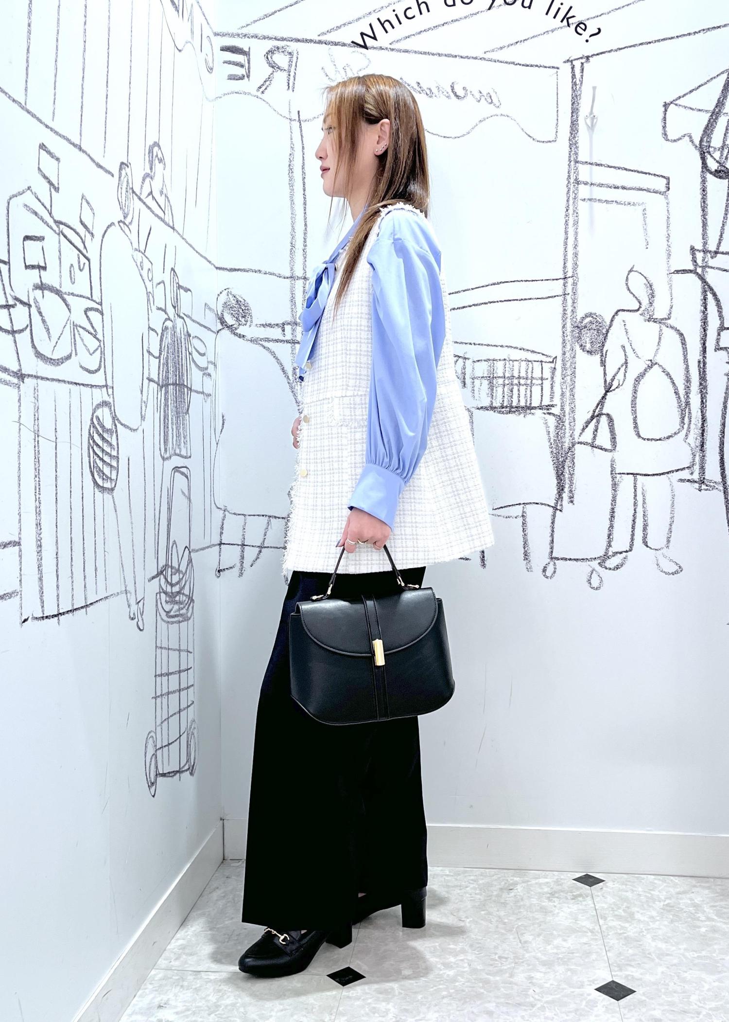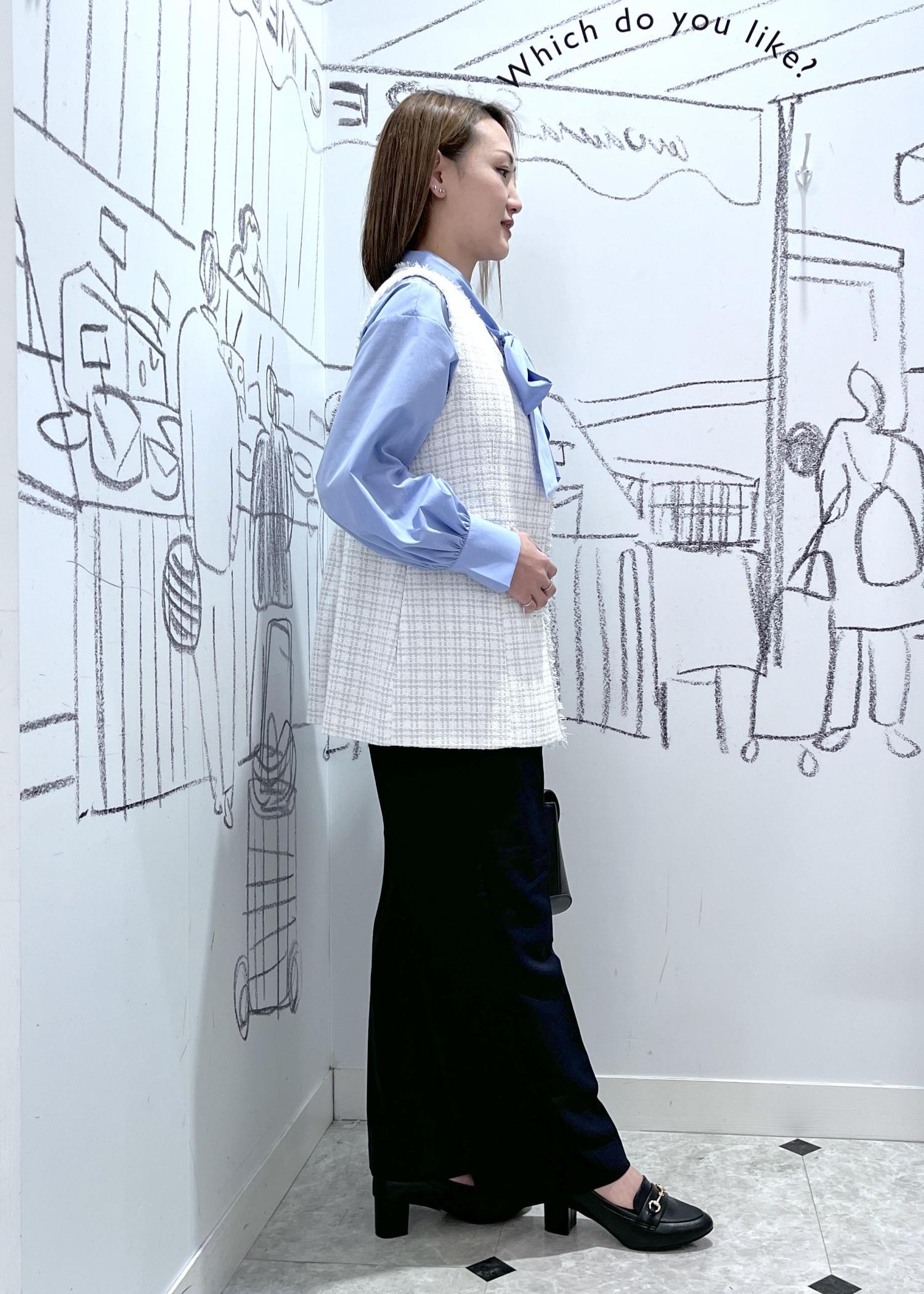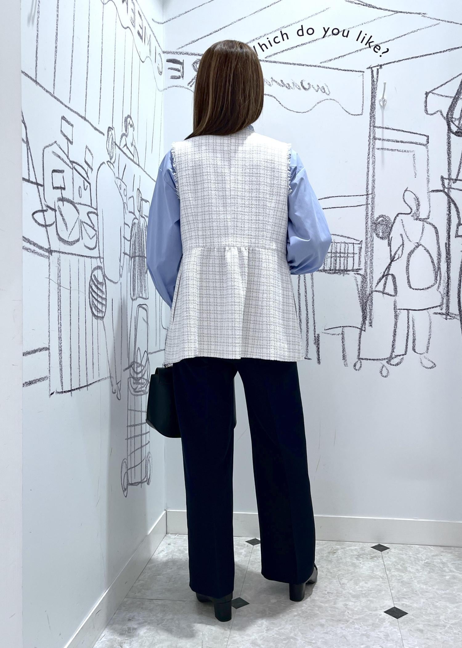 スタイリッシュなママにおすすめ。ツイードジレのセレモニーコーデです。ジレにボリュームのあるリボンブラウスを合わせたので前をあけてウエストラインを高めてスタイルアップに見えるようにしてます。リボンが華やかなので、ブローチやアクセはつけませんでしたが、胸元にコサージュやブローチをつけてもより華やかに。後ろ姿もペプラムですっきりとヒップラインもカバーできます。入学卒業・入園卒園におすすめのコーデです。