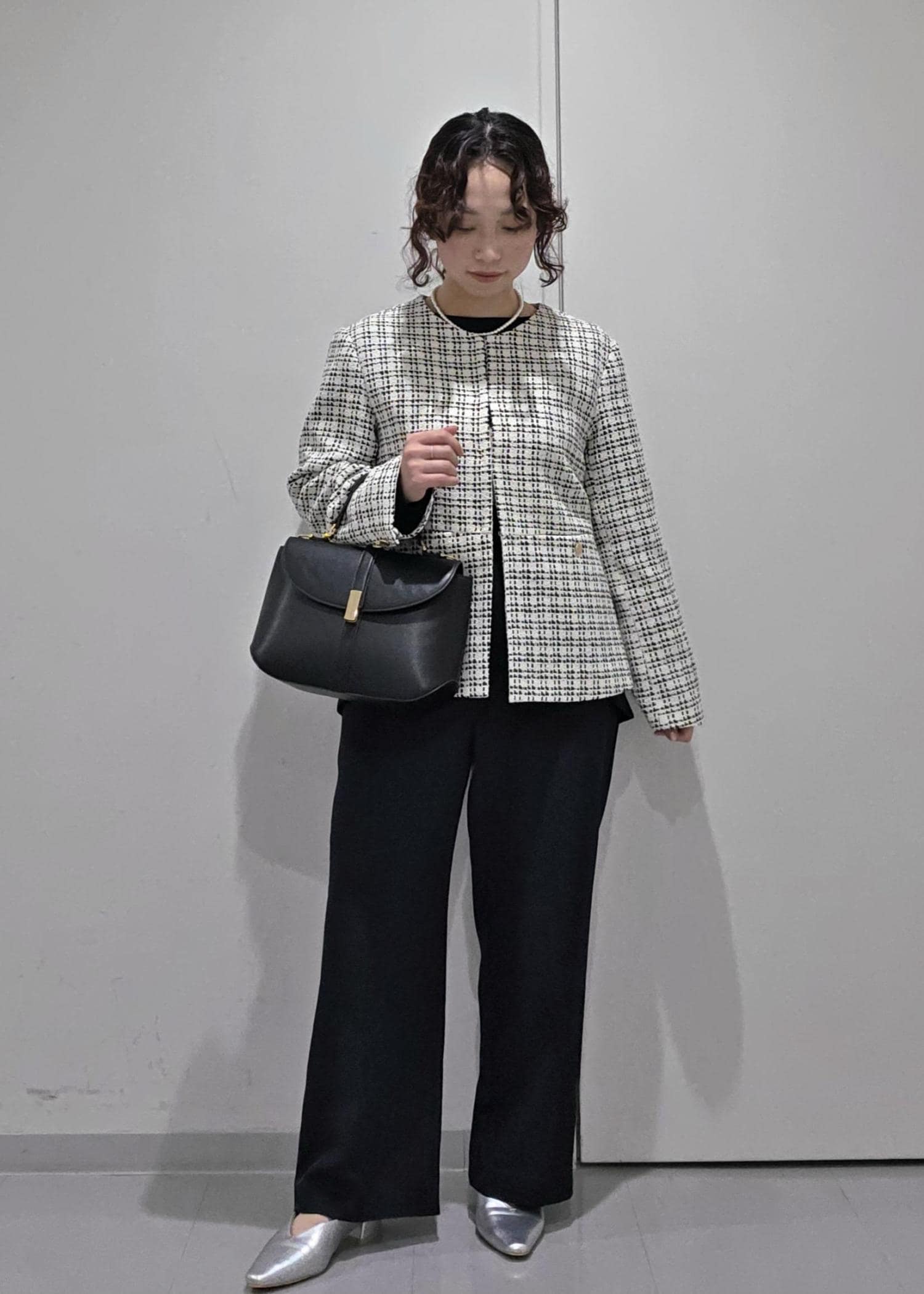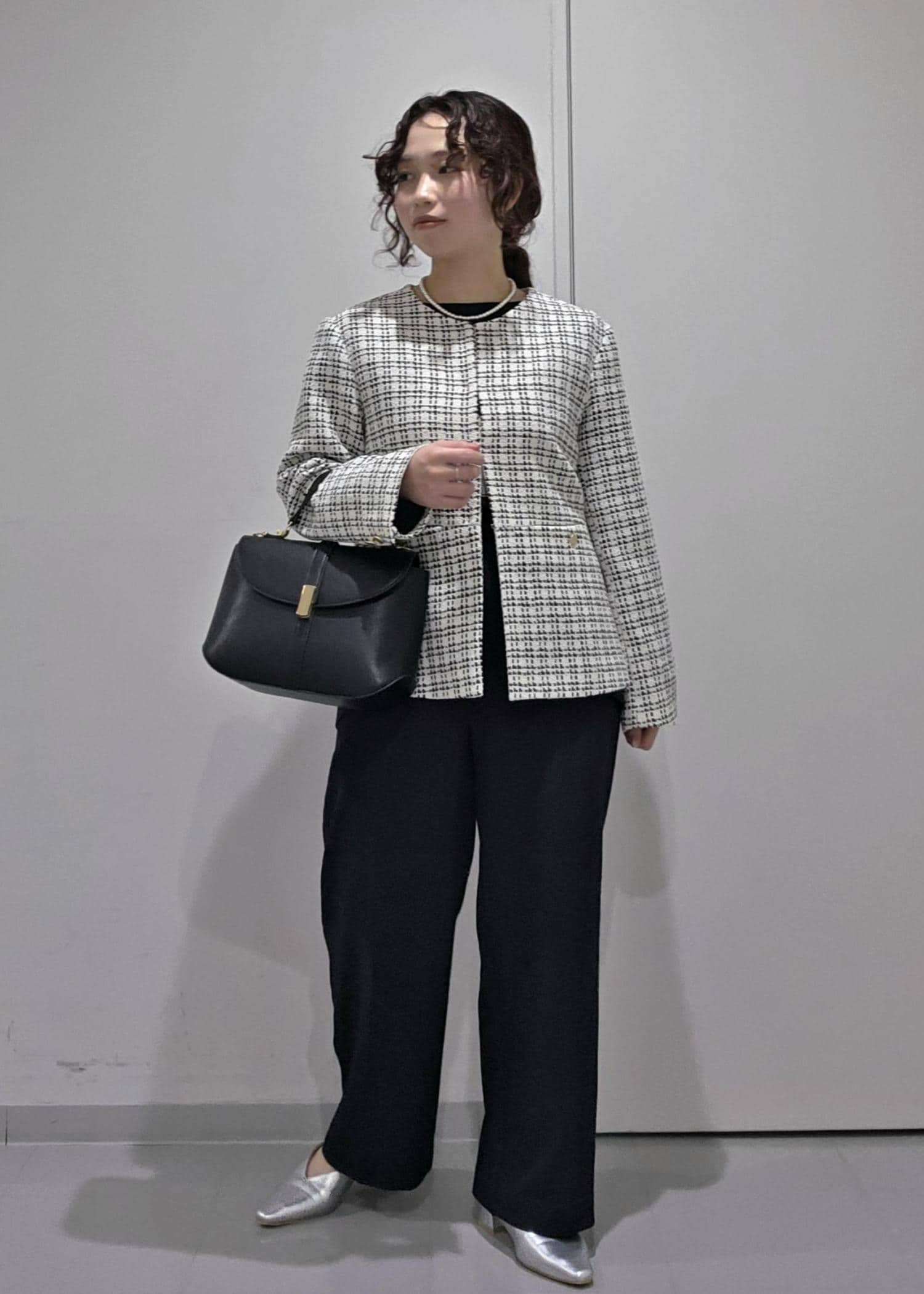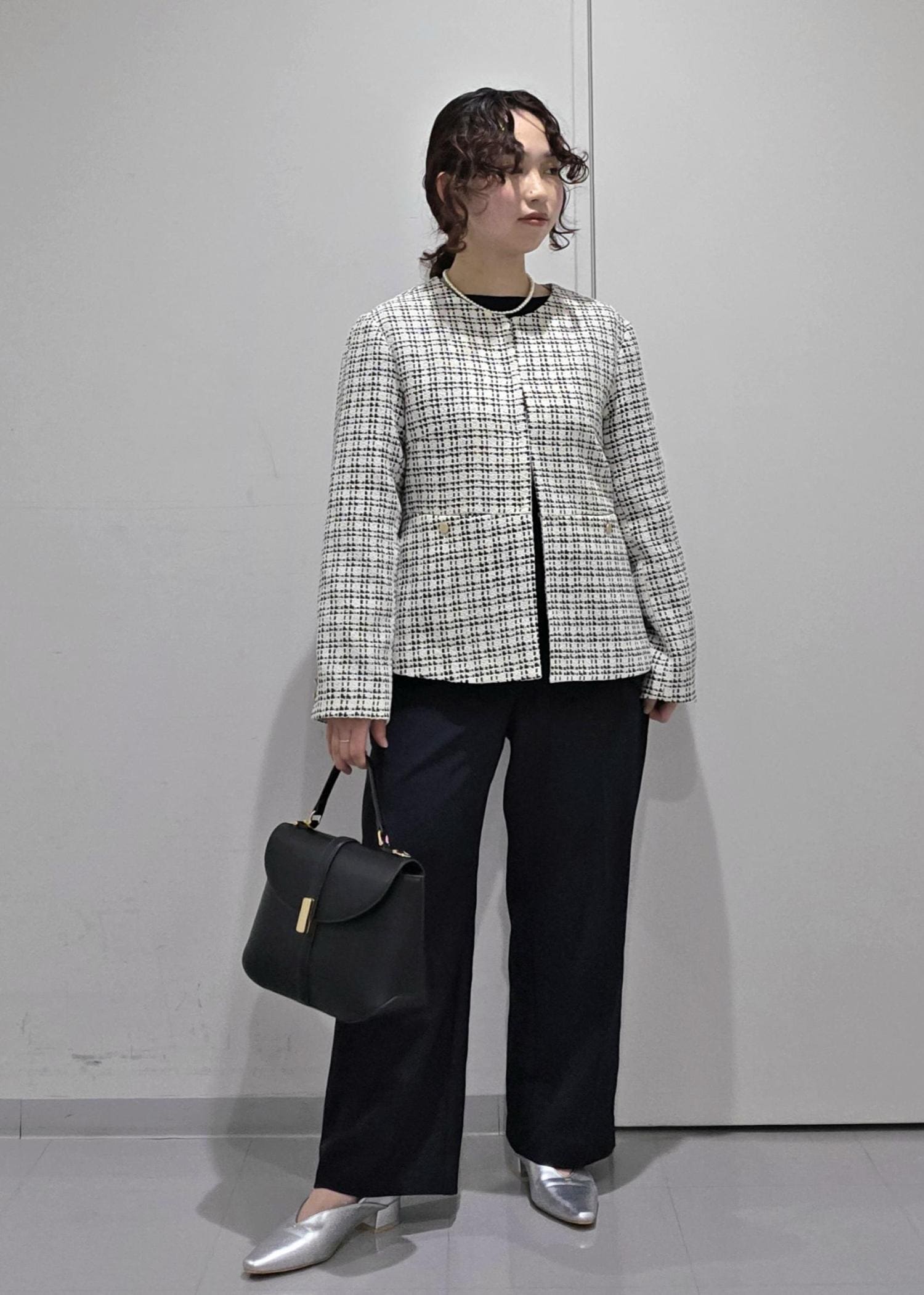 セットアップのジャケットスタイルではなく、ツイードジャケットを合わせることで華やかな場面にもぴったり◎