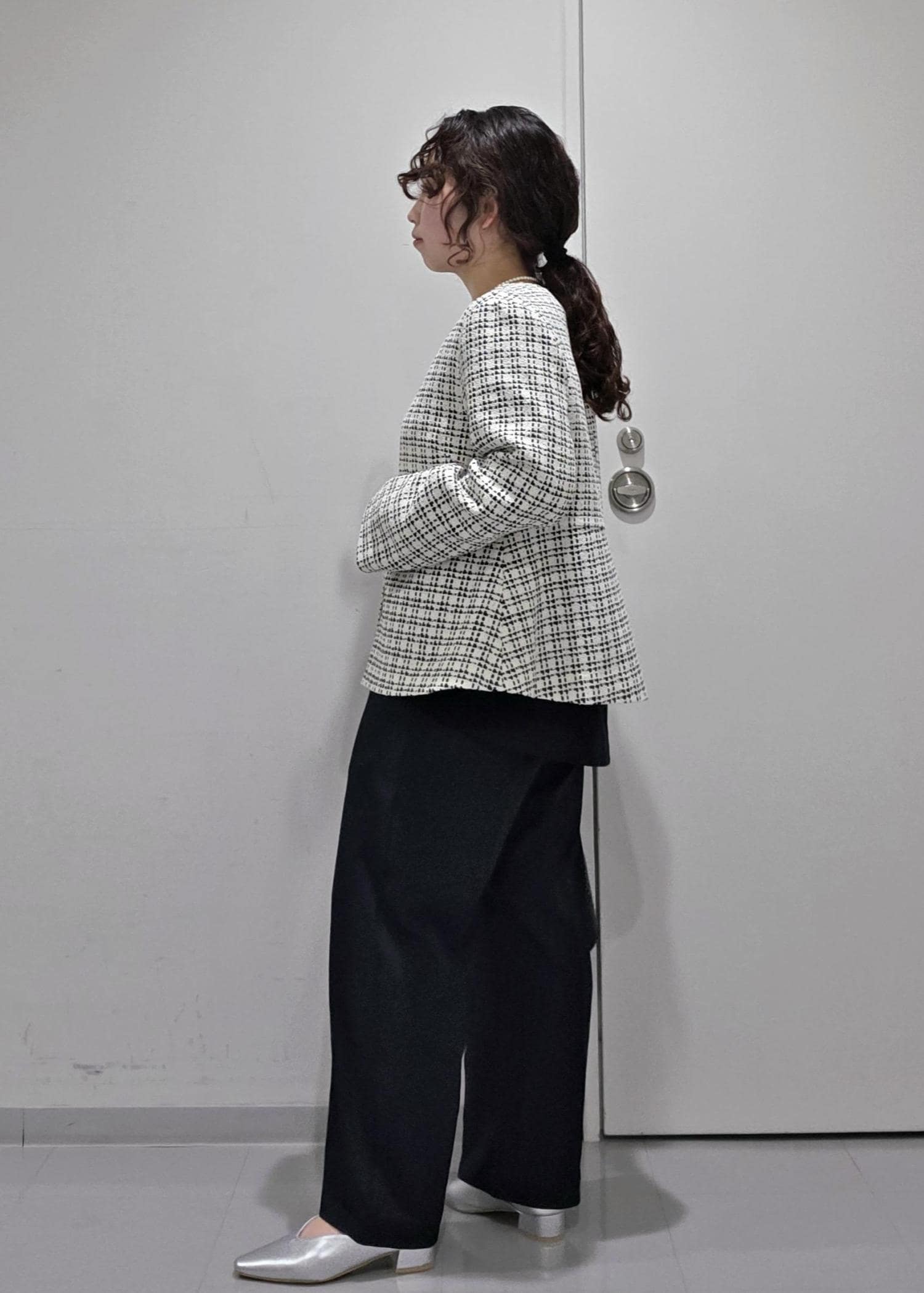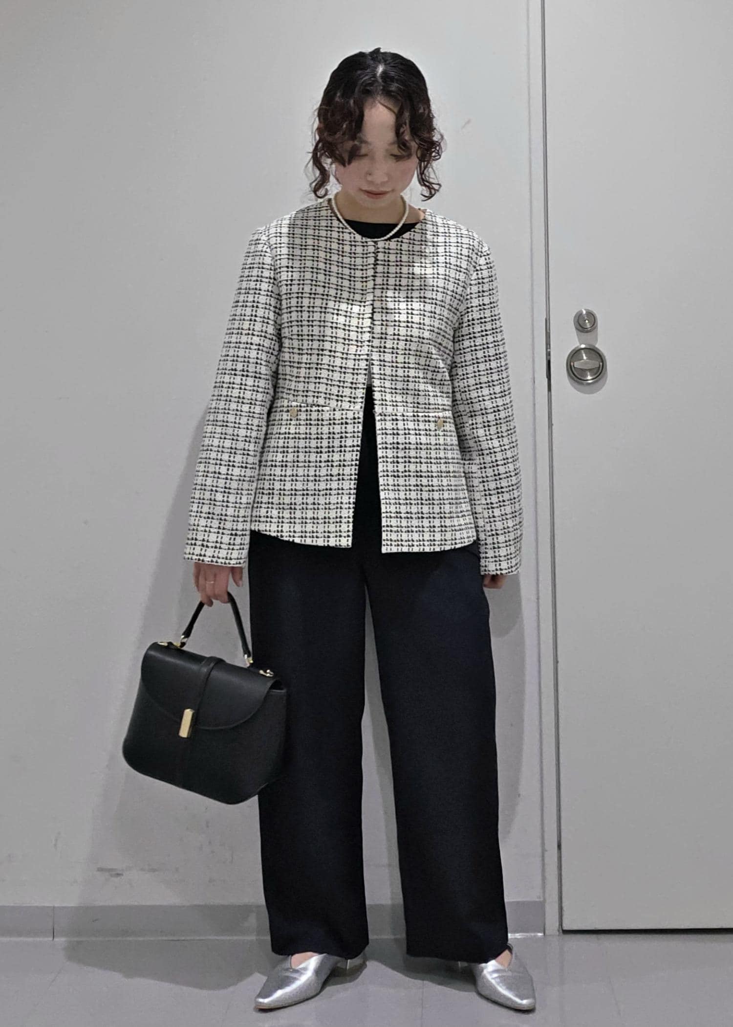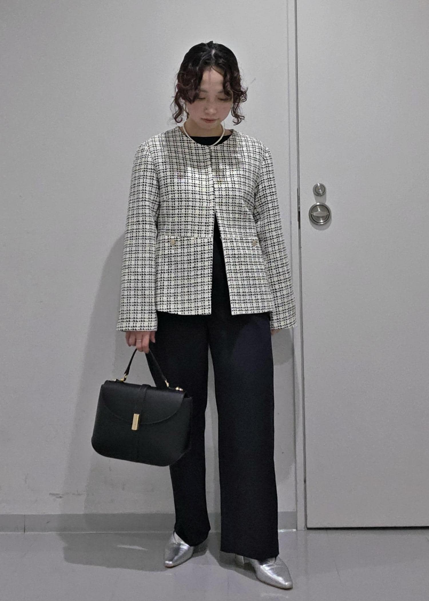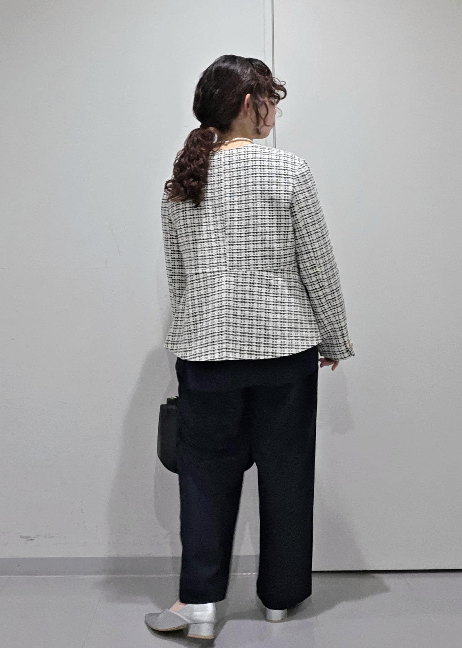 セットアップのジャケットスタイルではなく、ツイードジャケットを合わせることで華やかな場面にもぴったり◎