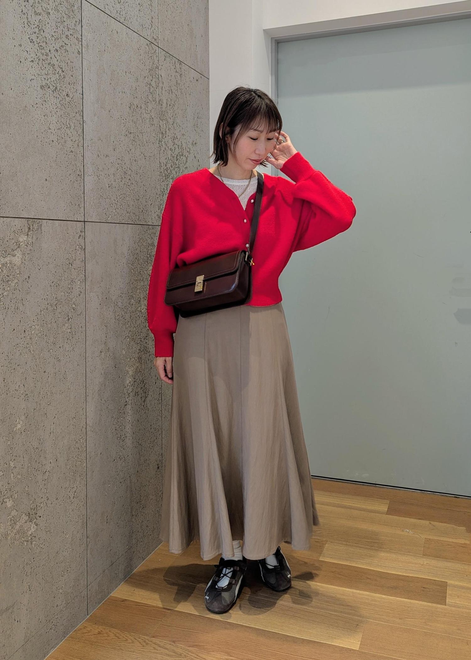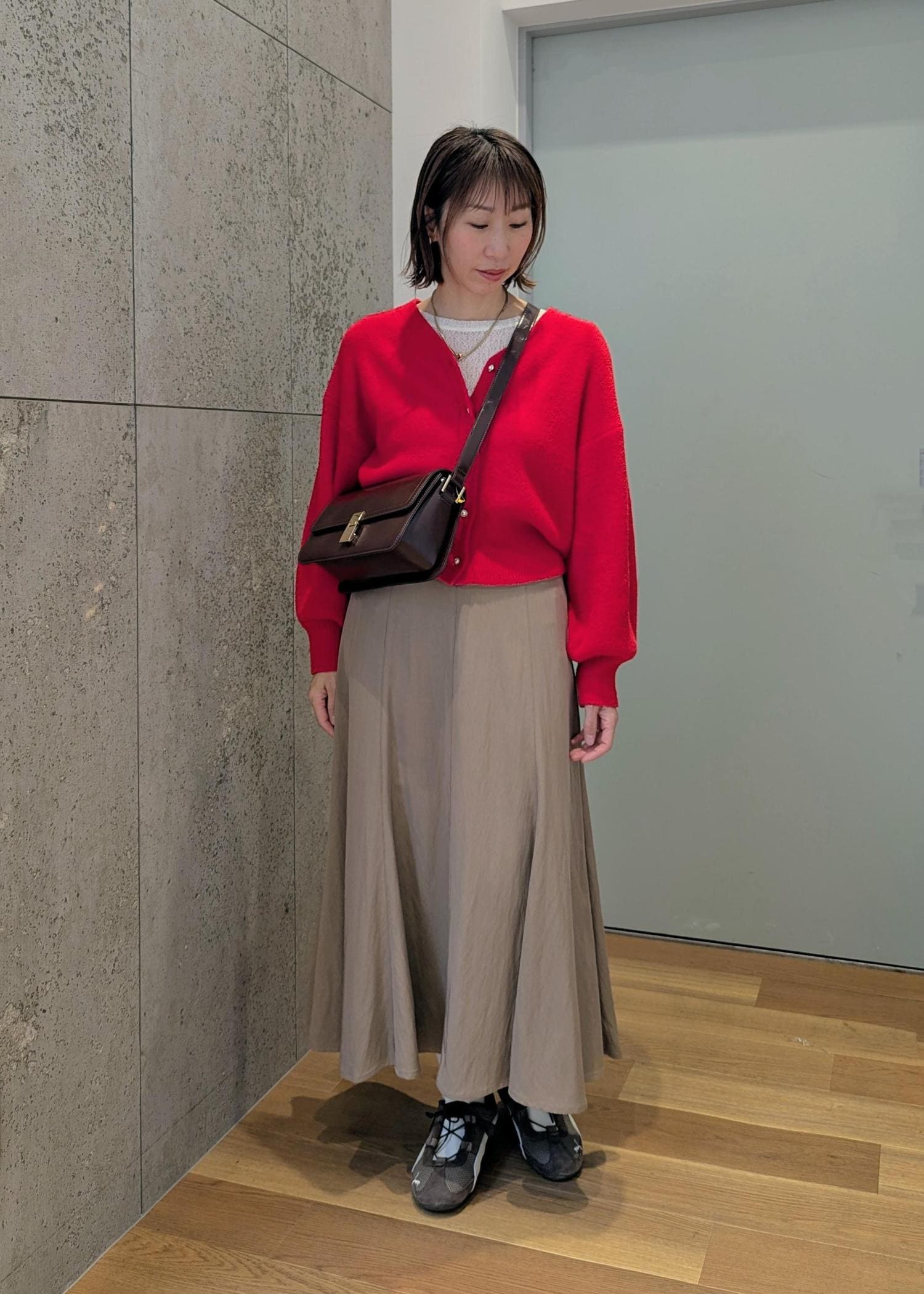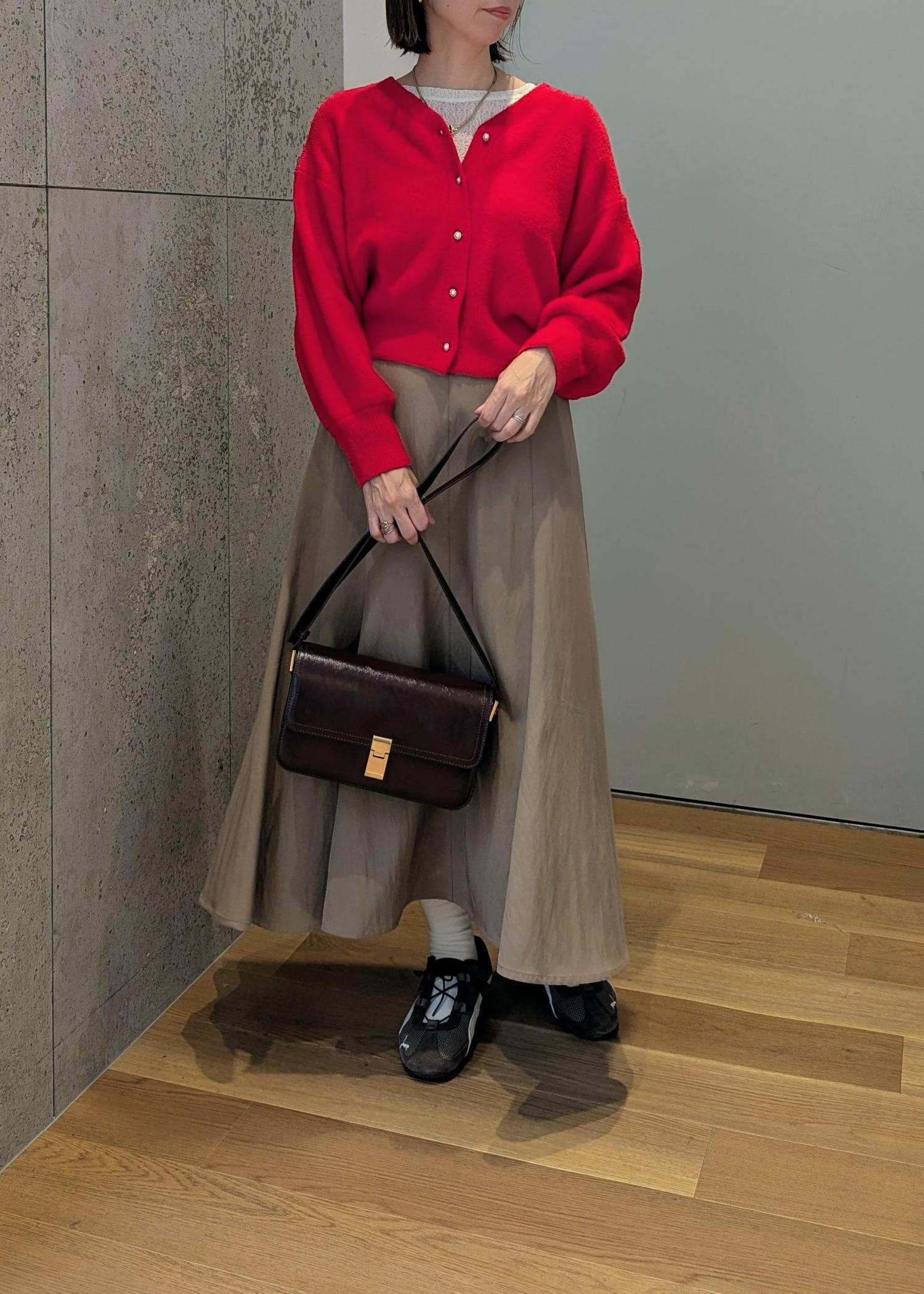 コーデのポイントになる赤カーデは、ベージュボトムやブラウン小物など優しい色で合わせるとかわいいです!フェミニンコーデはスニーカーでカジュアルに外すのもオススメです。