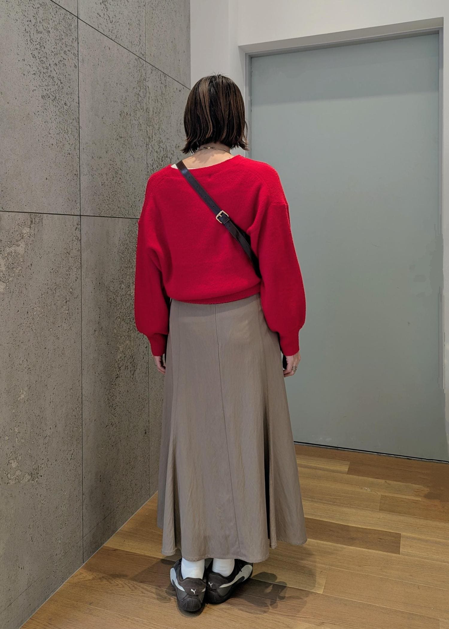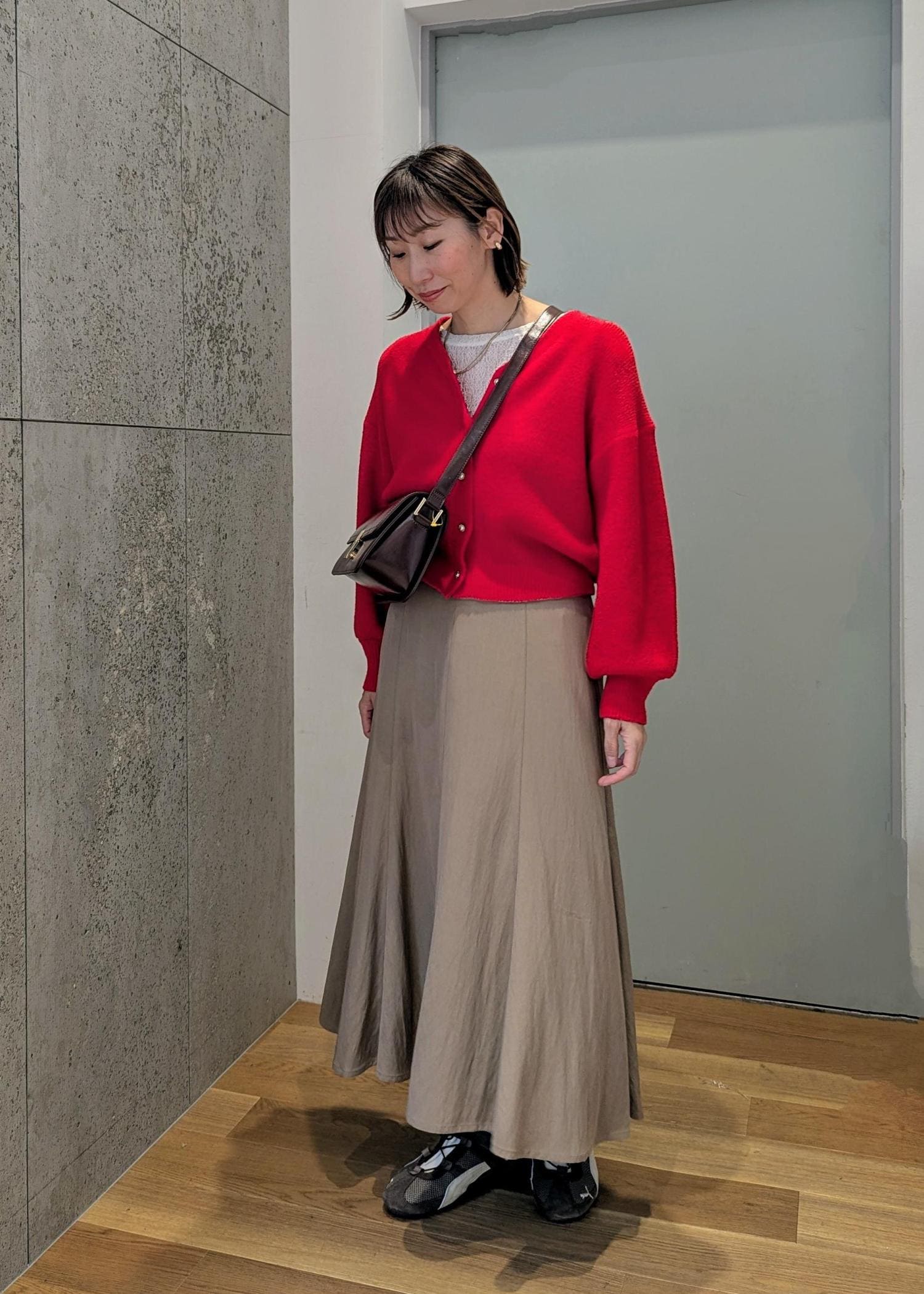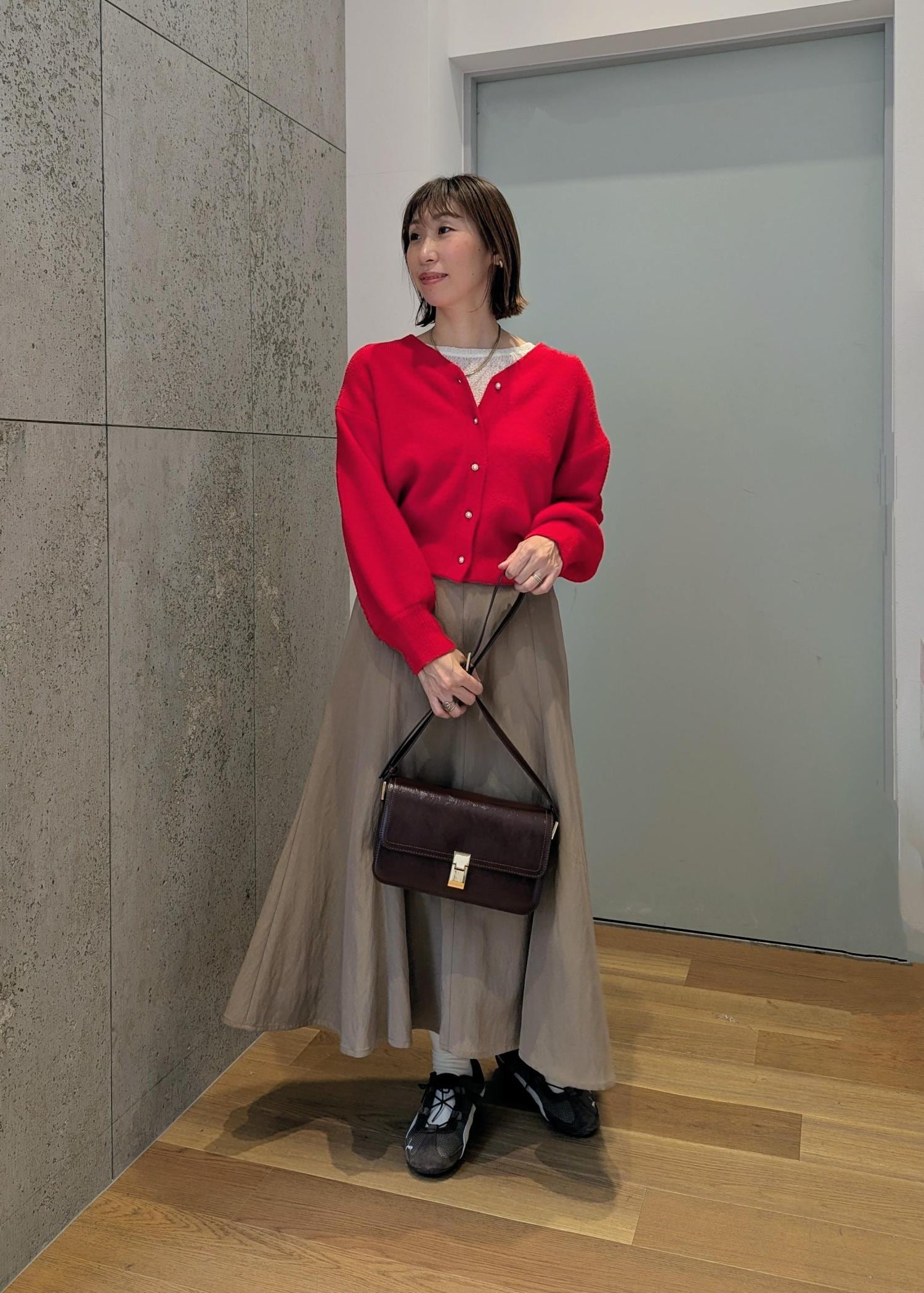 コーデのポイントになる赤カーデは、ベージュボトムやブラウン小物など優しい色で合わせるとかわいいです!フェミニンコーデはスニーカーでカジュアルに外すのもオススメです。