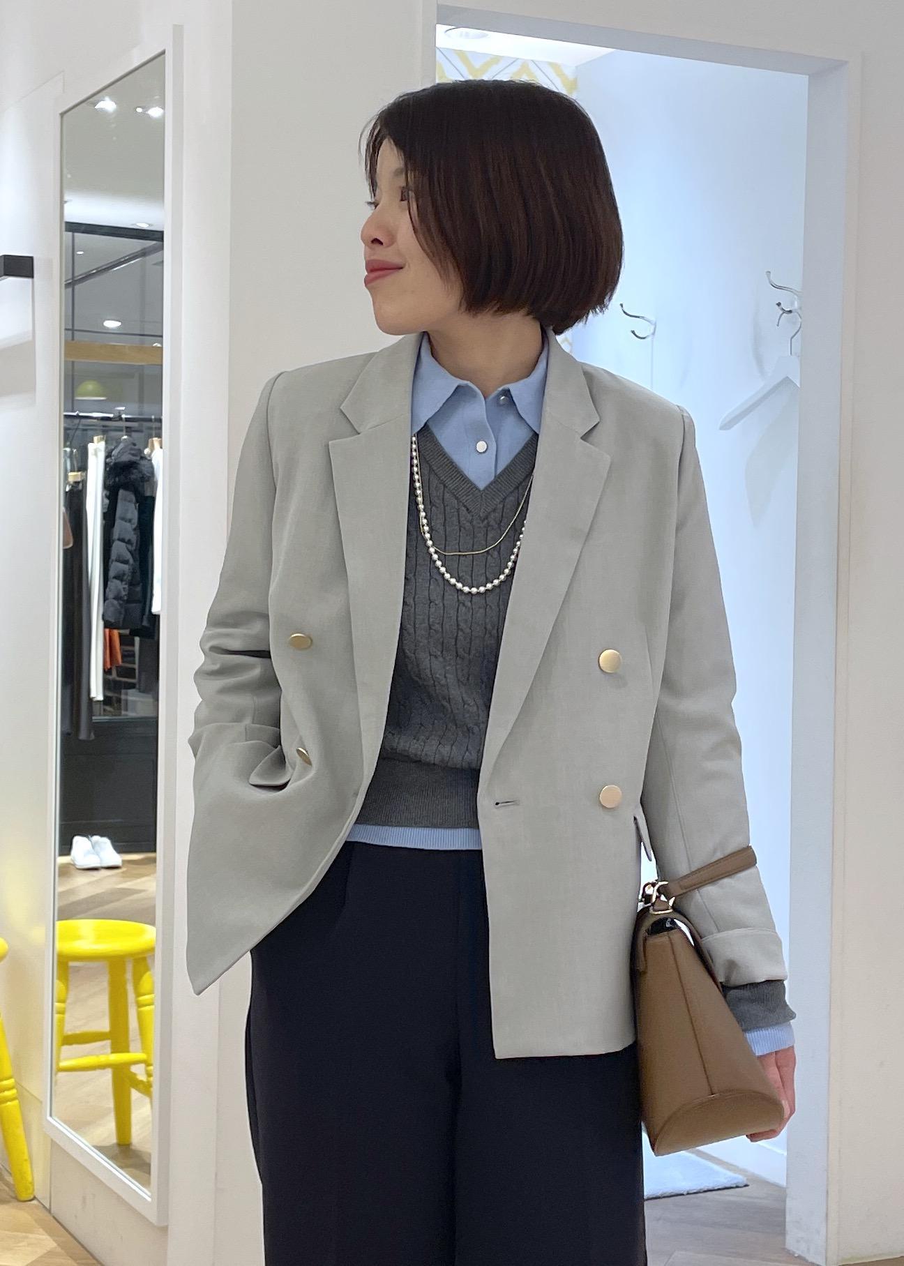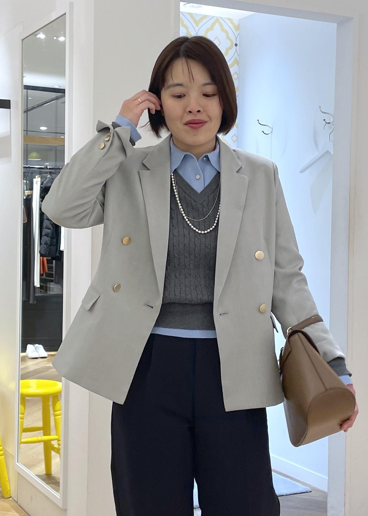 爽やかなライトグリーンのジャケットにネイビーのワイドパンツを合わせたきれいめカジュアルコーデです!