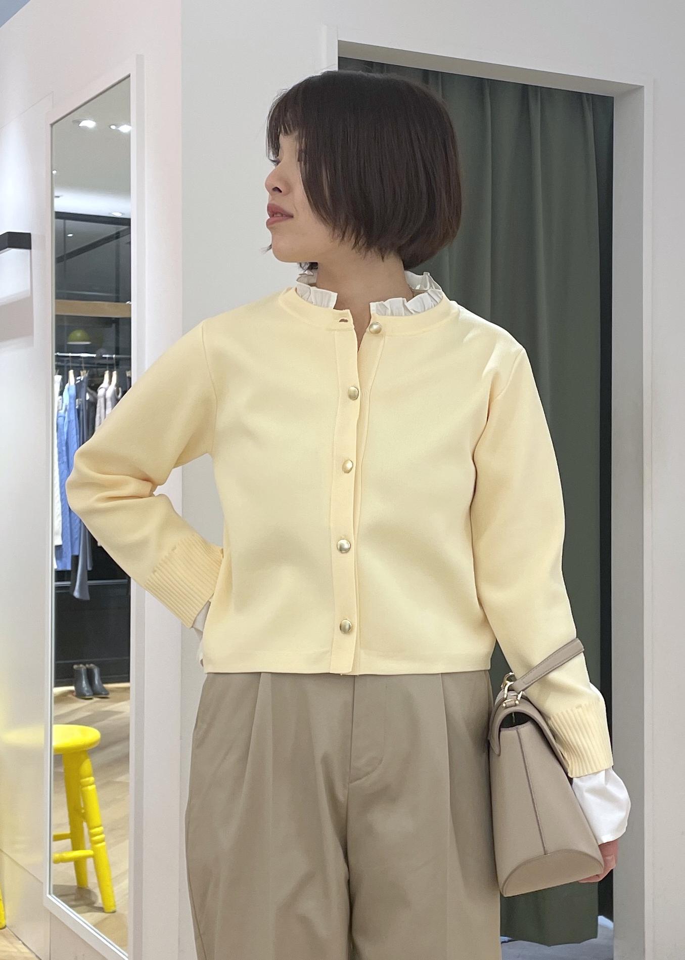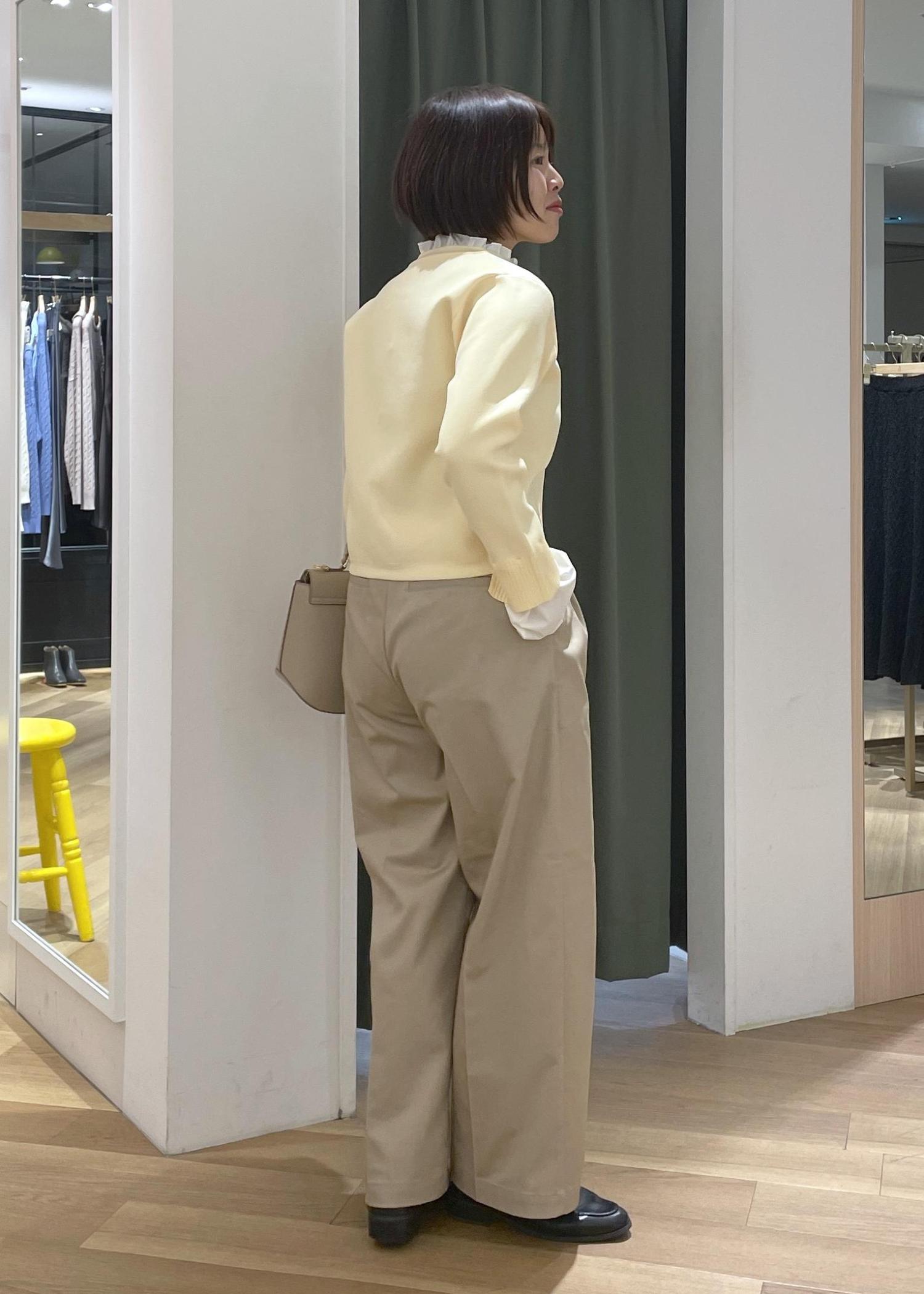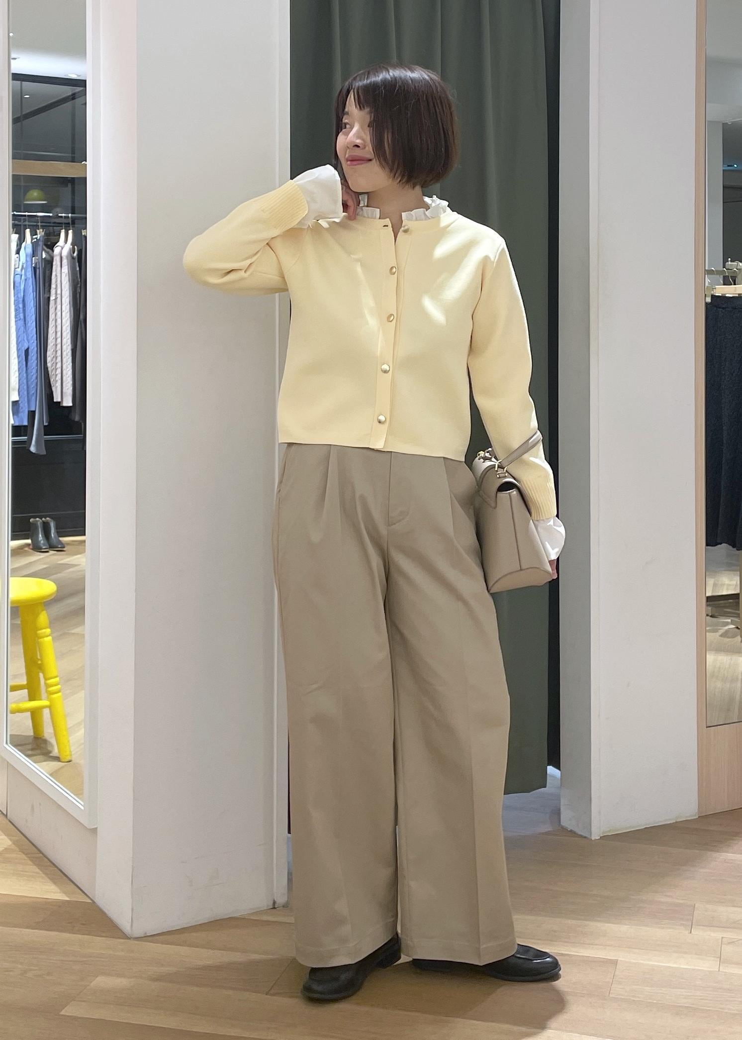 襟元のフリルがアクセントになるカーディガンにチノのワイドパンツを合わせた、程良く可愛さもある大人カジュアルコーデです!
