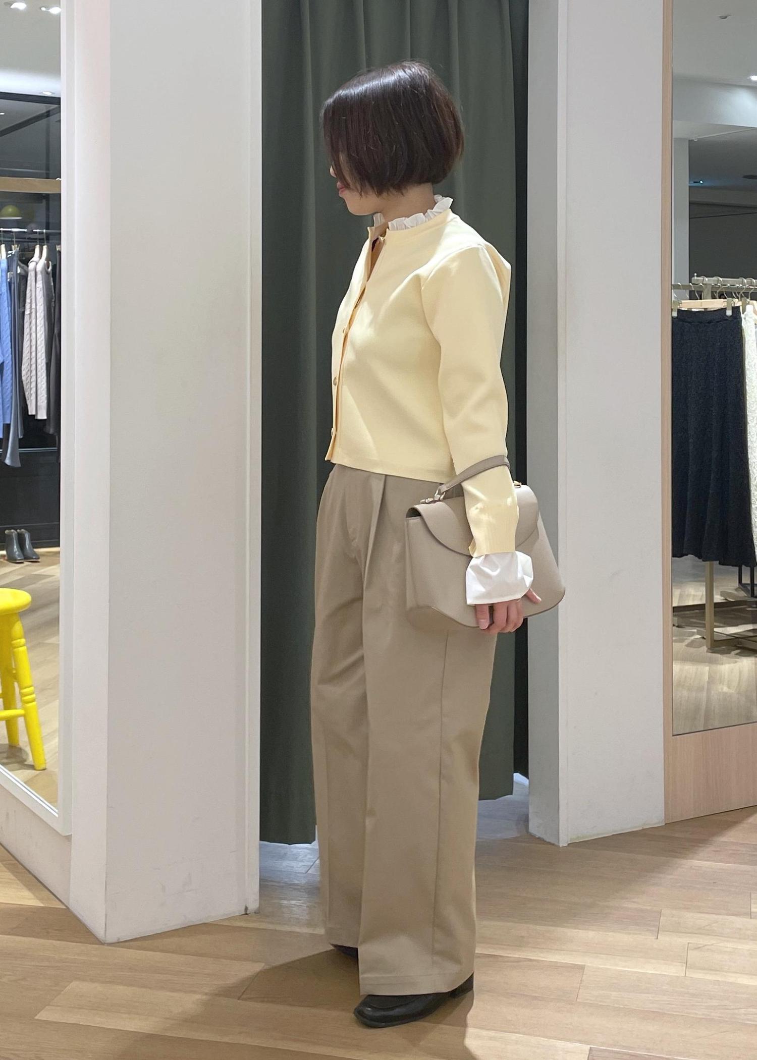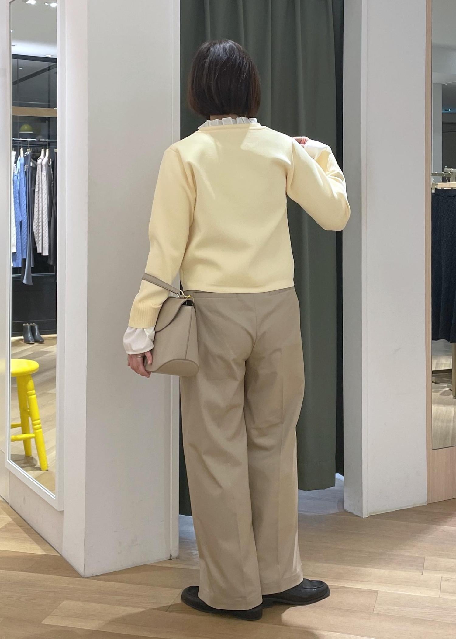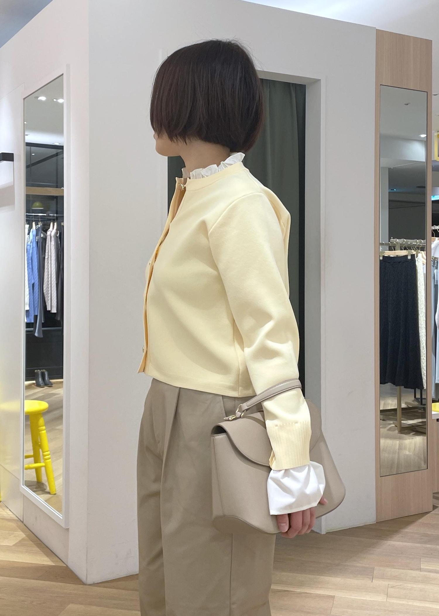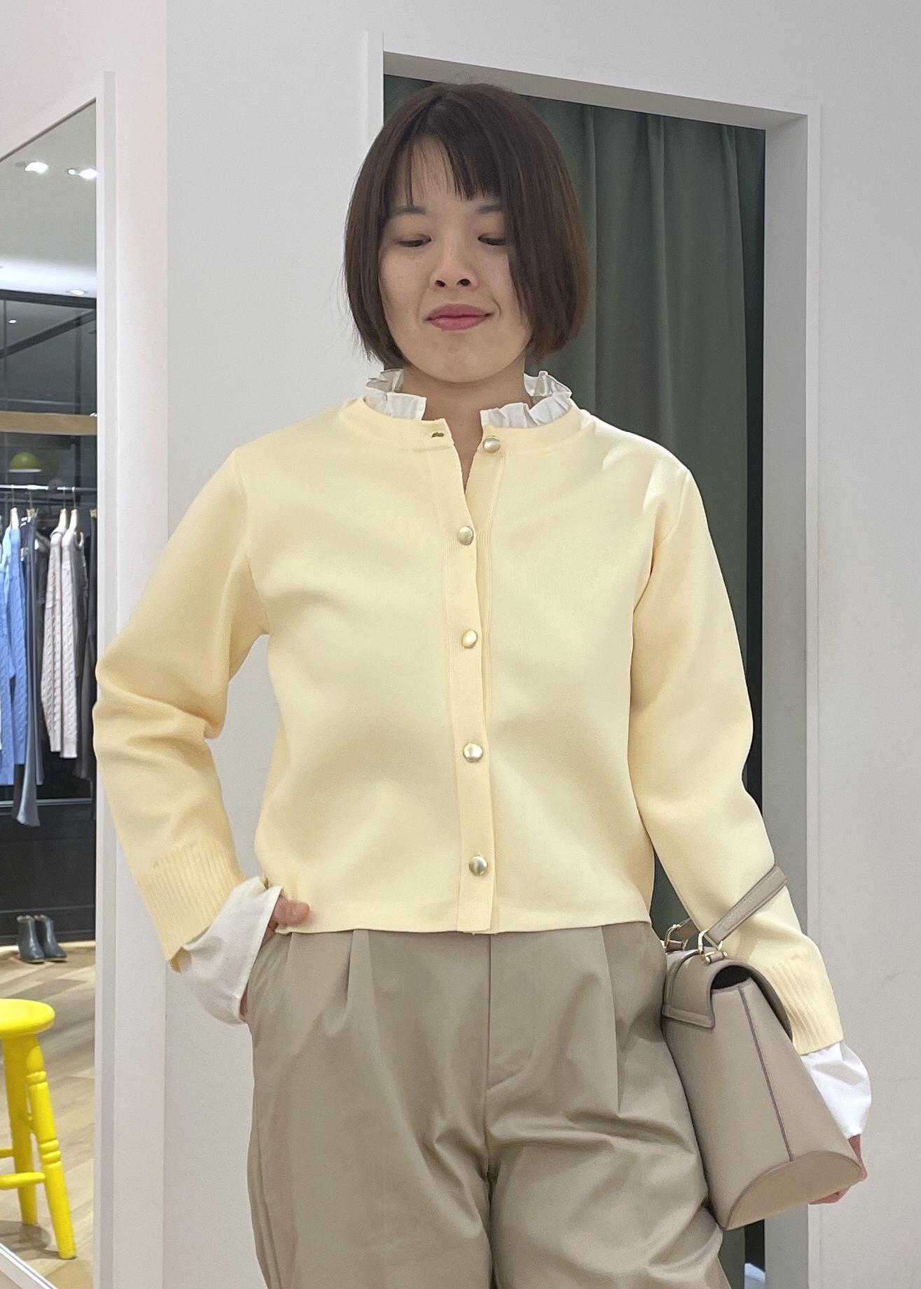 襟元のフリルがアクセントになるカーディガンにチノのワイドパンツを合わせた、程良く可愛さもある大人カジュアルコーデです!