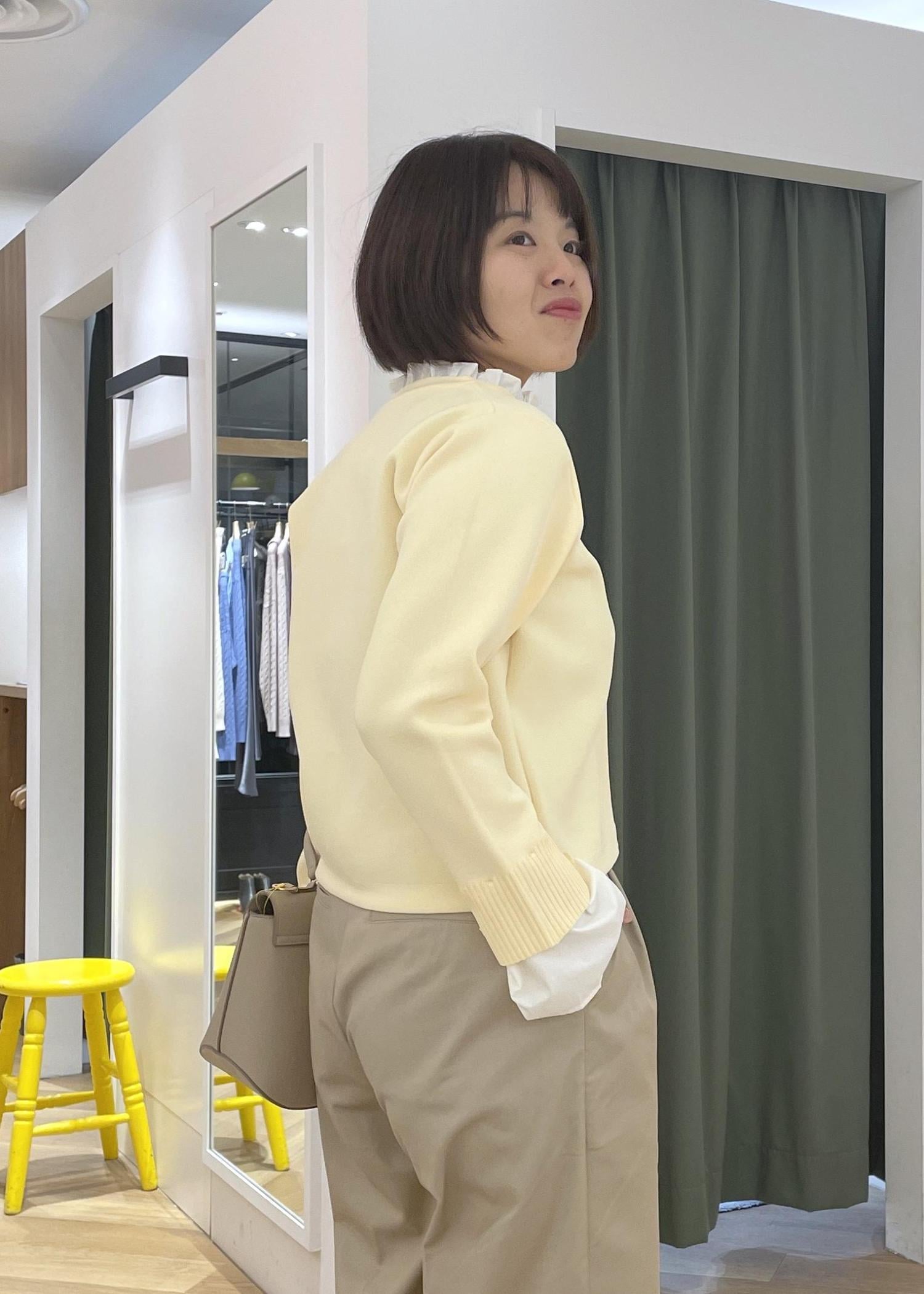 ROPÉ PICNIC襟フリルドッキングカーディガンクリーム / F¥5,995レビュー襟とお袖の布帛パーツがシャツをレイヤードしたようなデザインで、1枚でおしゃれ見えが叶うカーディガンです。布帛部分は取り外しも可能なので、雰囲気を変えて合わせて頂けます。着丈はウエストが隠れるくらいのすっきりした長さで、身頃は程良くゆとりもあります。柔らかな質感で伸縮性もあり着心地の良いニット生地です。