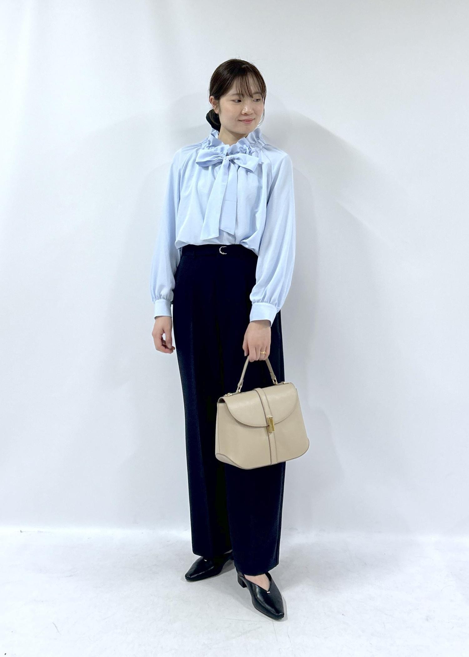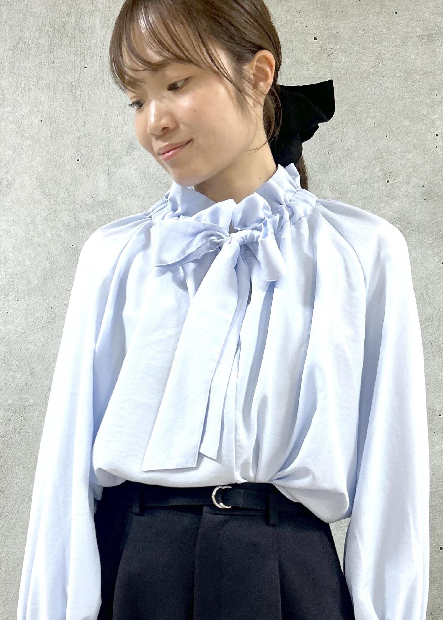 ROPÉ PICNICネックコンシャスデザインシャツ/イージーケアサックス / F¥5,995レビューリボンの結びで首元の印象を少し変えることができます。アクセサリーいらずな華やかなブラウスで、1枚でも着映えするブラウスです。生地は比較的シワになりにくく扱いやすい素材です。