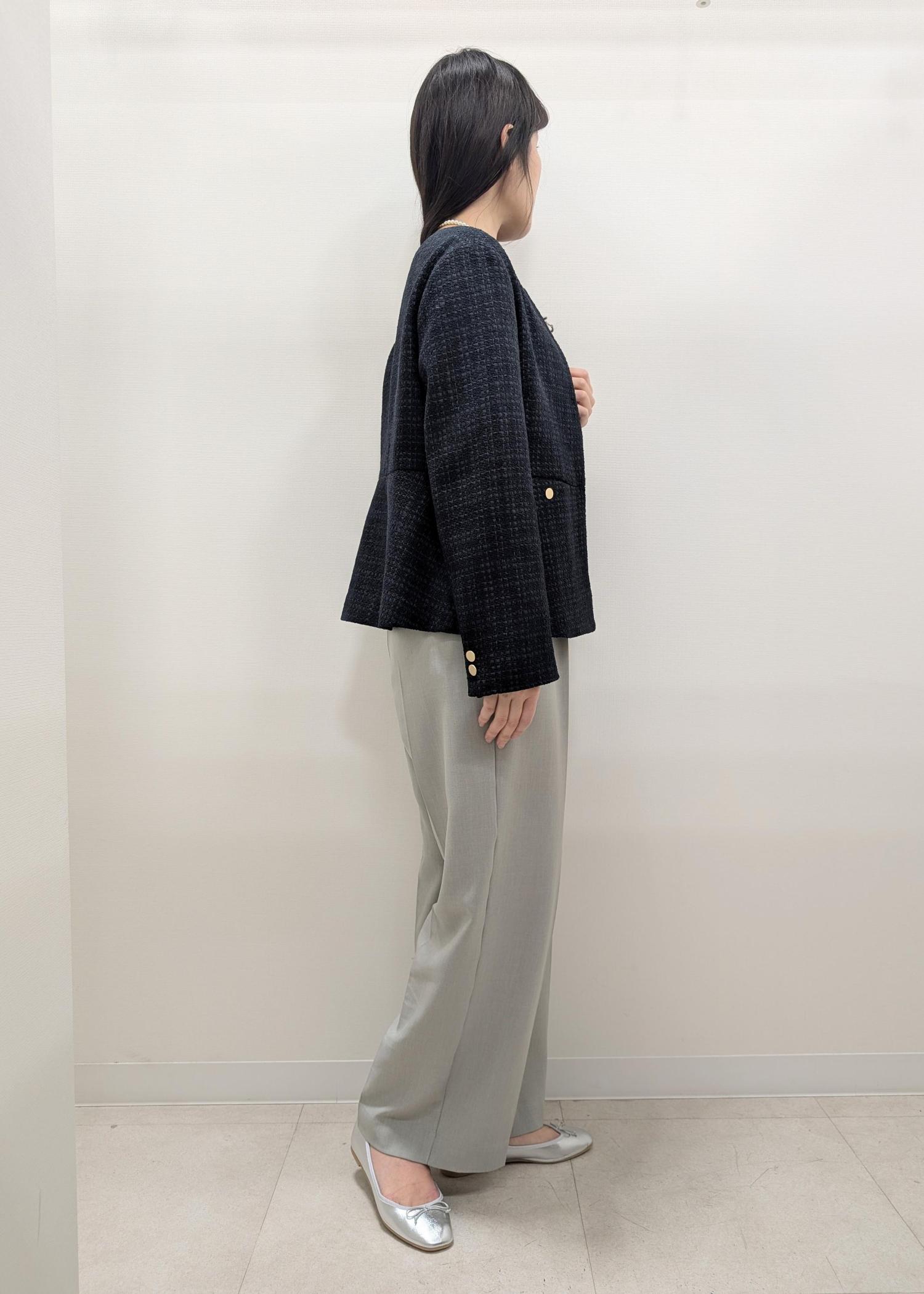 セレモニー定番のツイードジャケットにワイドパンツ、ボーダーTを合わせて普段も着やすいコーディネートにしました(^^)