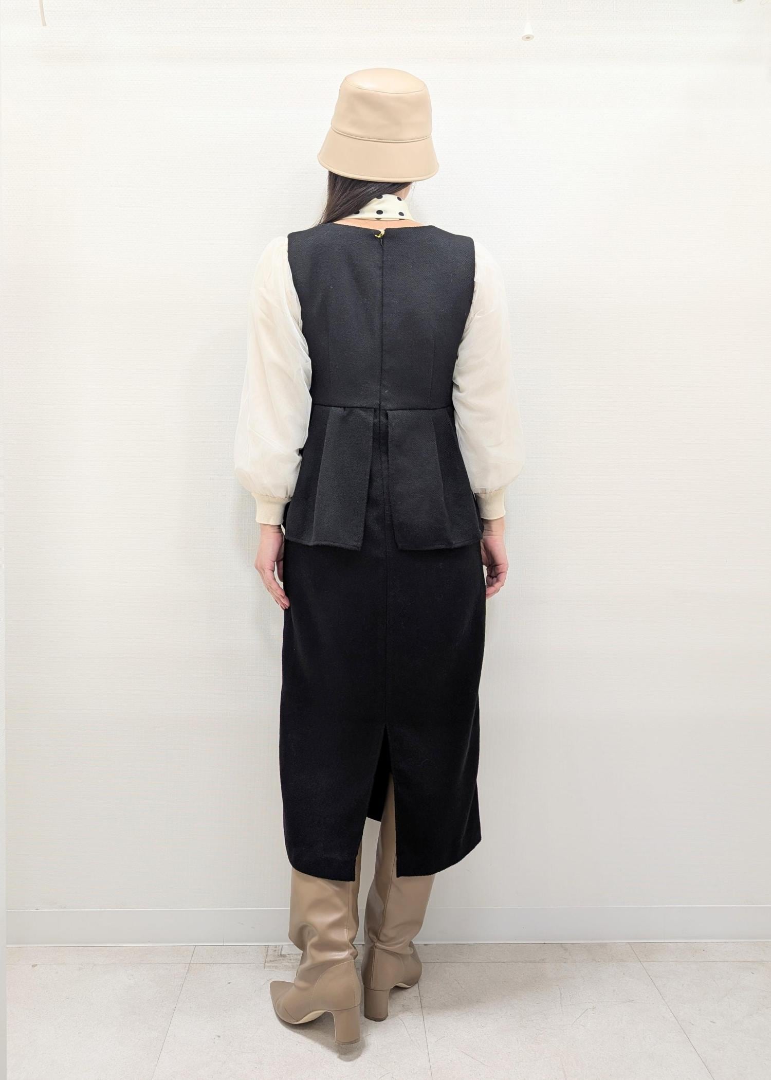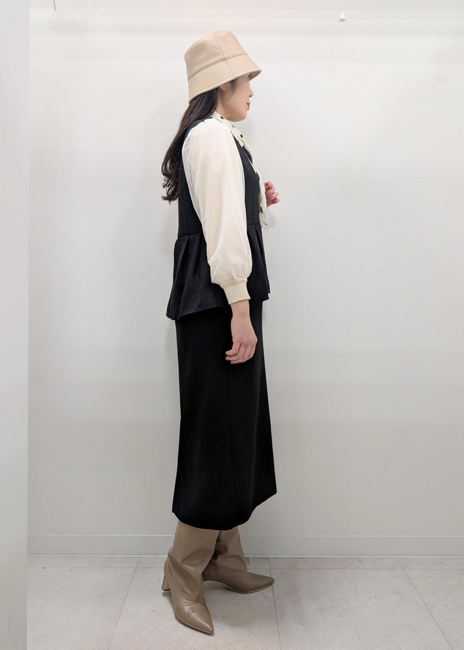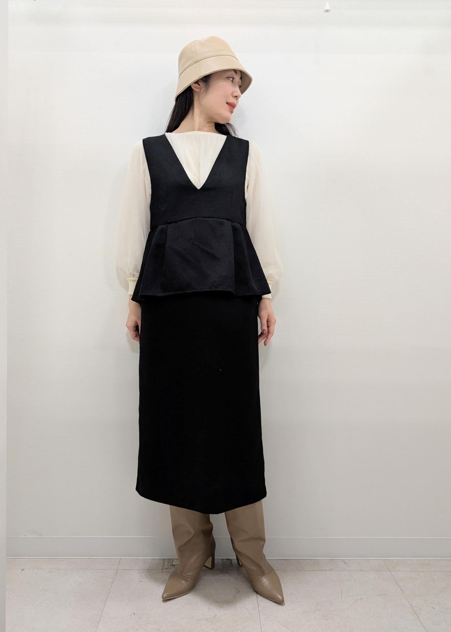 ペプラムワンピース×チュールニットの甘めコーディネート。