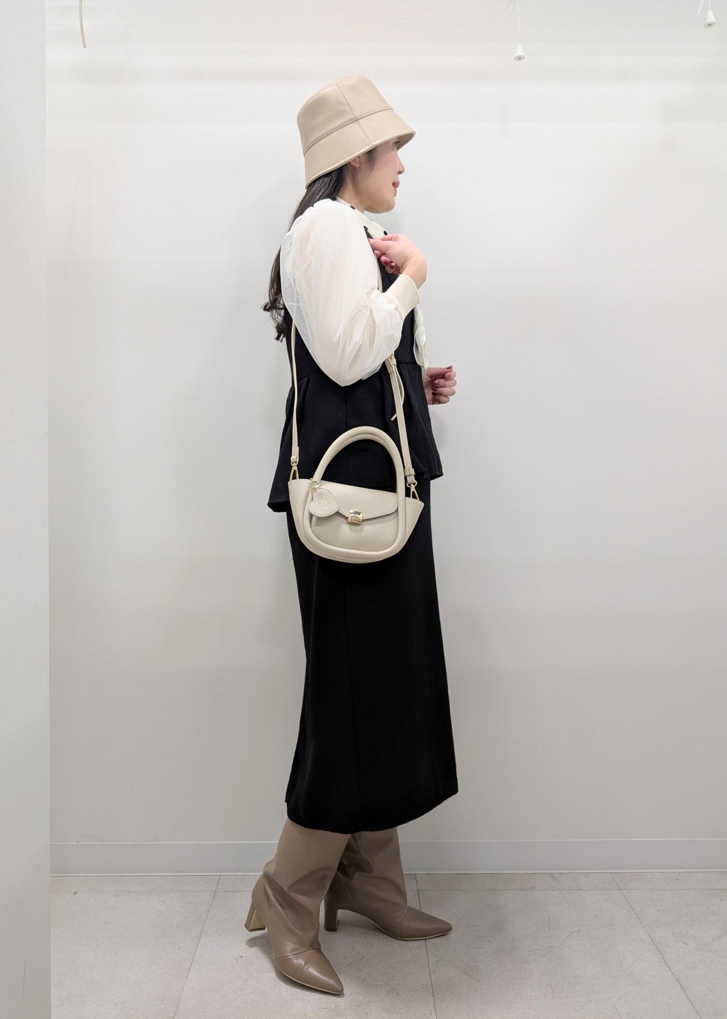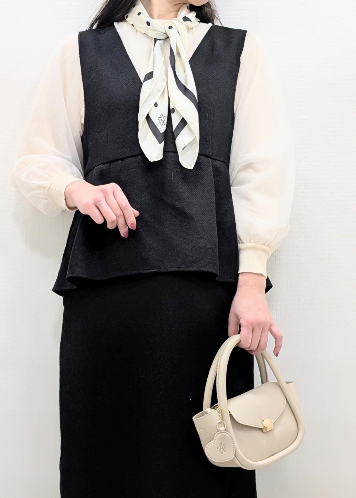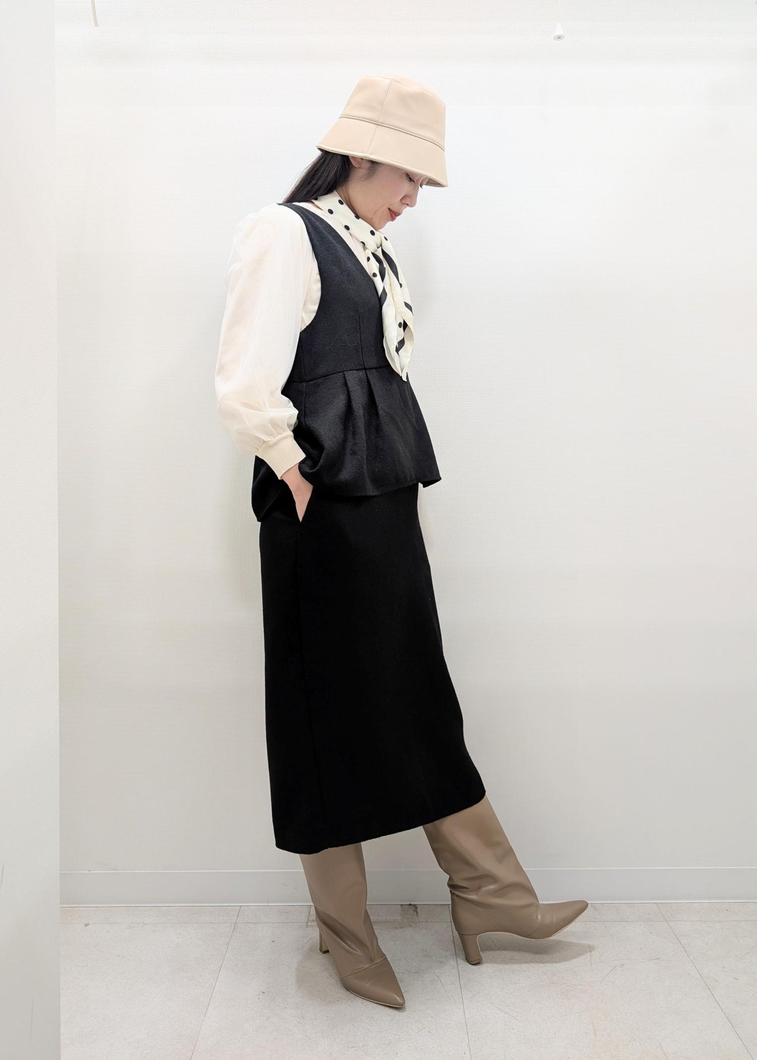 ベーシックカラー同士のコーディネートなので、ドットのスカーフやミニバッグでお出かけらしい華やいだ雰囲気に仕上げました(^.^)