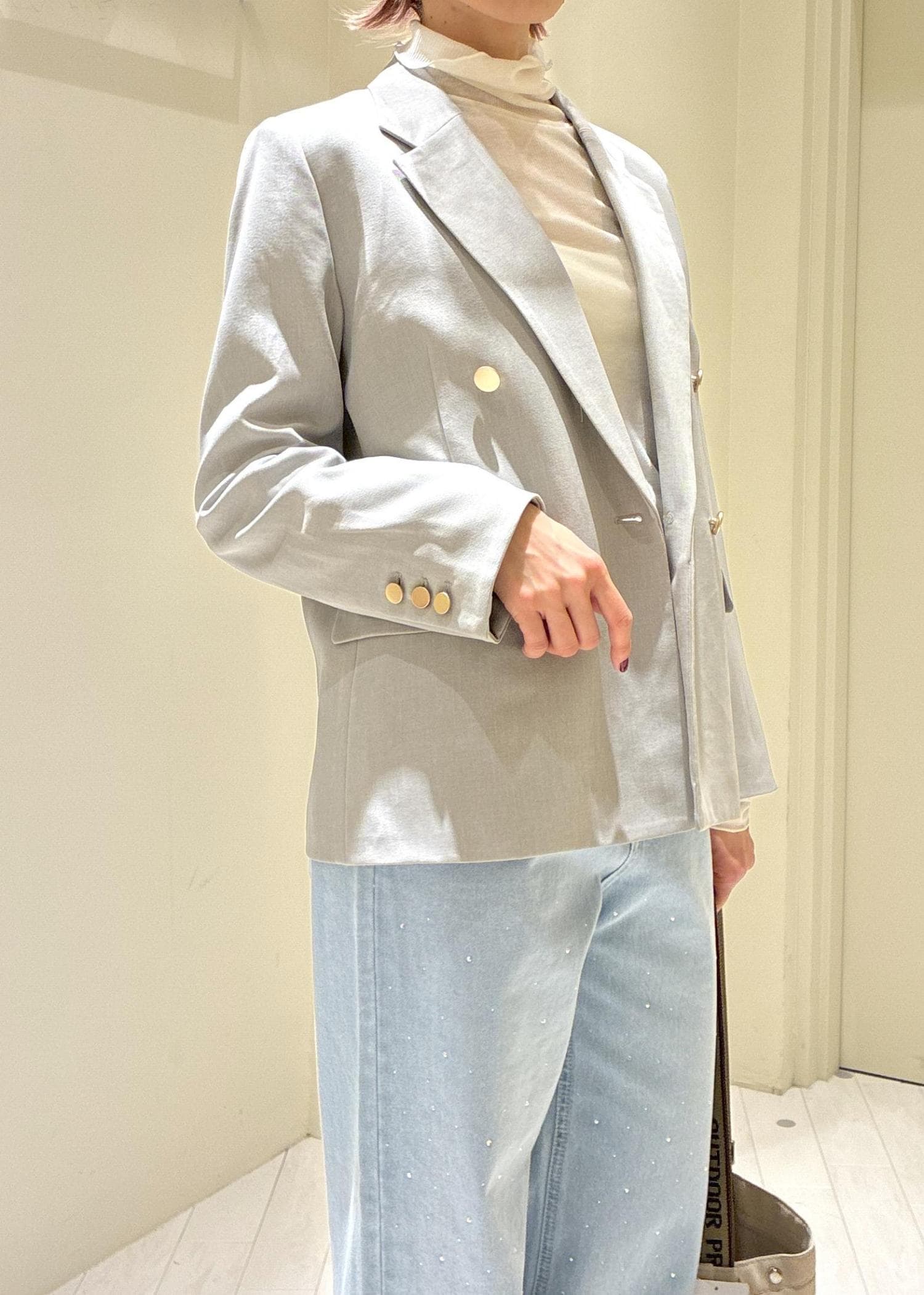 金釦がアクセントになり、カジュアルダウンもしやすいです。軽くサラッとした素材感で肌馴染み・着心地も良いです。 -