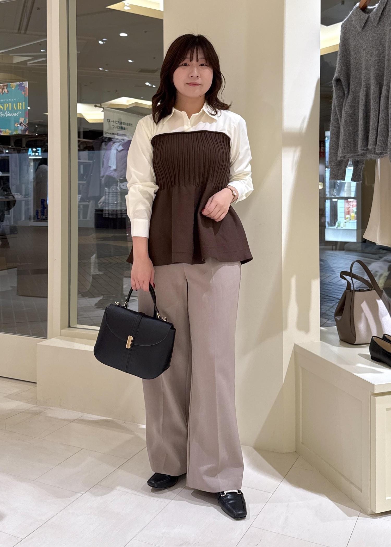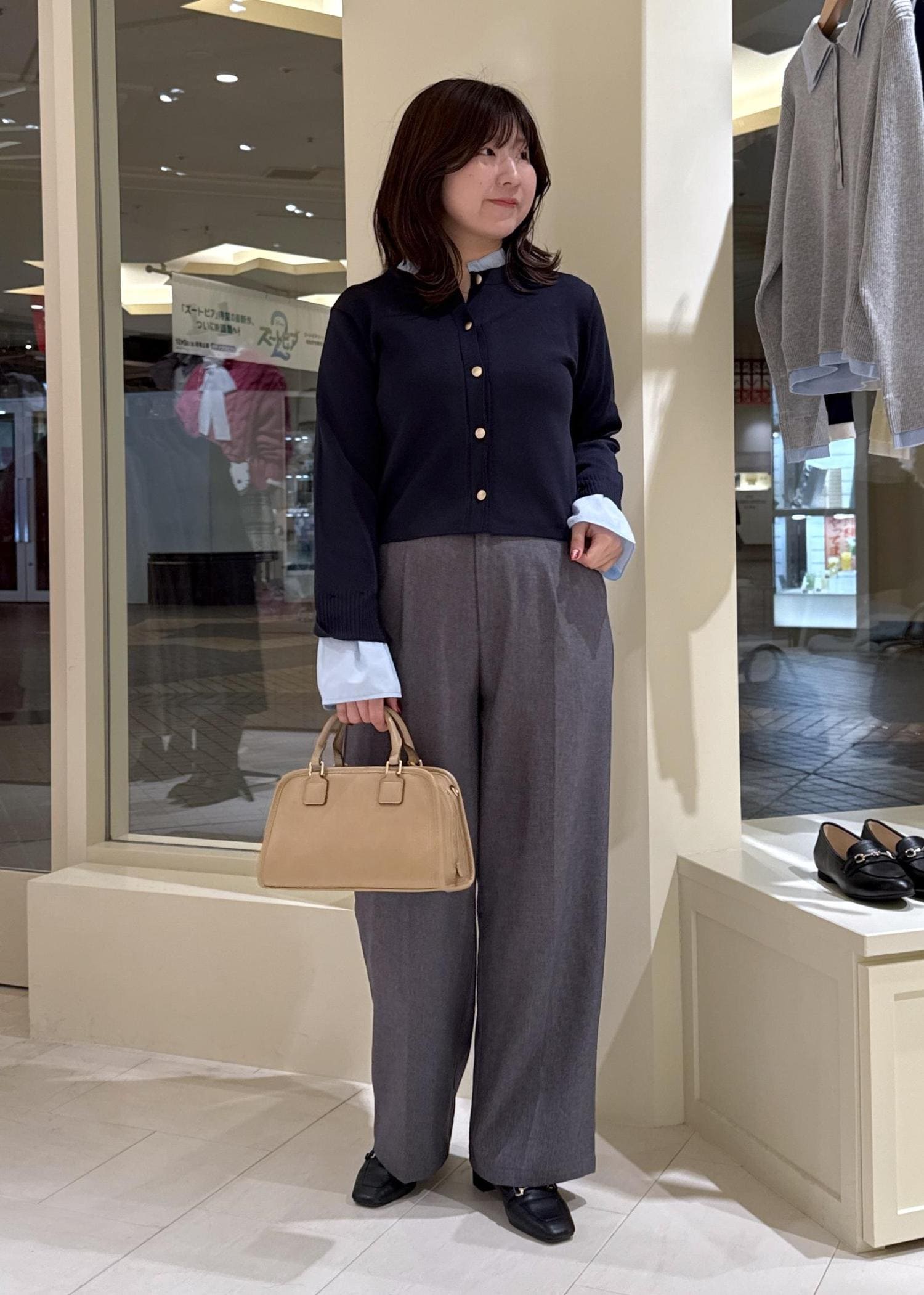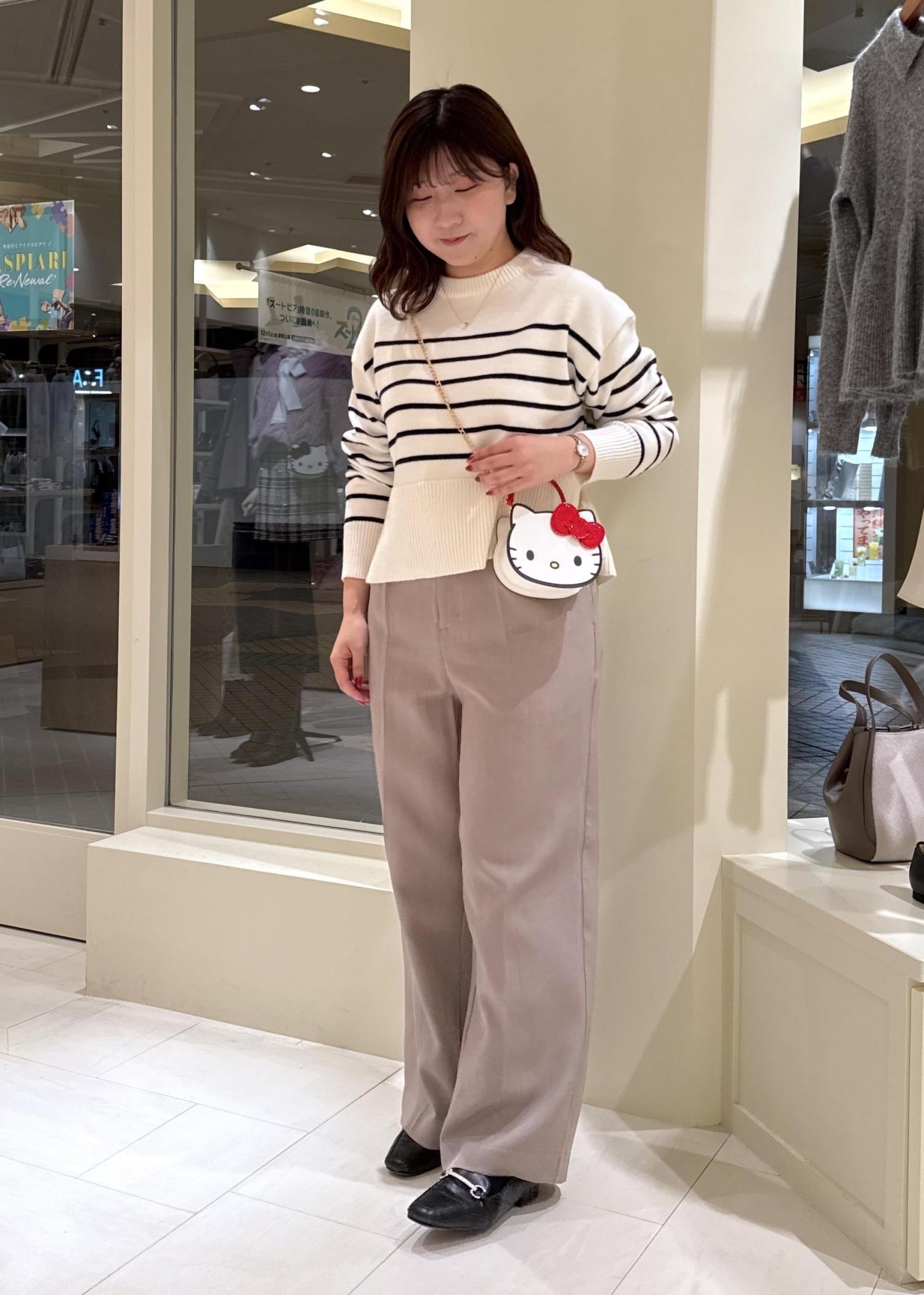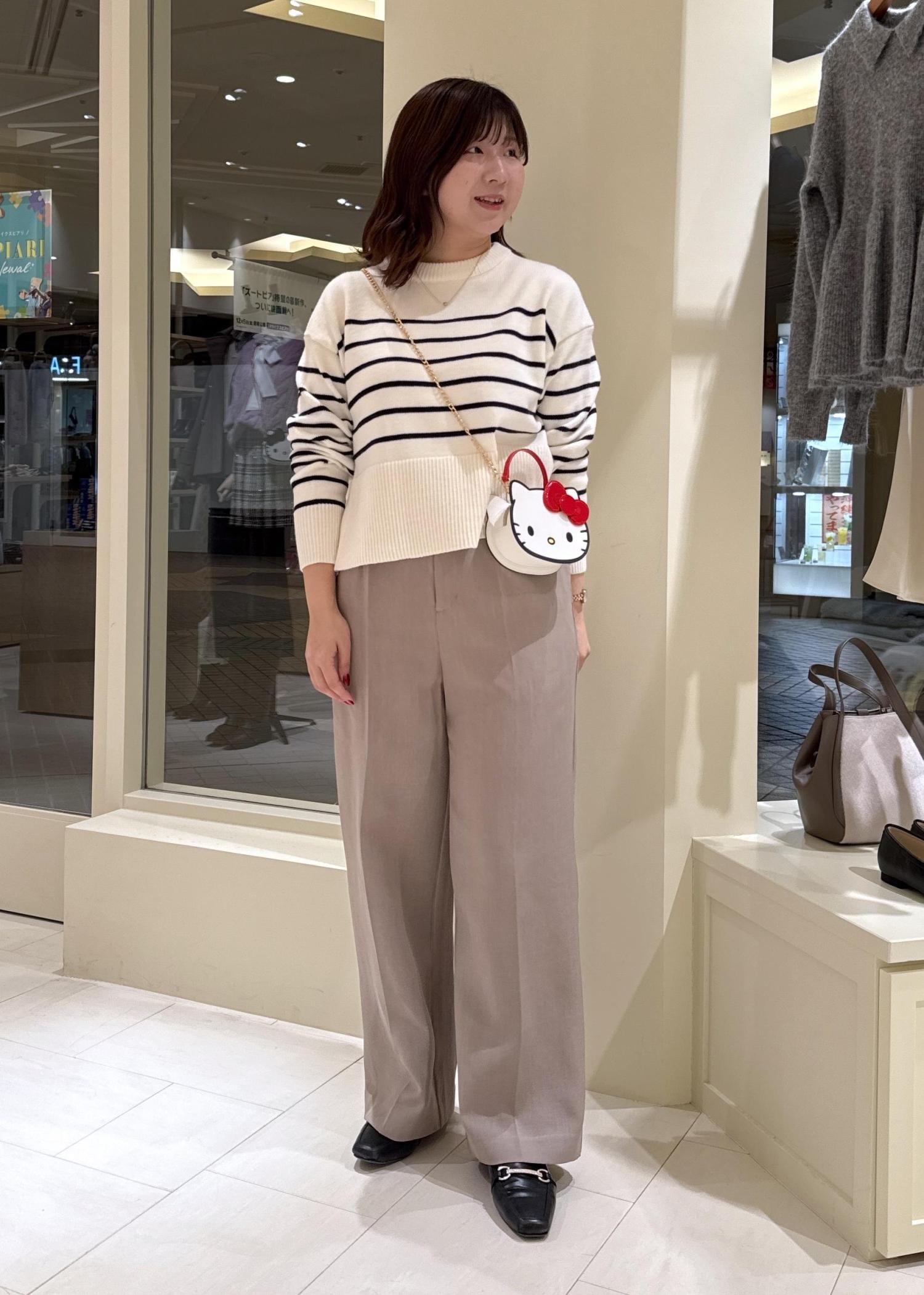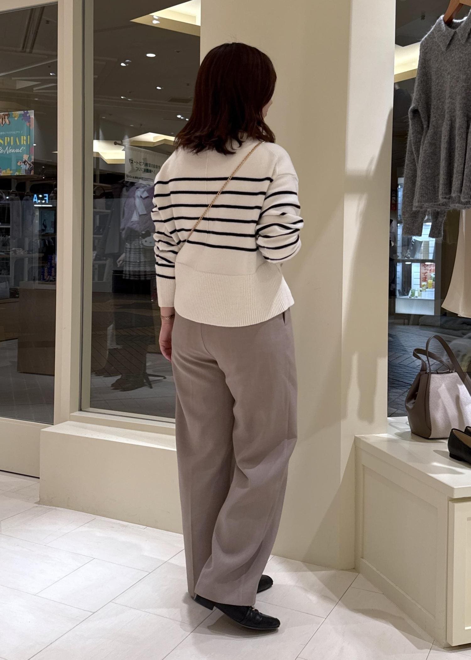 セットアップのボトムをカジュアルなニットスタイルに合わせて普段でも使えるコーデに。