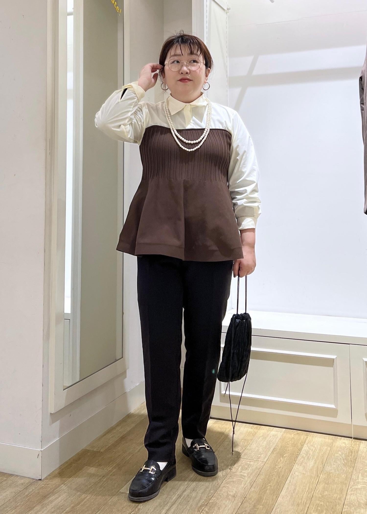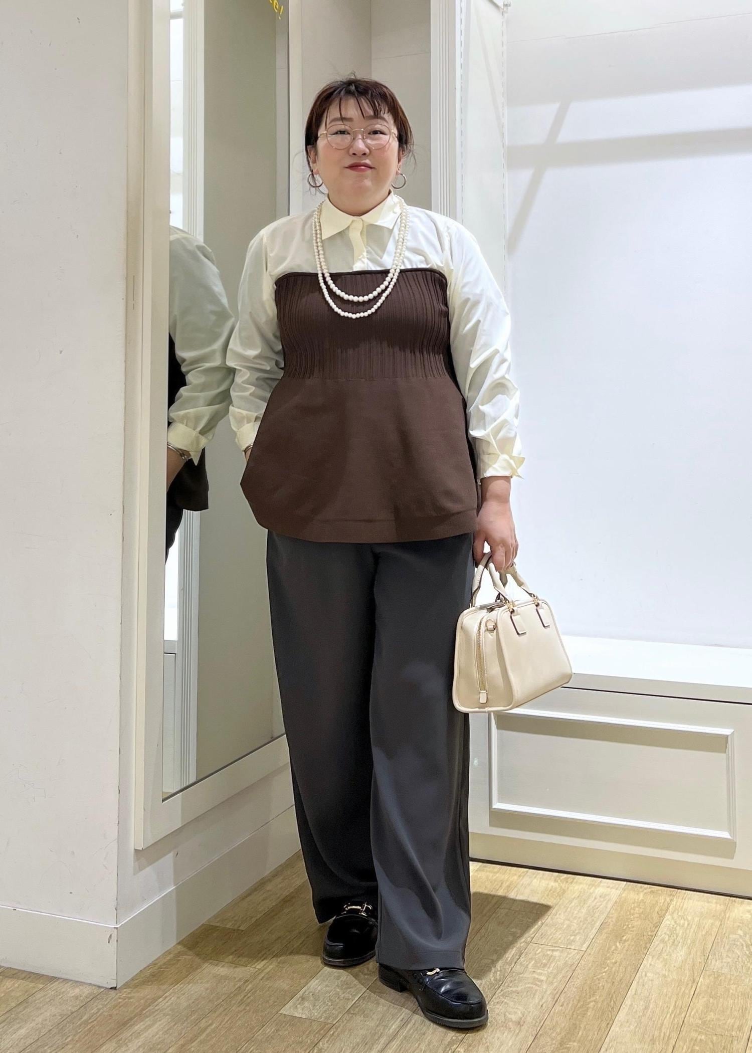 トップスの上にも下にも着用できて、アクセントと体型カバーの叶うビスチェはお助けアイテムです♪