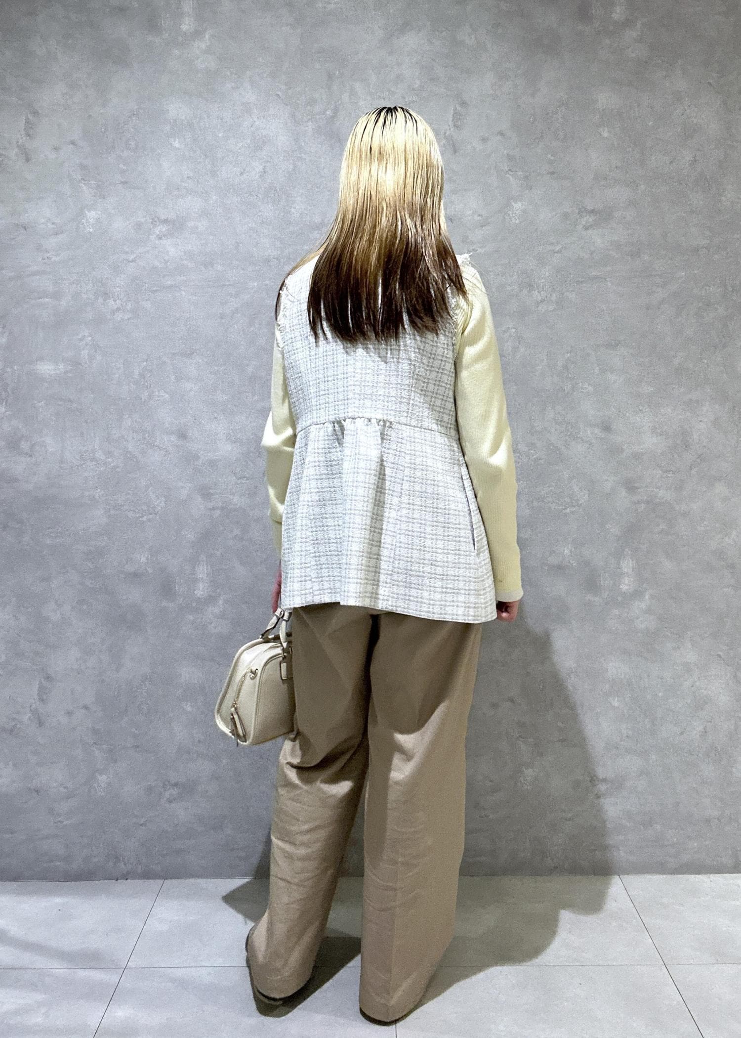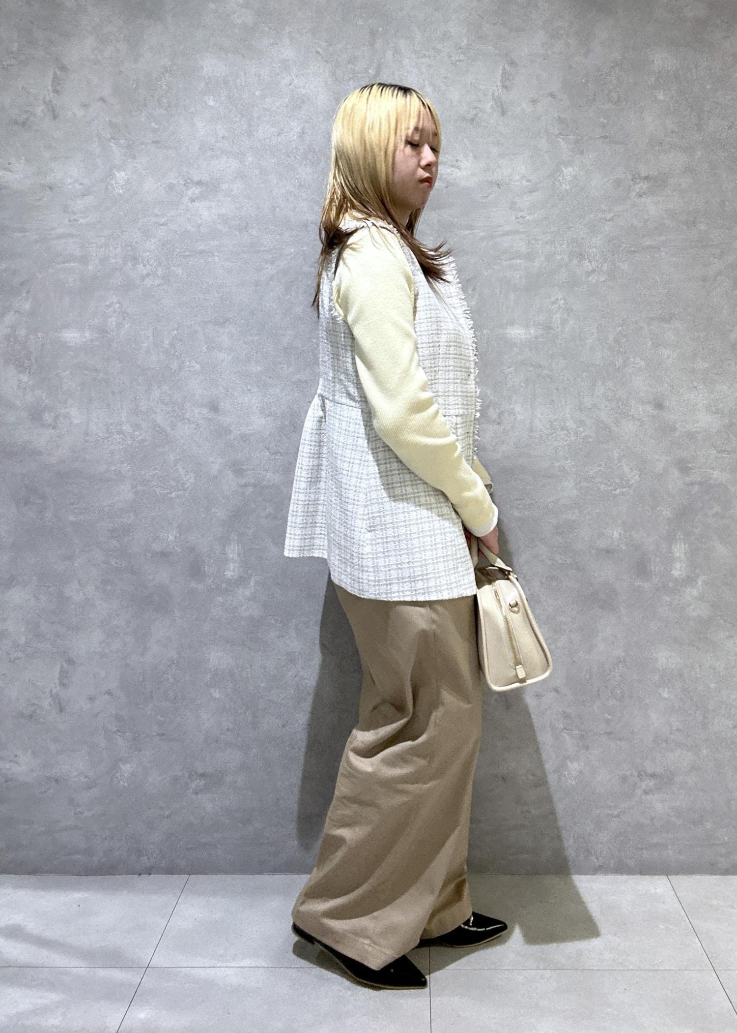 ROPÉ PICNICウエストタックチノパンツベージュ / L¥6,490レビュー脚のラインを拾いすぎず、程よいワイド感で履くだけで美脚になれるパンツ。普段でもお仕事でもどちらでも活用できる。