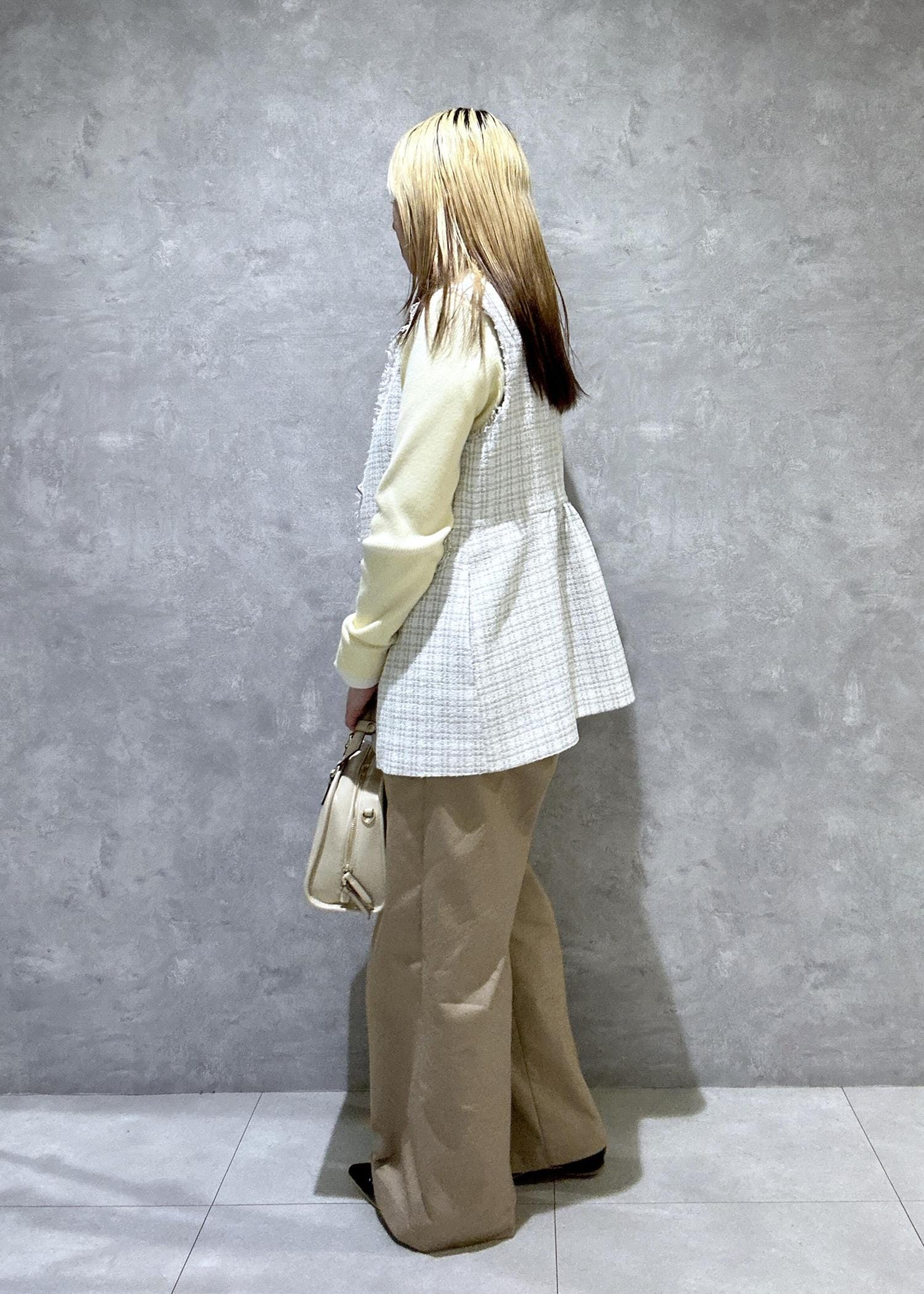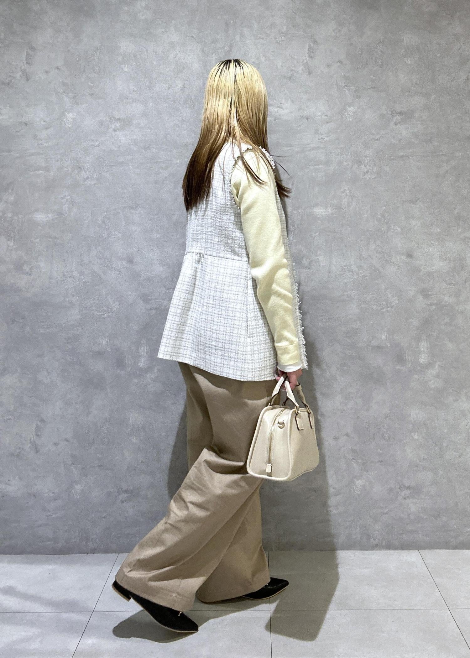 イエロー、ベージュ、ホワイトなど春カラーを使用したきれいめなコーデ。