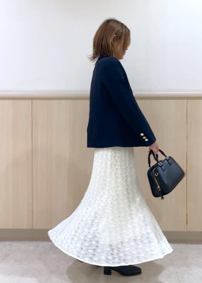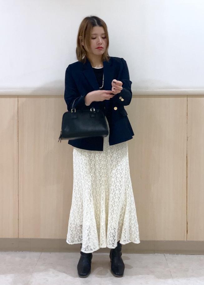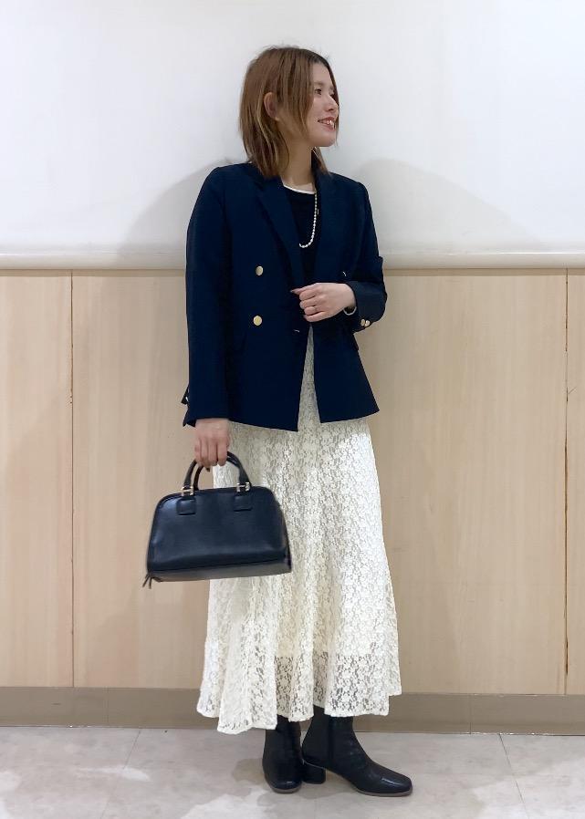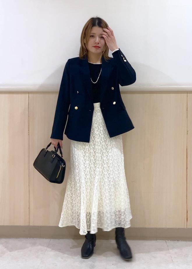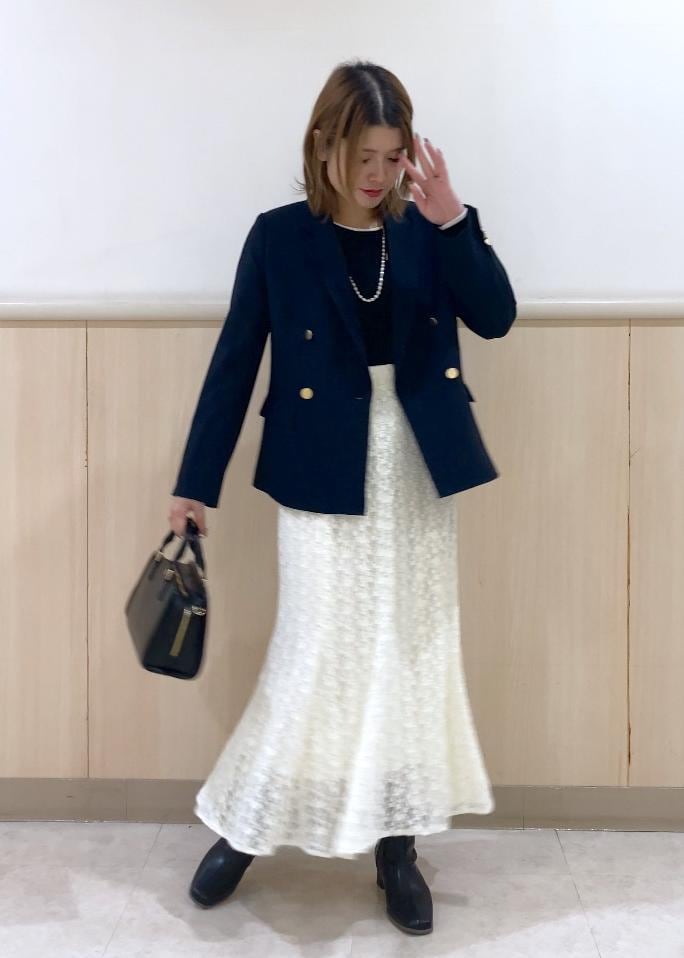 フェミニン要素の強いレースマーメイドスカートをネイビージャケットを羽織ることできちんと感をプラスし、大人っぽく仕上げるためにその他は全てブラックでまとめました!