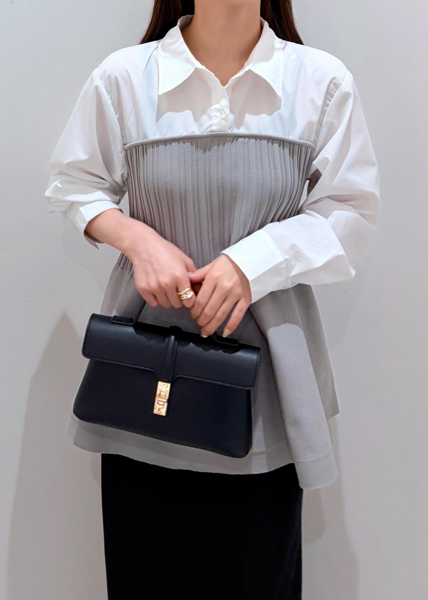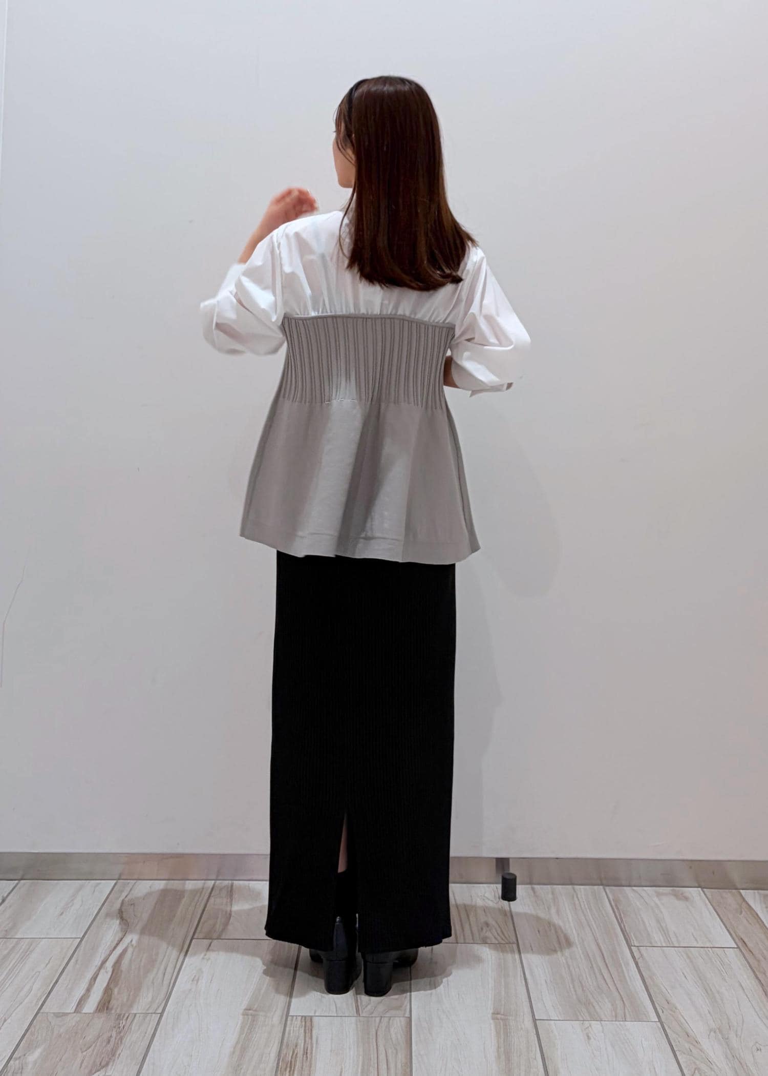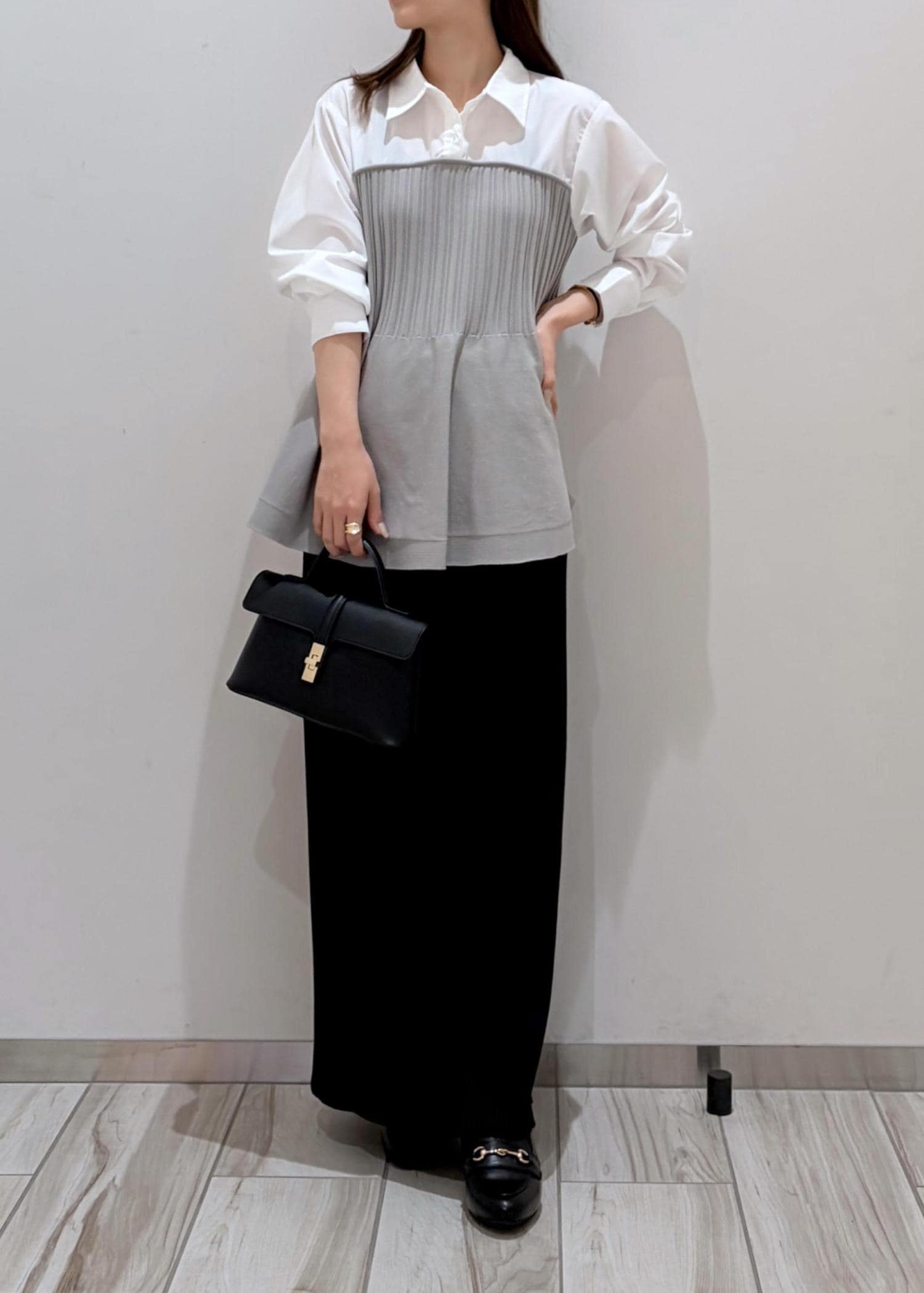 着丈が長めなペプラムシャツは、低身長さんだと着られがちですが、ロングのタイトスカートと合わせることで縦ラインが強調され、そこに高さのあるシューズをプラスする事で、スタイルup効果に♪華奢めなカチューシャを合わせることでより上品な可愛らしさを◎