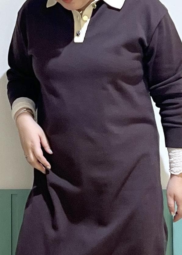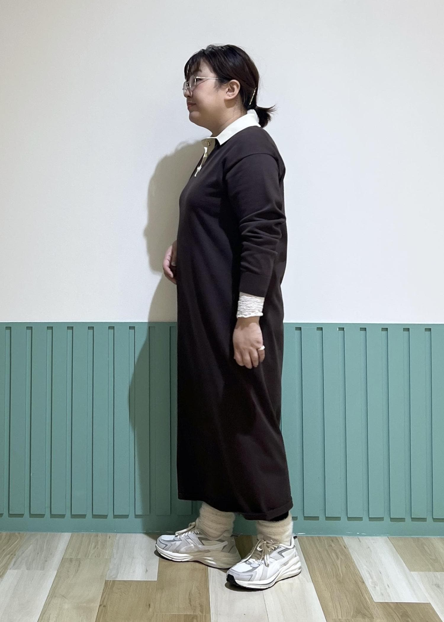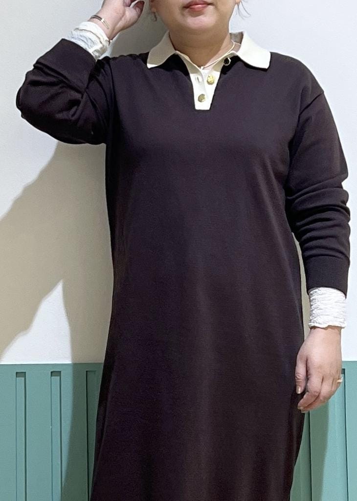 ストレッチ性があり歩きやすいワンピース。首元のバイカラーがポイントになり、一枚でも様になります♡