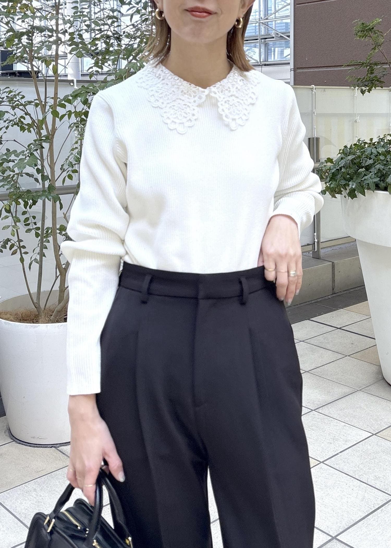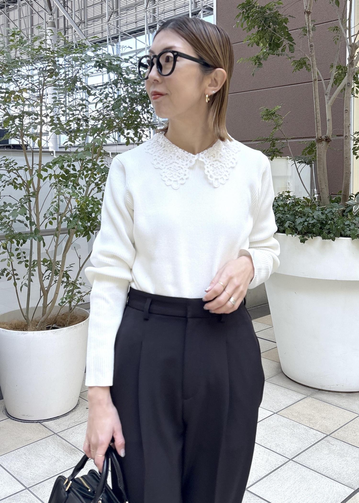 甘さ控えめ、レース衿で品よく華やぐリブニット