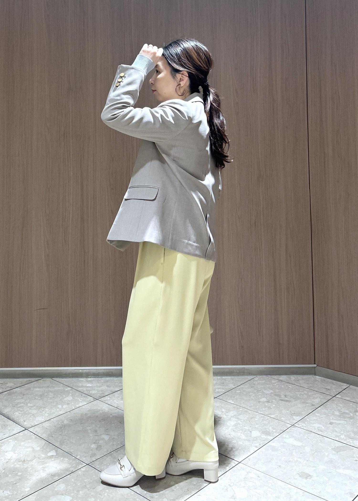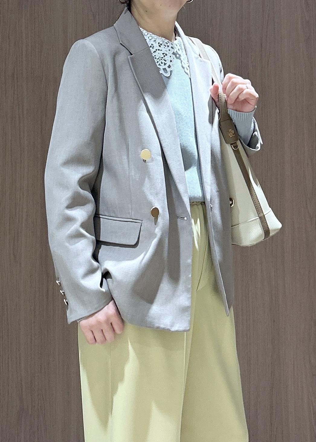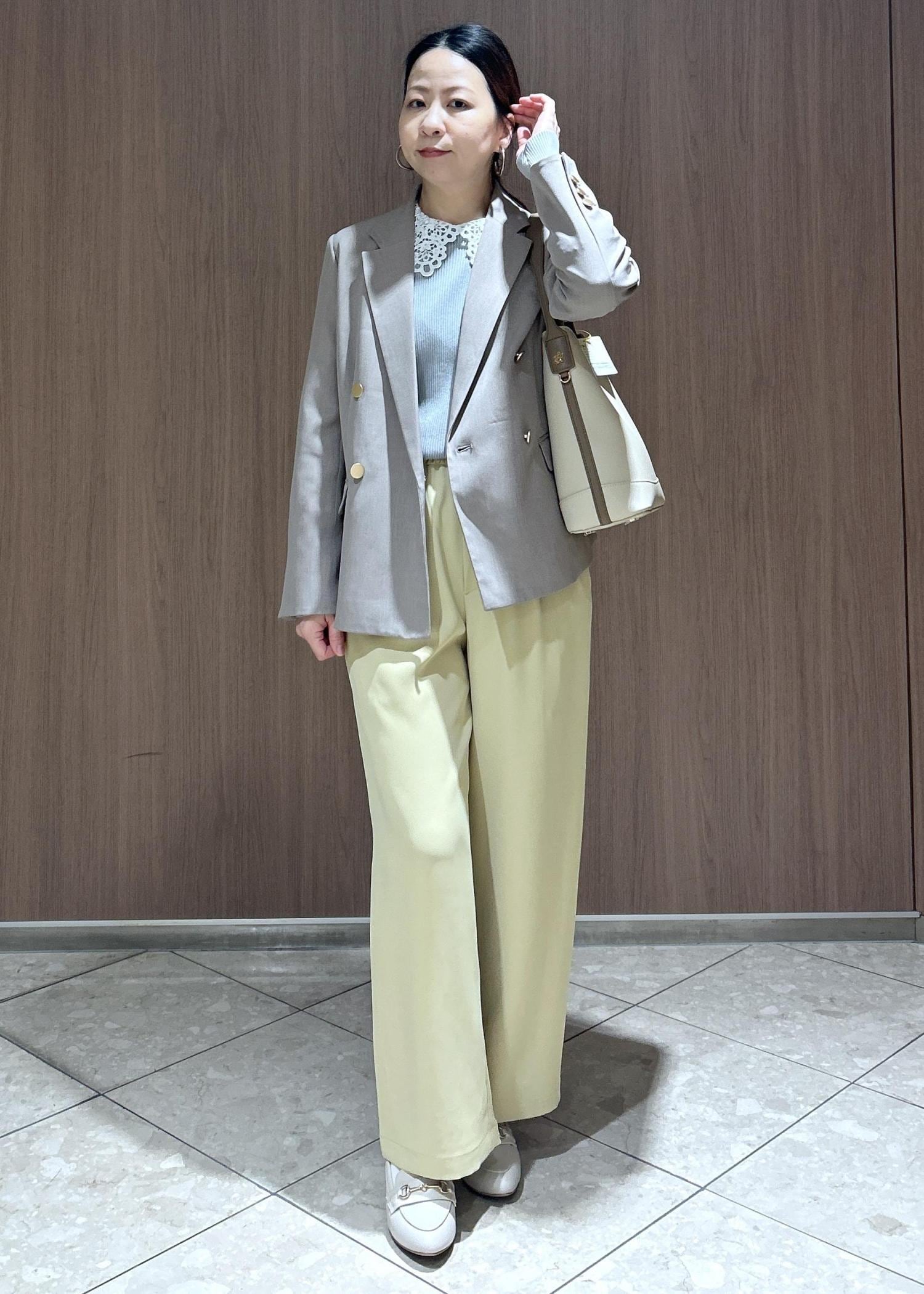 カラーパンツ✖️ジャケットで春のお仕事スタイルにしてみました。春といっても風が冷たい日もあるので、インナーは襟付きニットで可愛さをプラスしたコーディネートにしました。