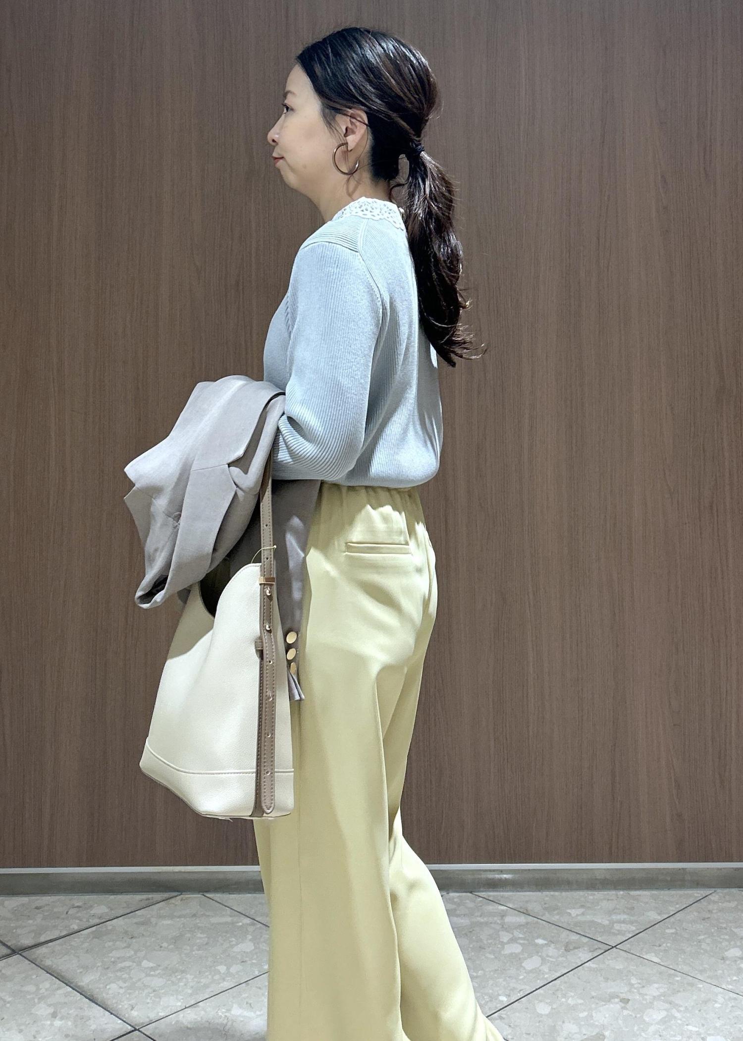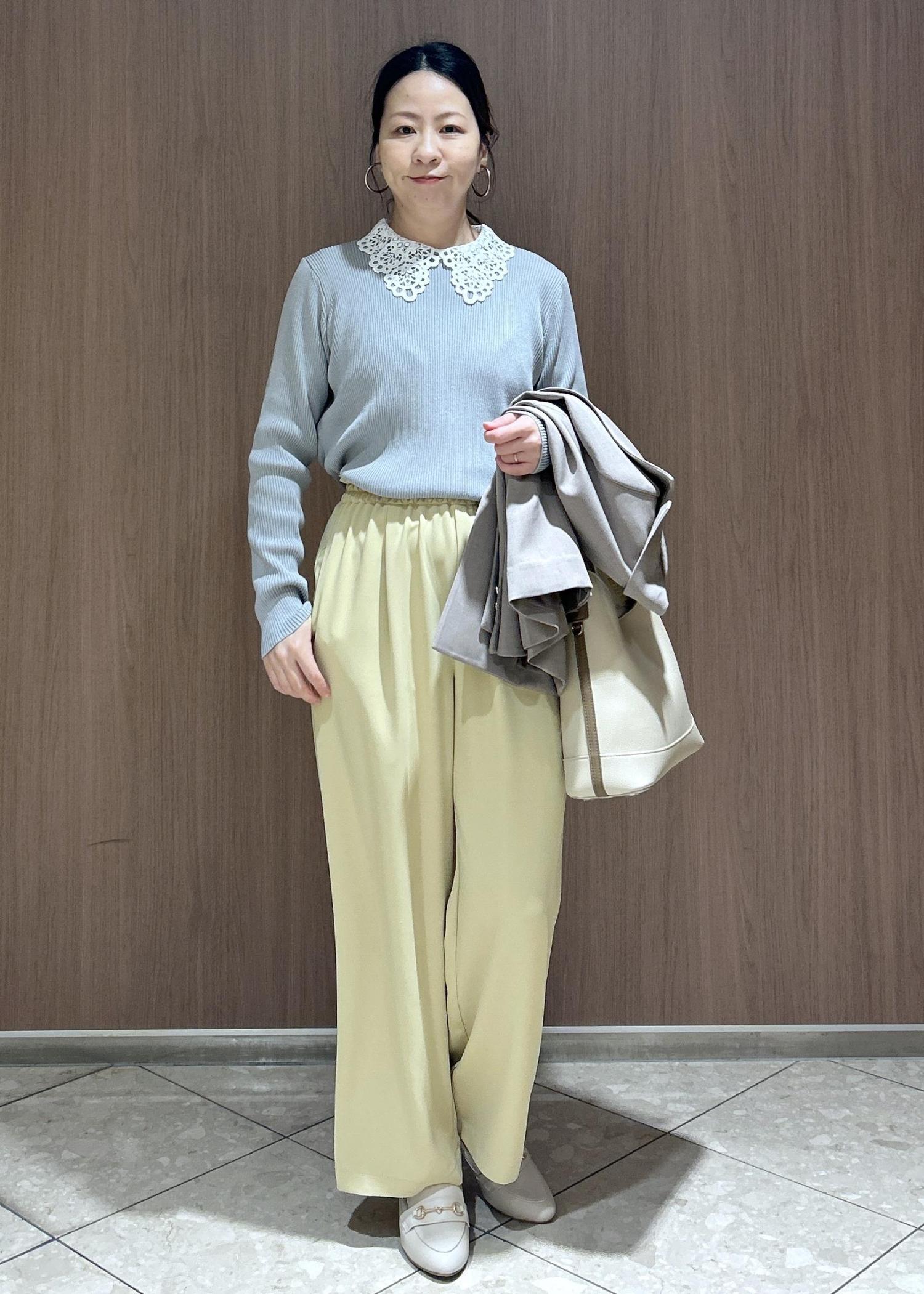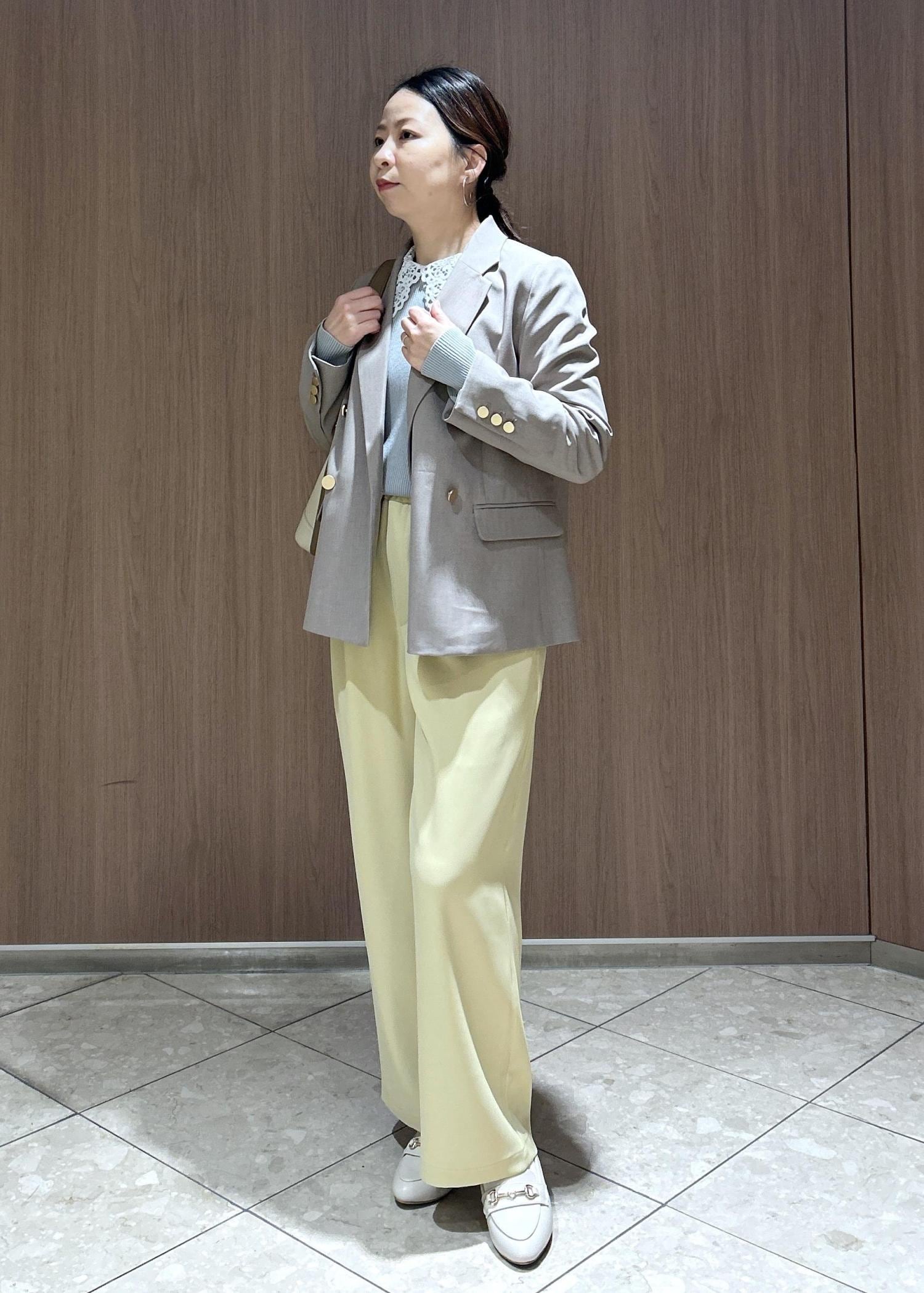 カラーパンツ✖️ジャケットで春のお仕事スタイルにしてみました。春といっても風が冷たい日もあるので、インナーは襟付きニットで可愛さをプラスしたコーディネートにしました。
