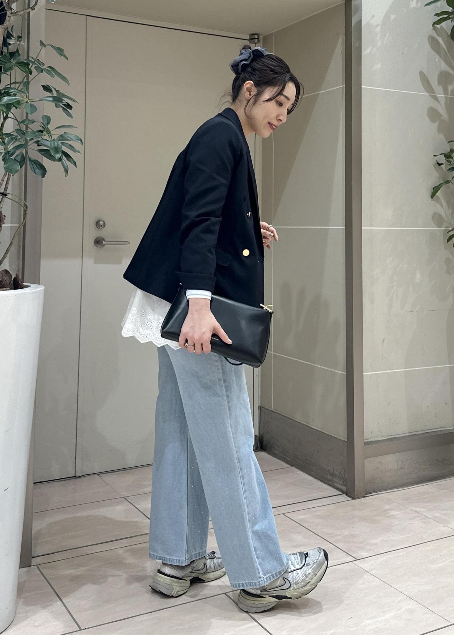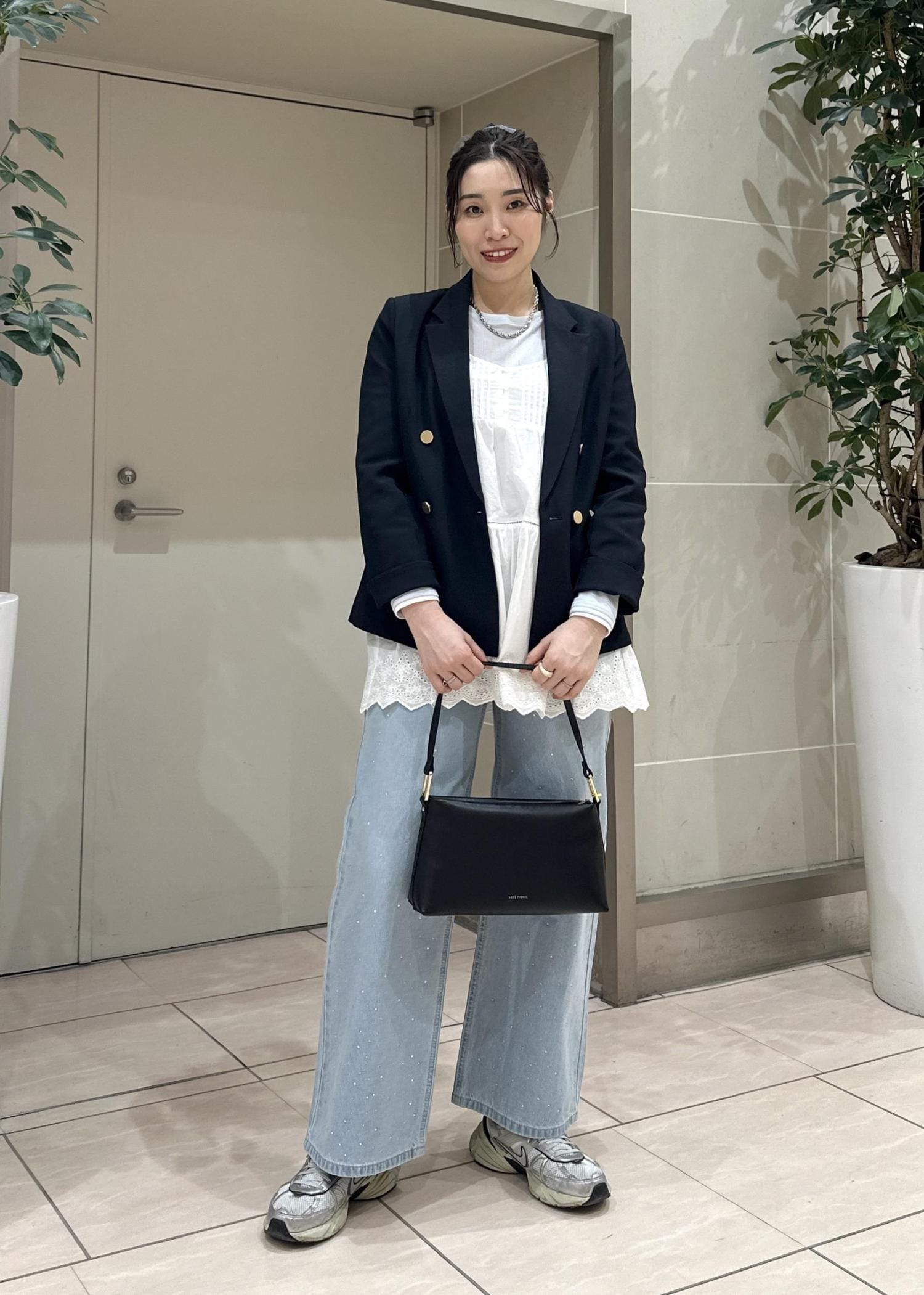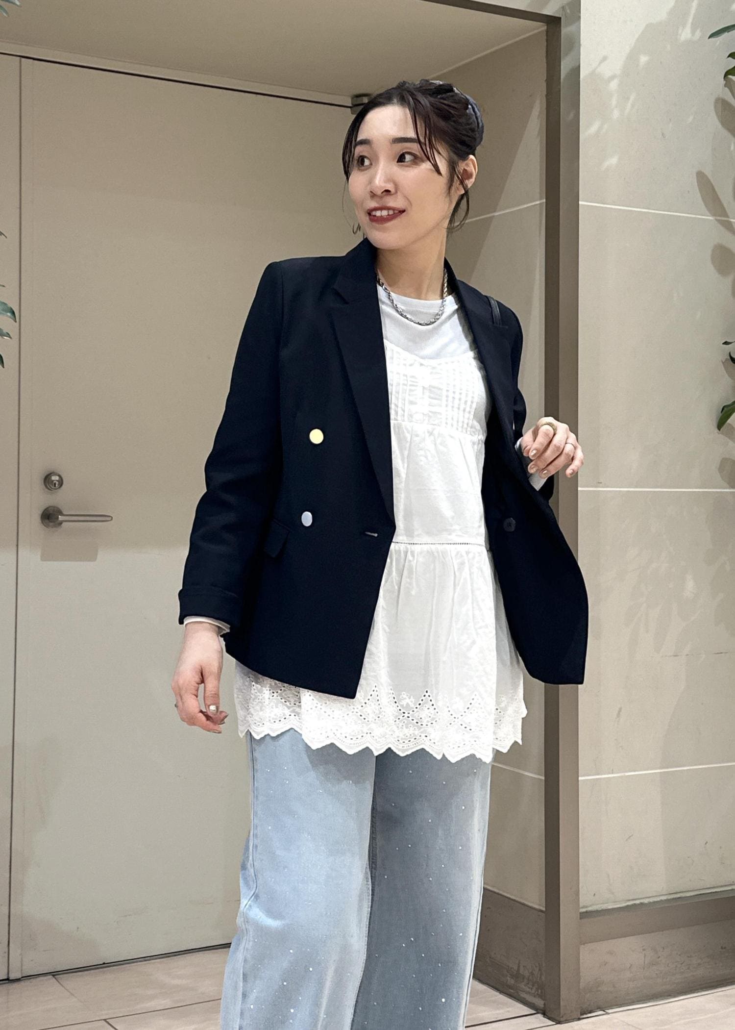 大人気の金ボタンジャケットを使った韓国っぽコーデ。