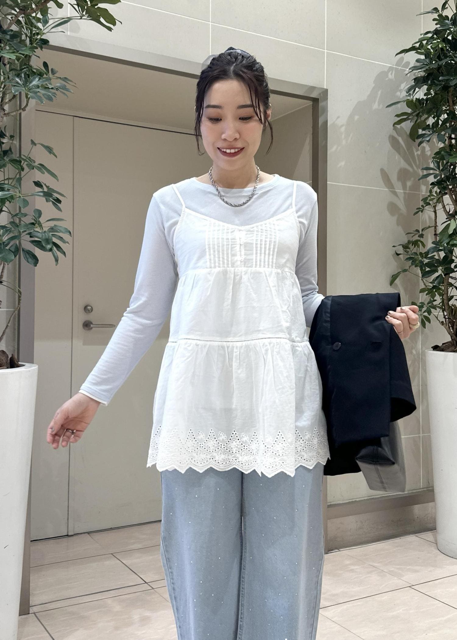 全体的に淡くまとめてフェミニンな雰囲気も出しつつ、ジャケットで大人っぽくまとめました。