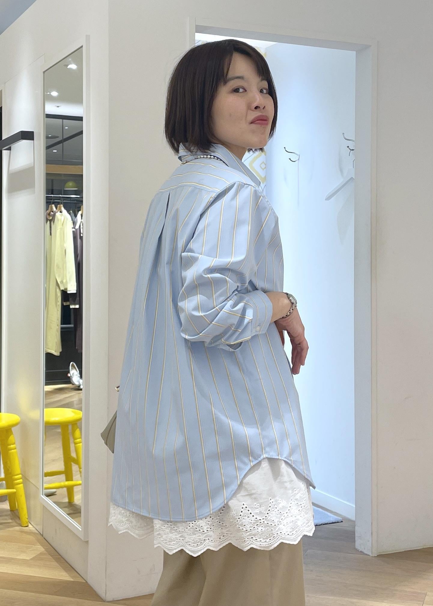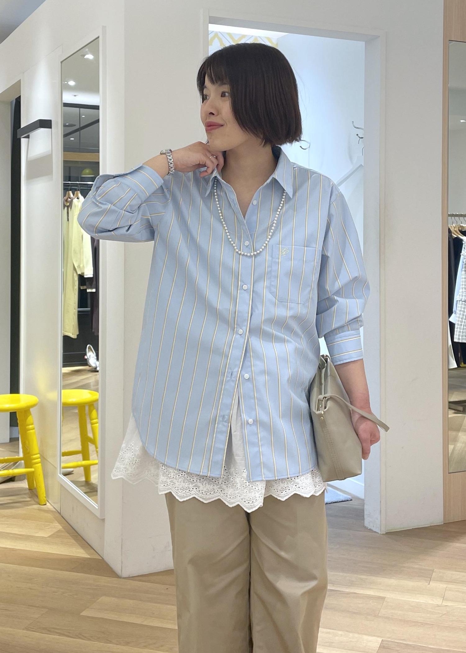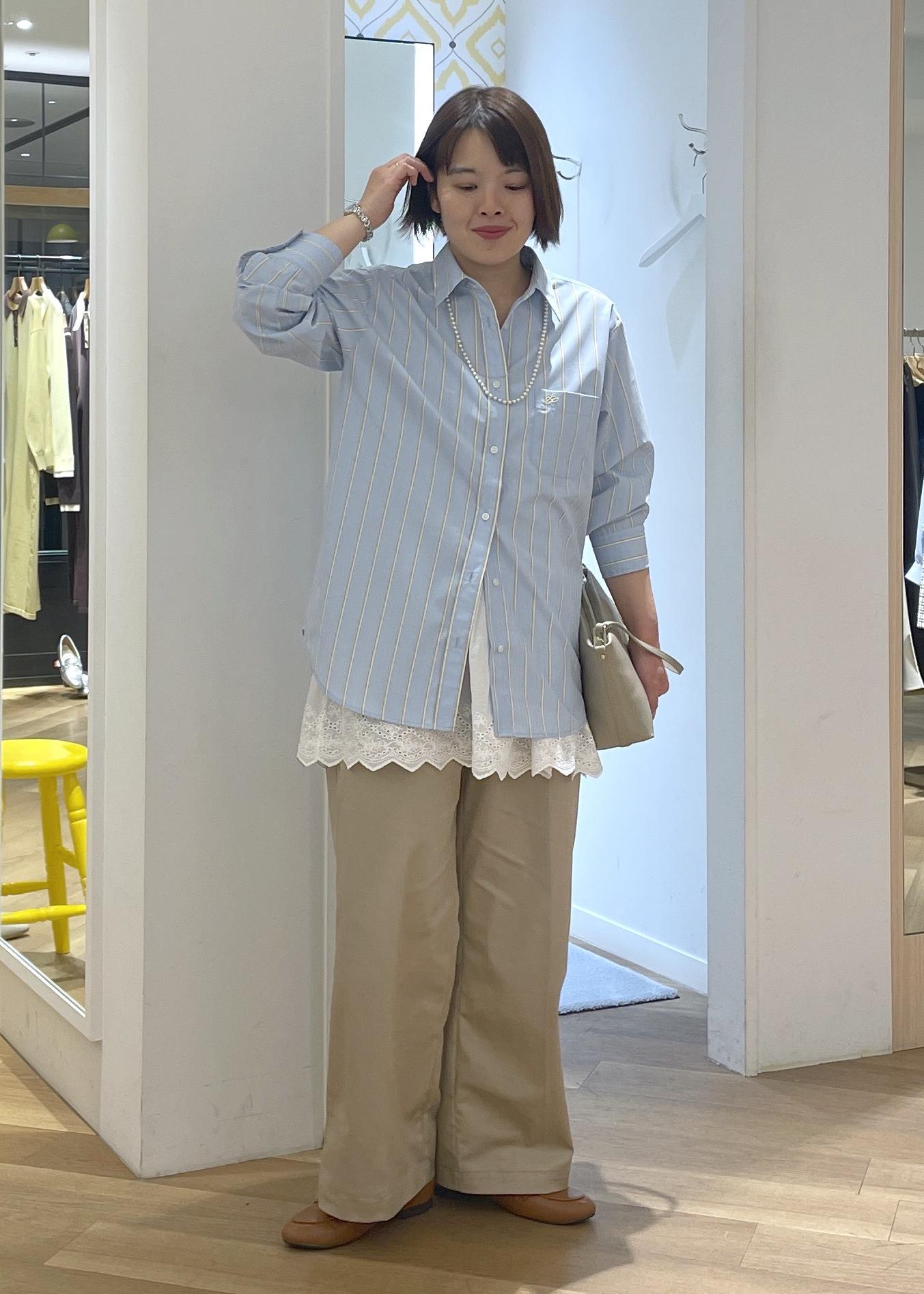 爽やかなストライプのシャツにレースのビスチェをレイヤードした、トレンド感ある大人カジュアルコーデです!