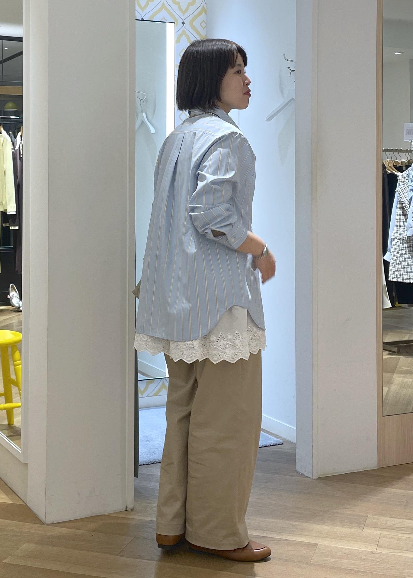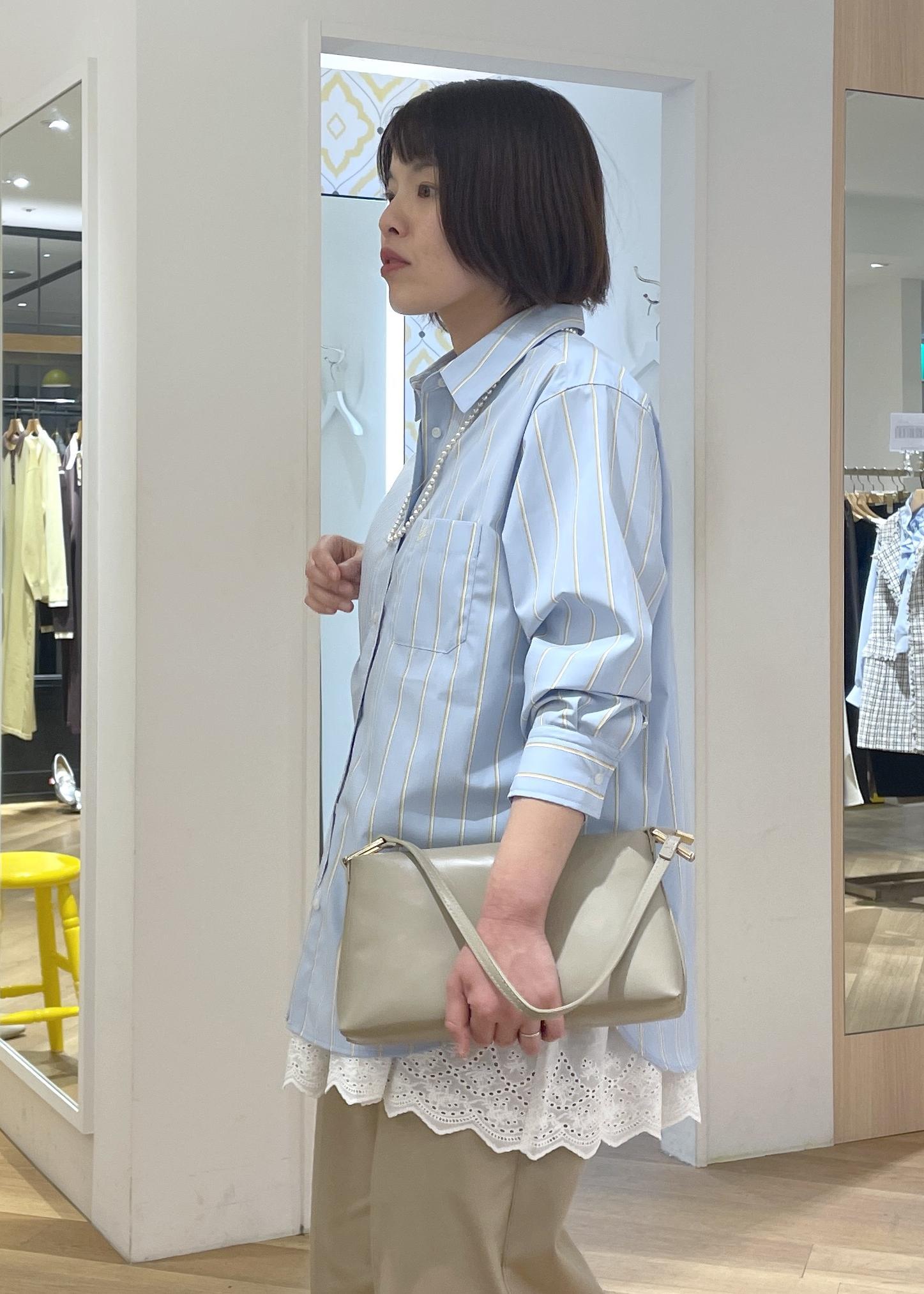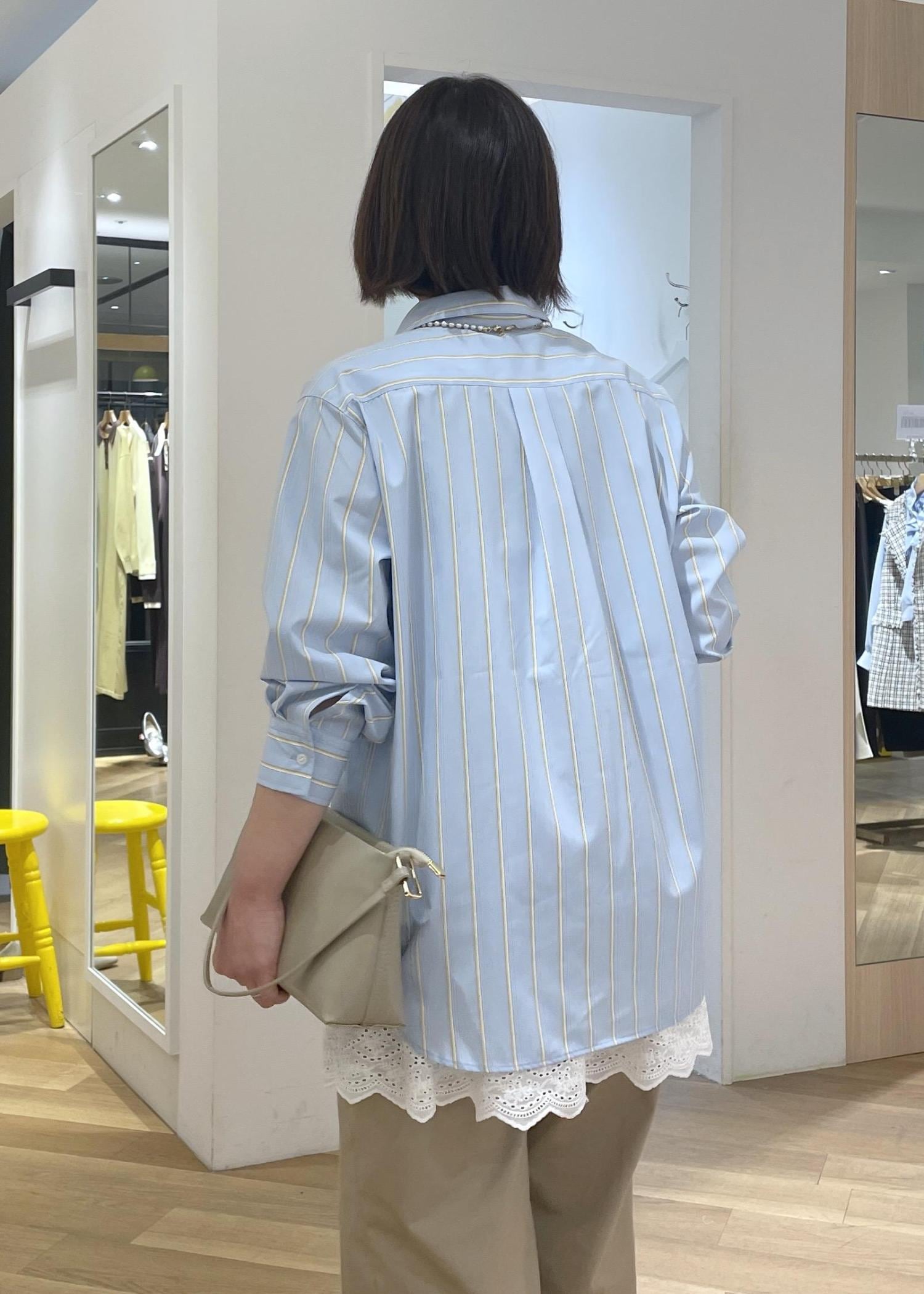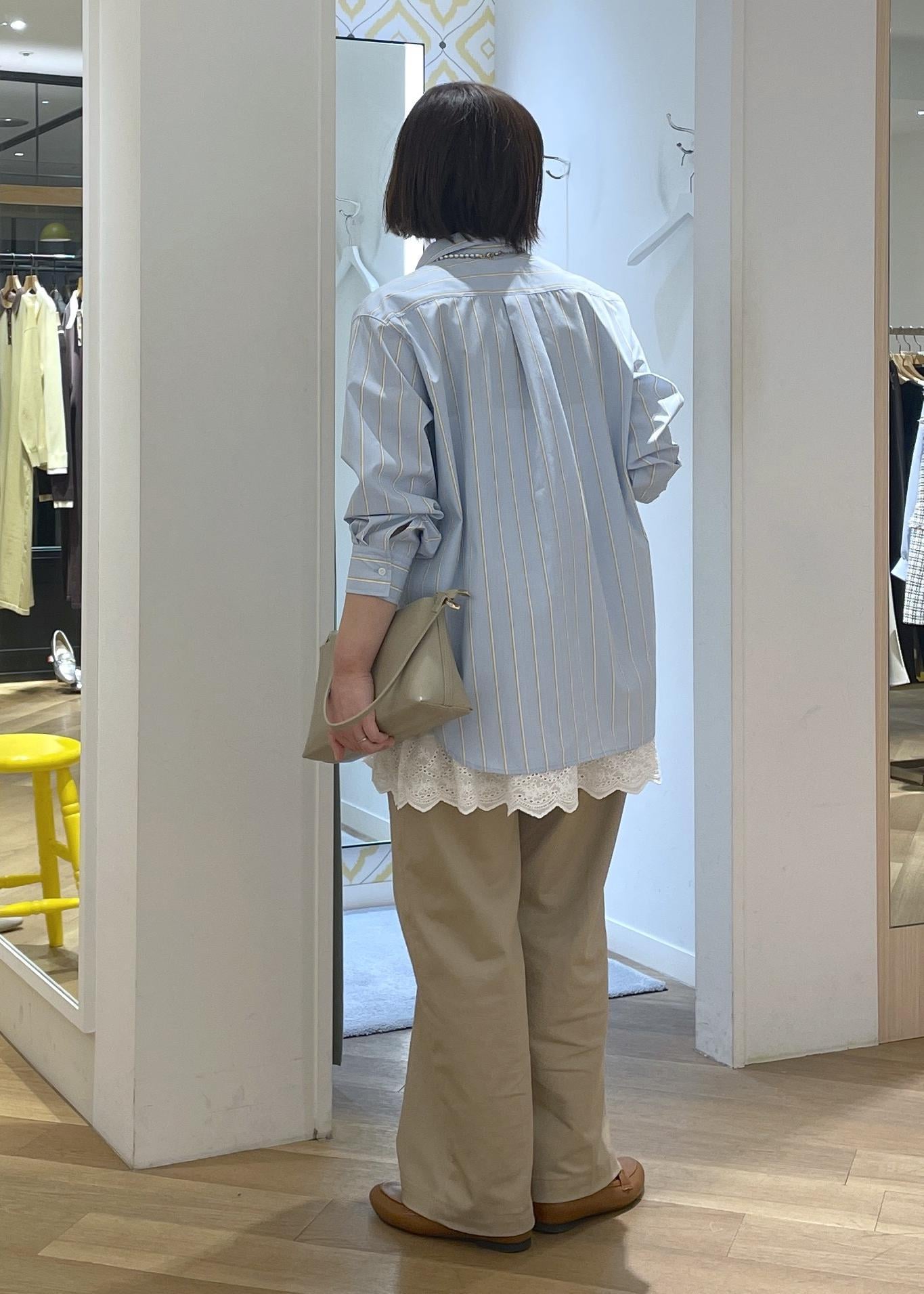 爽やかなストライプのシャツにレースのビスチェをレイヤードした、トレンド感ある大人カジュアルコーデです!