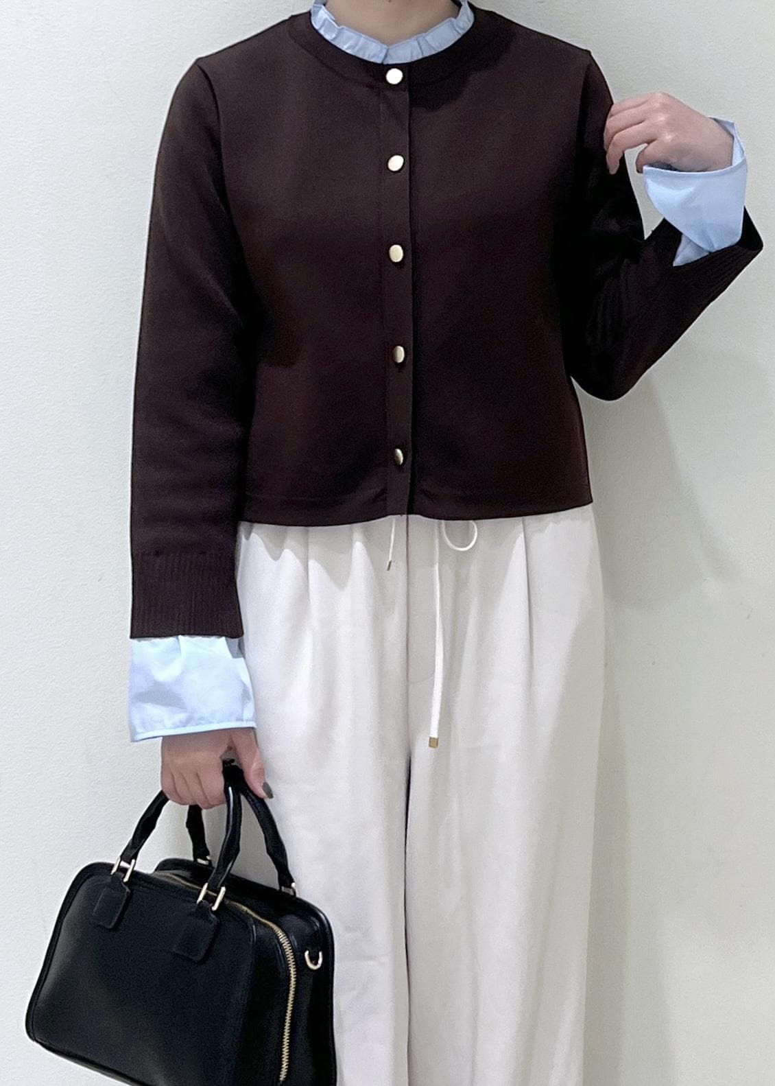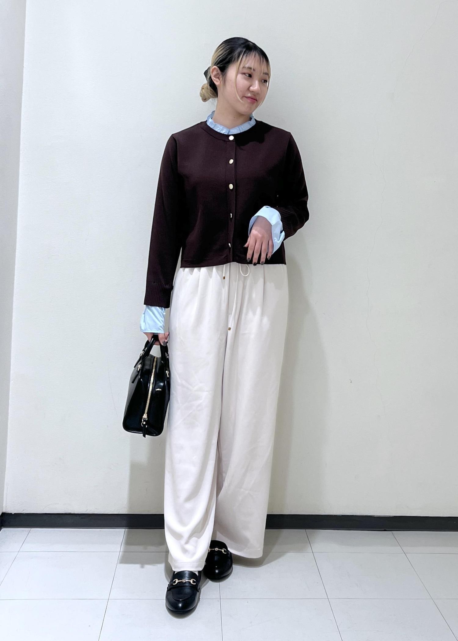 フリルデザインのカーディガンにゆるめのワイドパンツを合わせてきれいめカジュアルなスタイリングにしました◎