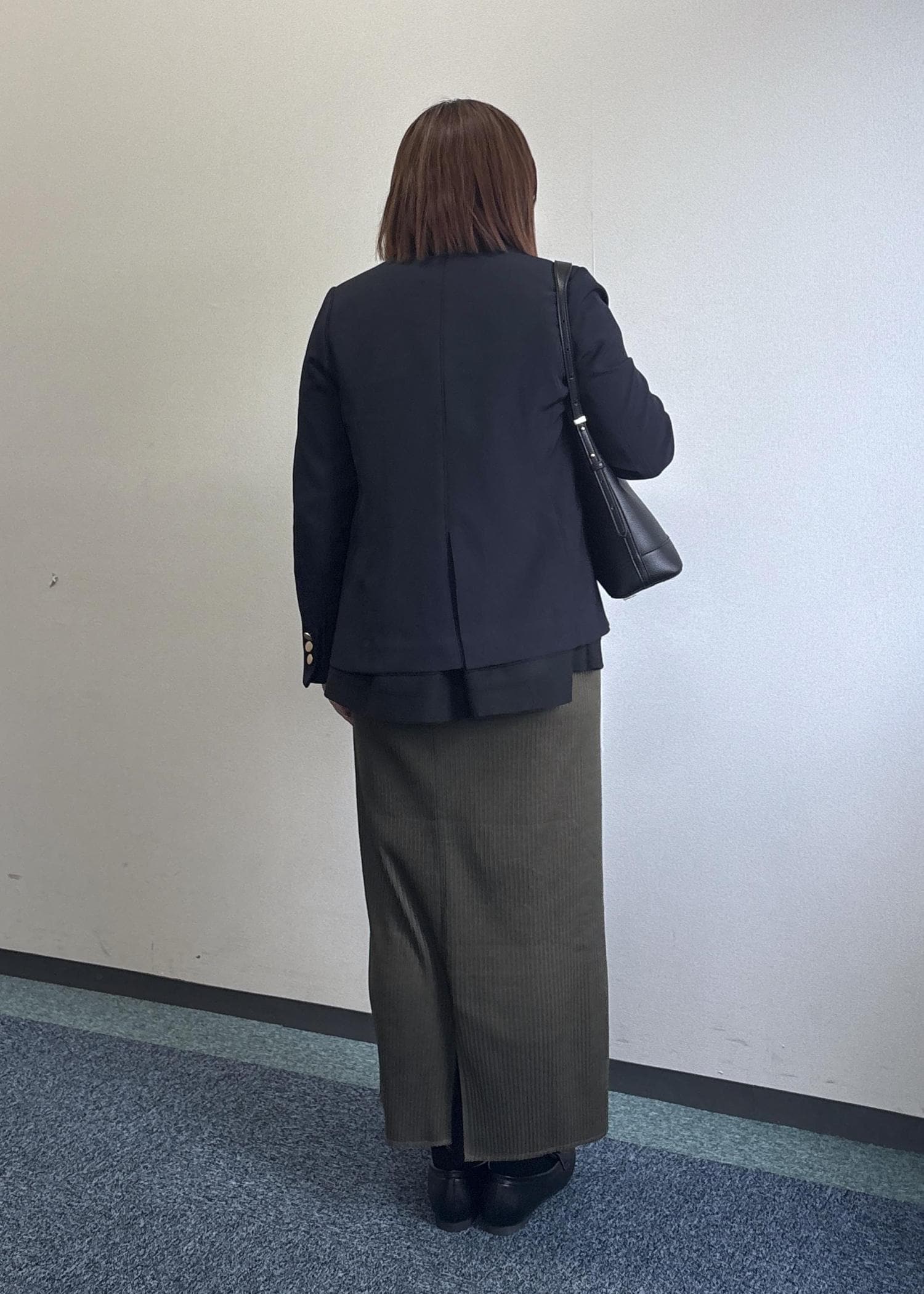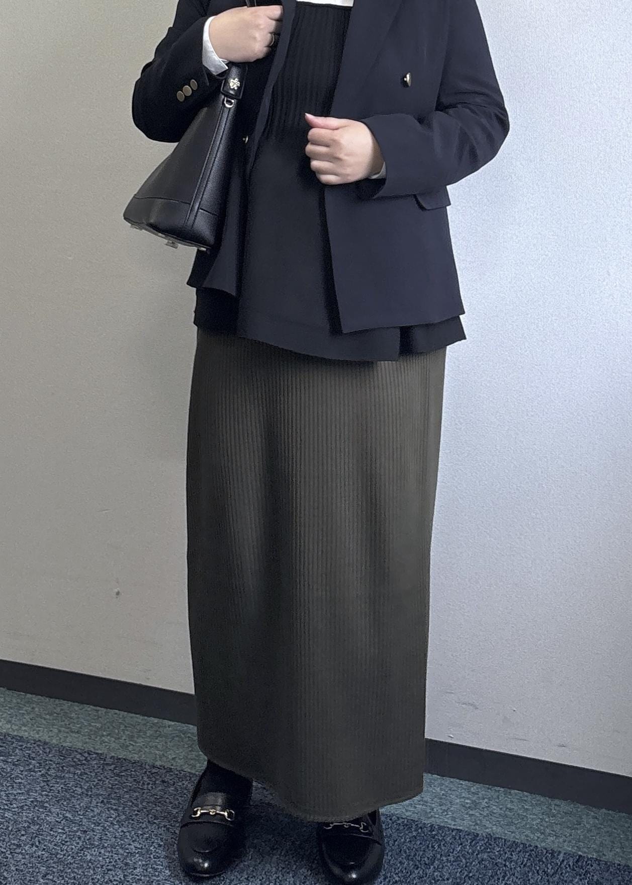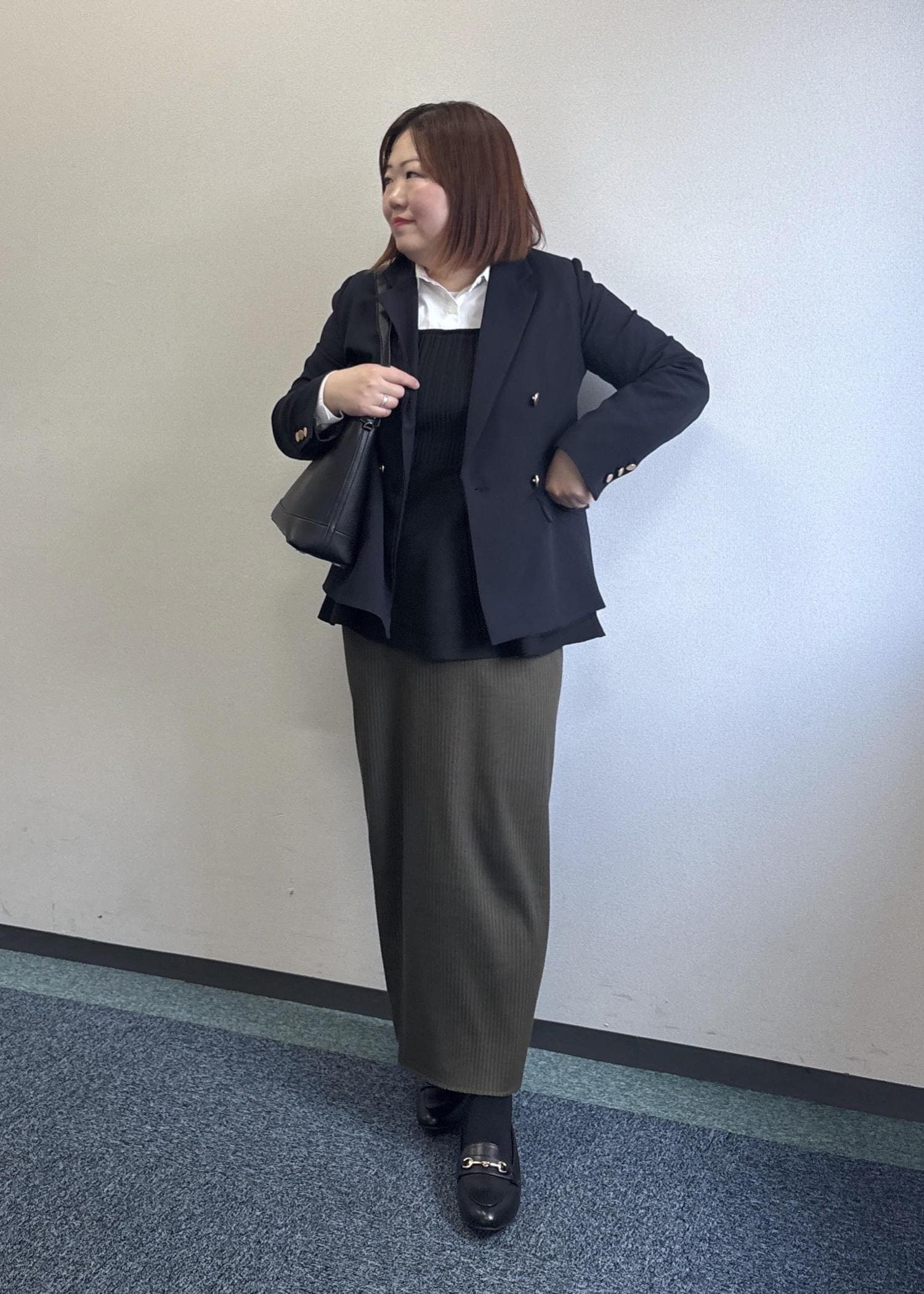 毎年人気の金ボタンジャケットにIラインスカートを合わせた大人カジュアルコーデです。インナーはペプラムシルエットを合わせて、ボディラインを拾わずすっきり見えるコーディネートにしました☺︎