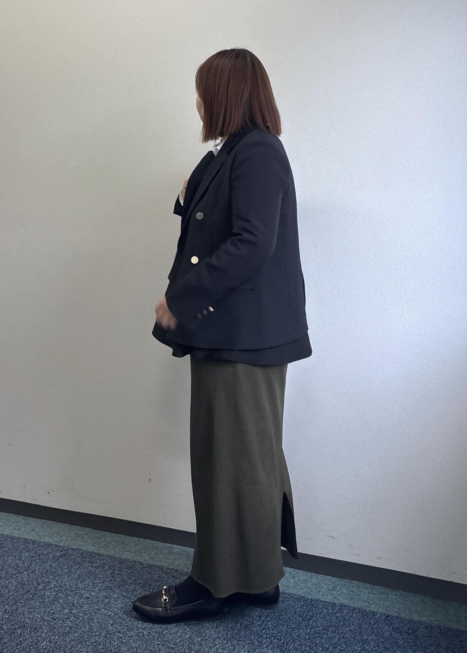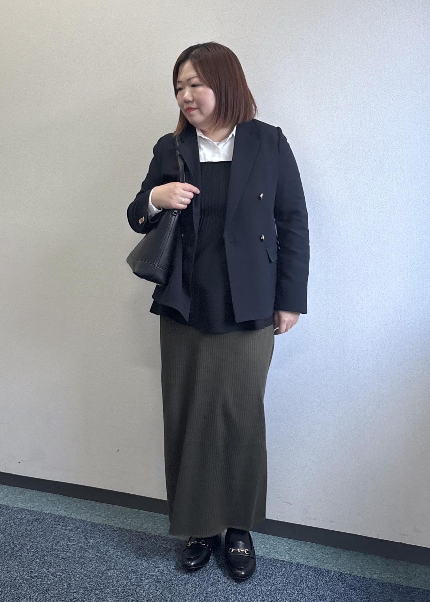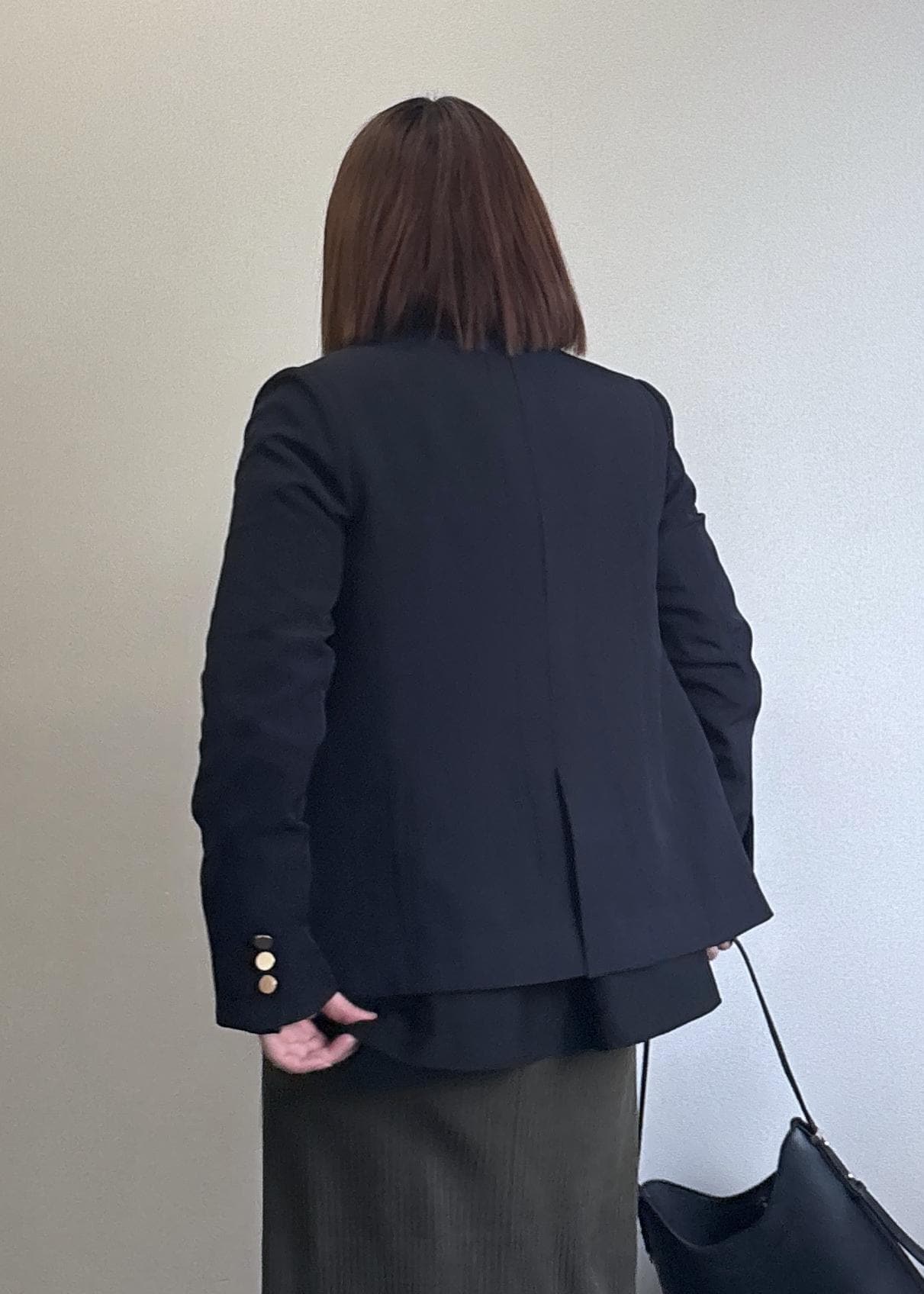 毎年人気の金ボタンジャケットにIラインスカートを合わせた大人カジュアルコーデです。インナーはペプラムシルエットを合わせて、ボディラインを拾わずすっきり見えるコーディネートにしました☺︎