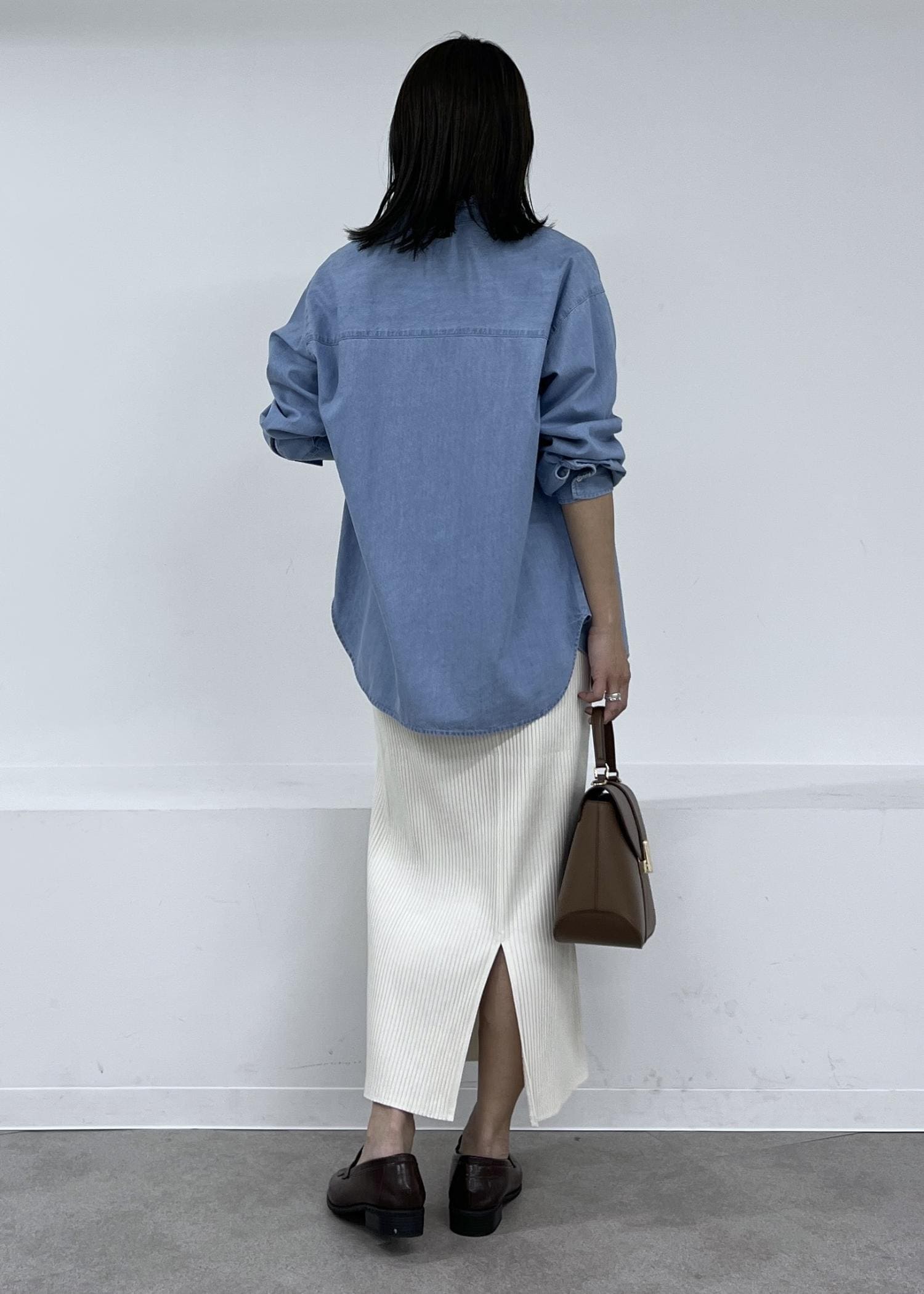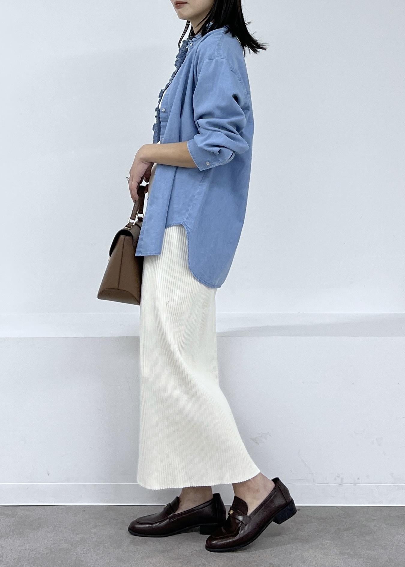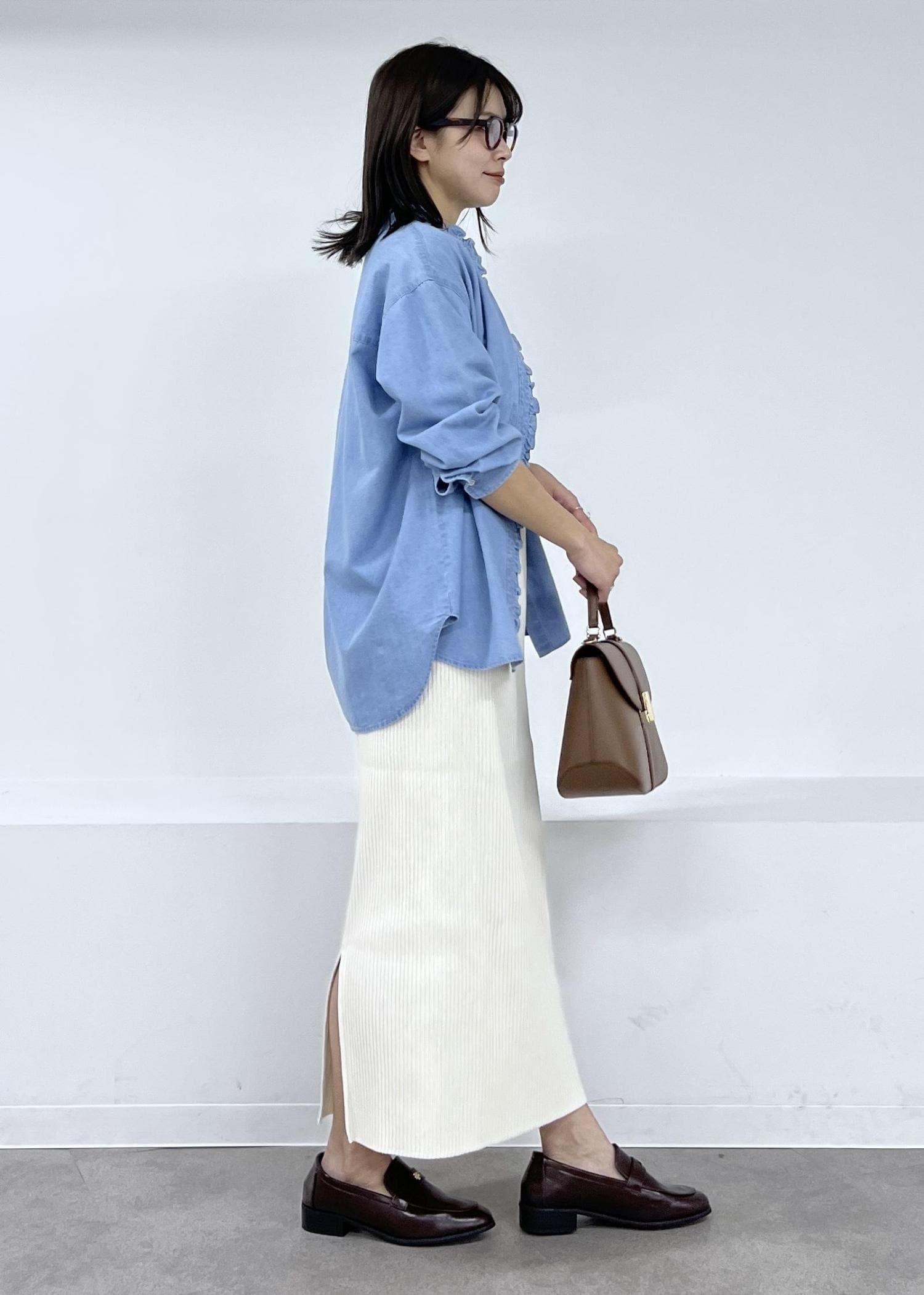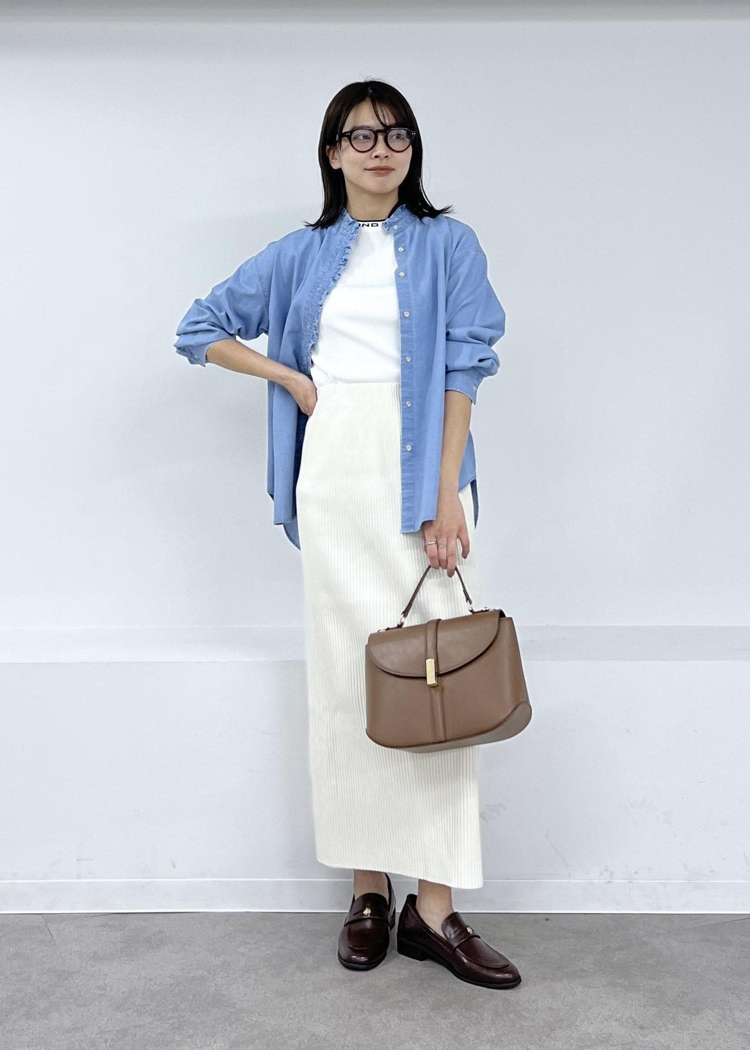 白ニットとアイラインスカートを合わせて大人カジュアルなコーデにしました。