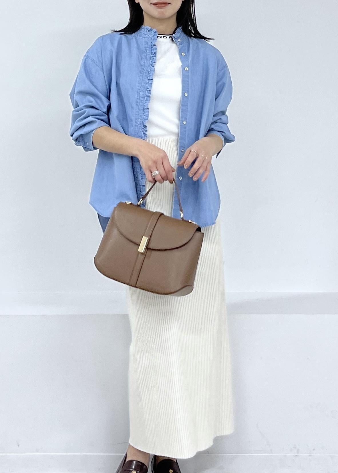 前を開けて羽織にも使えるデニムシャツは、春夏コーデにもおすすめ。