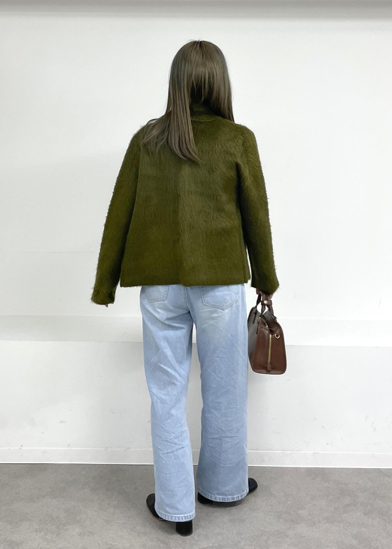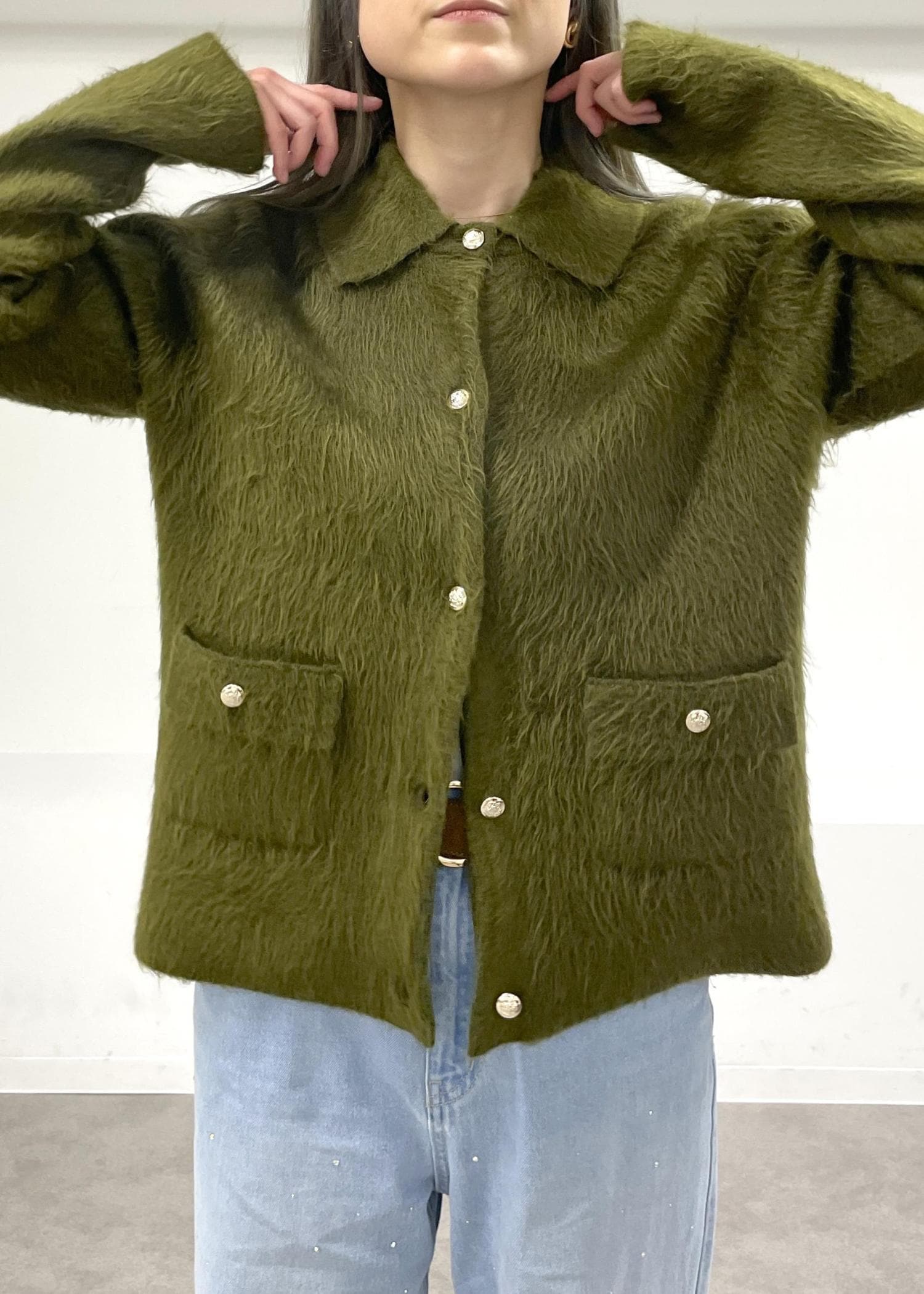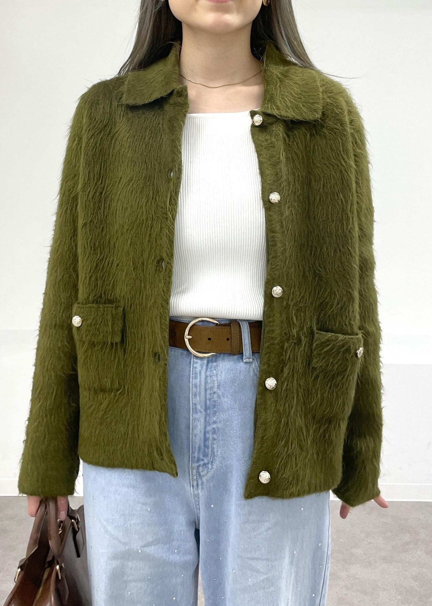 ROPÉ PICNICダブルフェイス襟取り外し起毛カーディガンカーキ / F¥4,543レビュー161cmで腰骨が隠れる丈感。