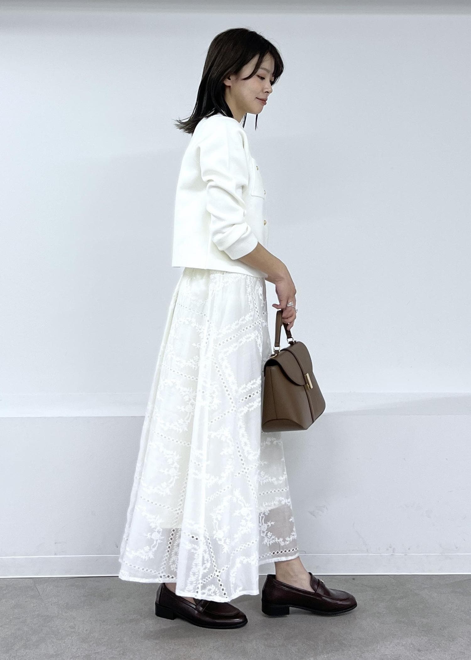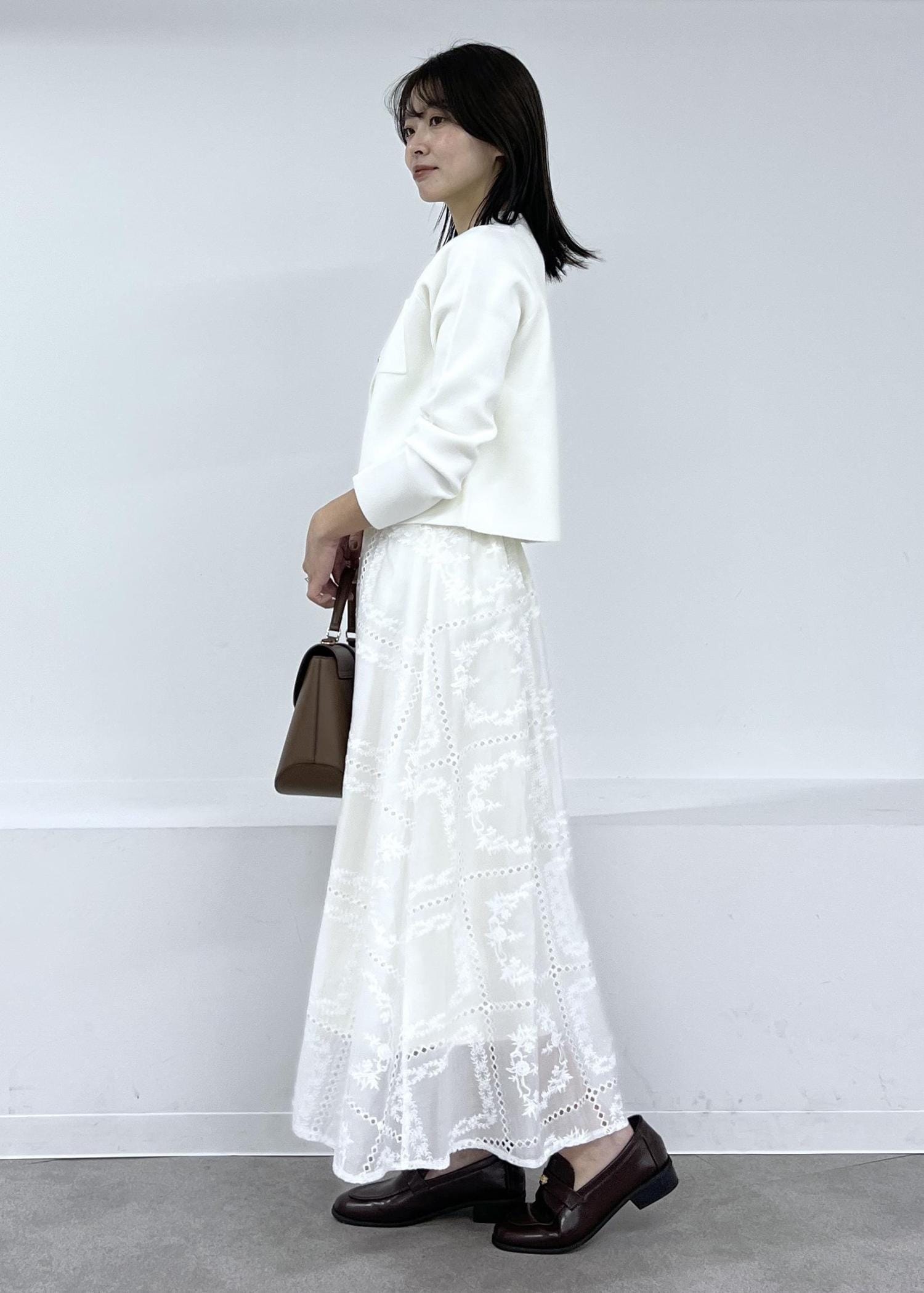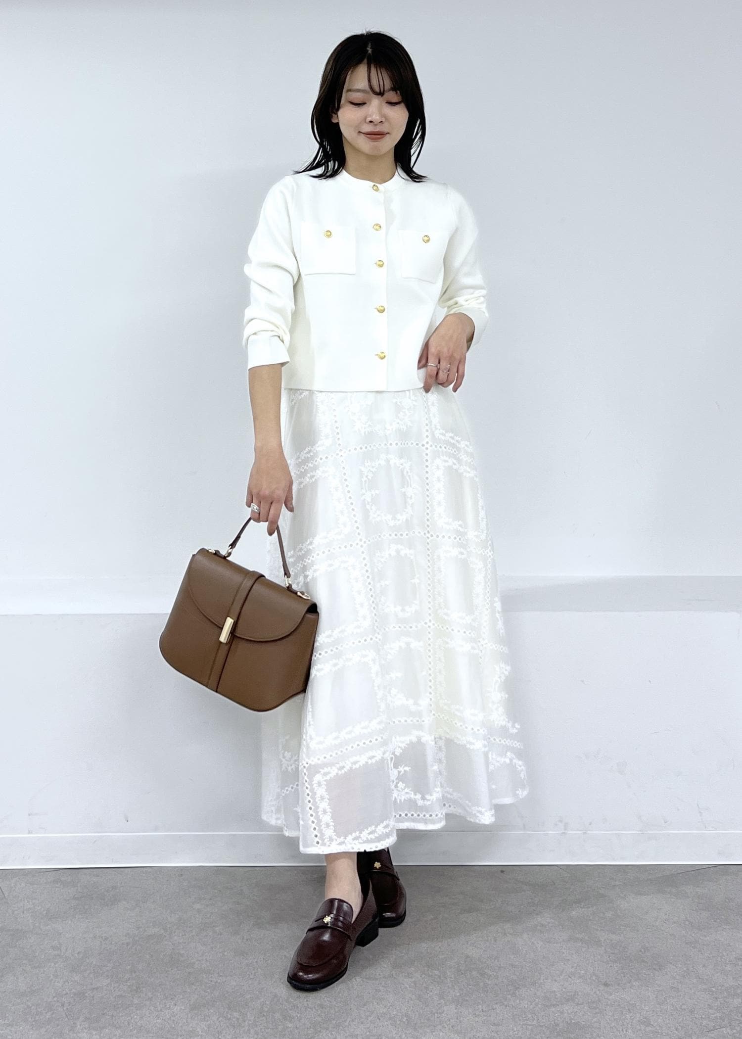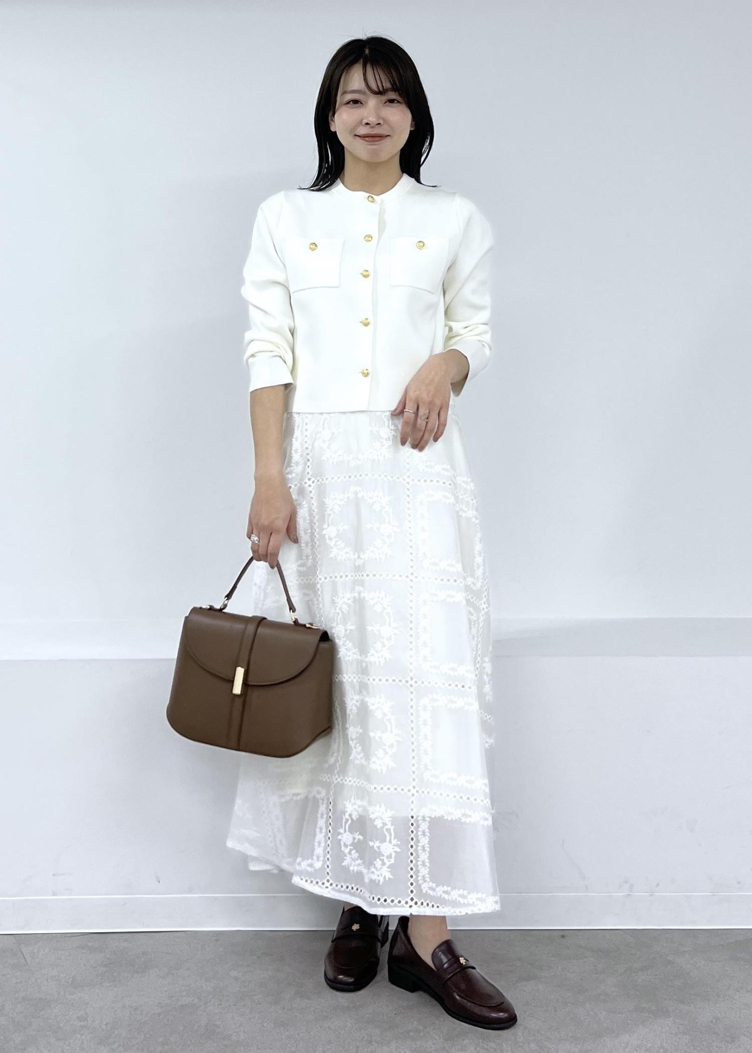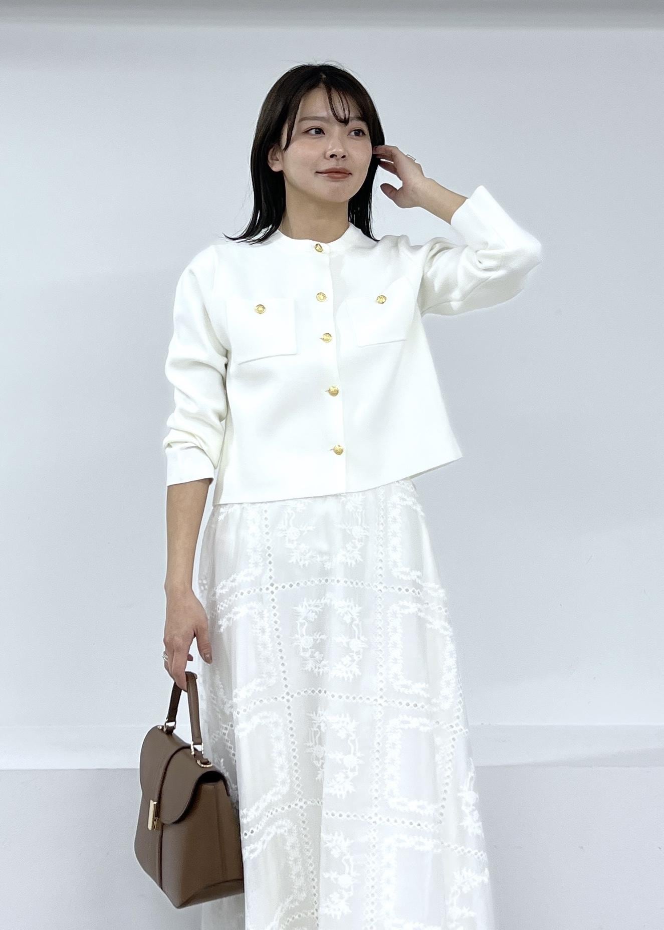 ニットカーデで春のホワイトコーデ