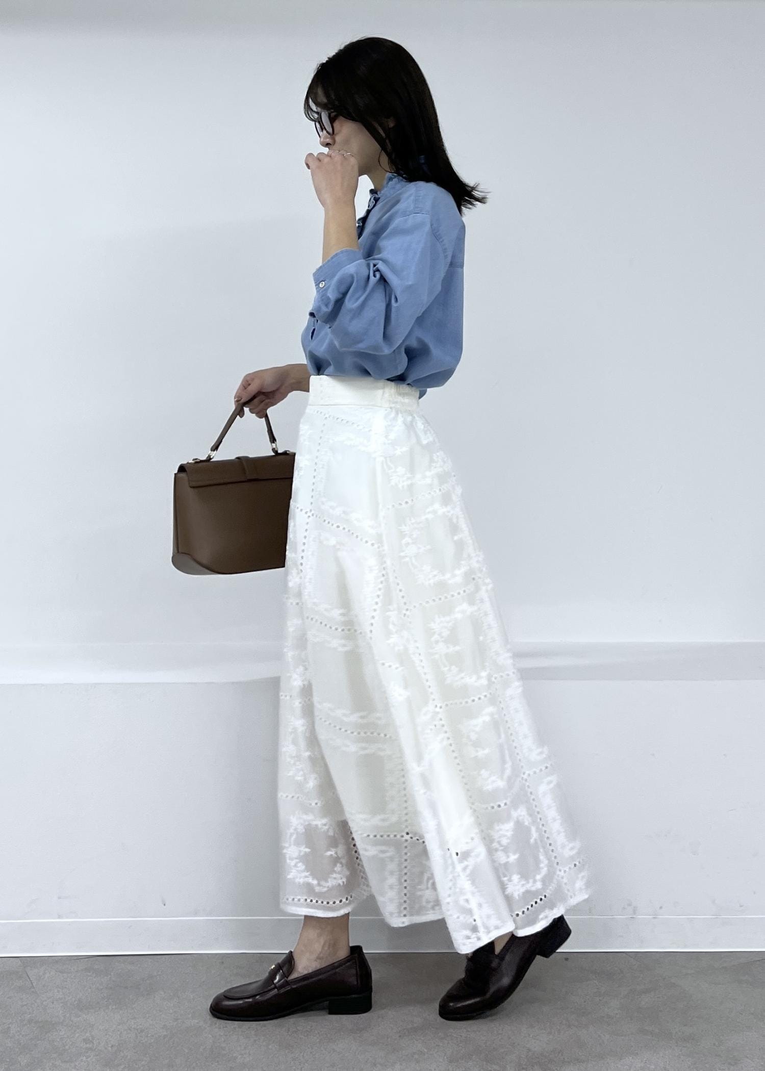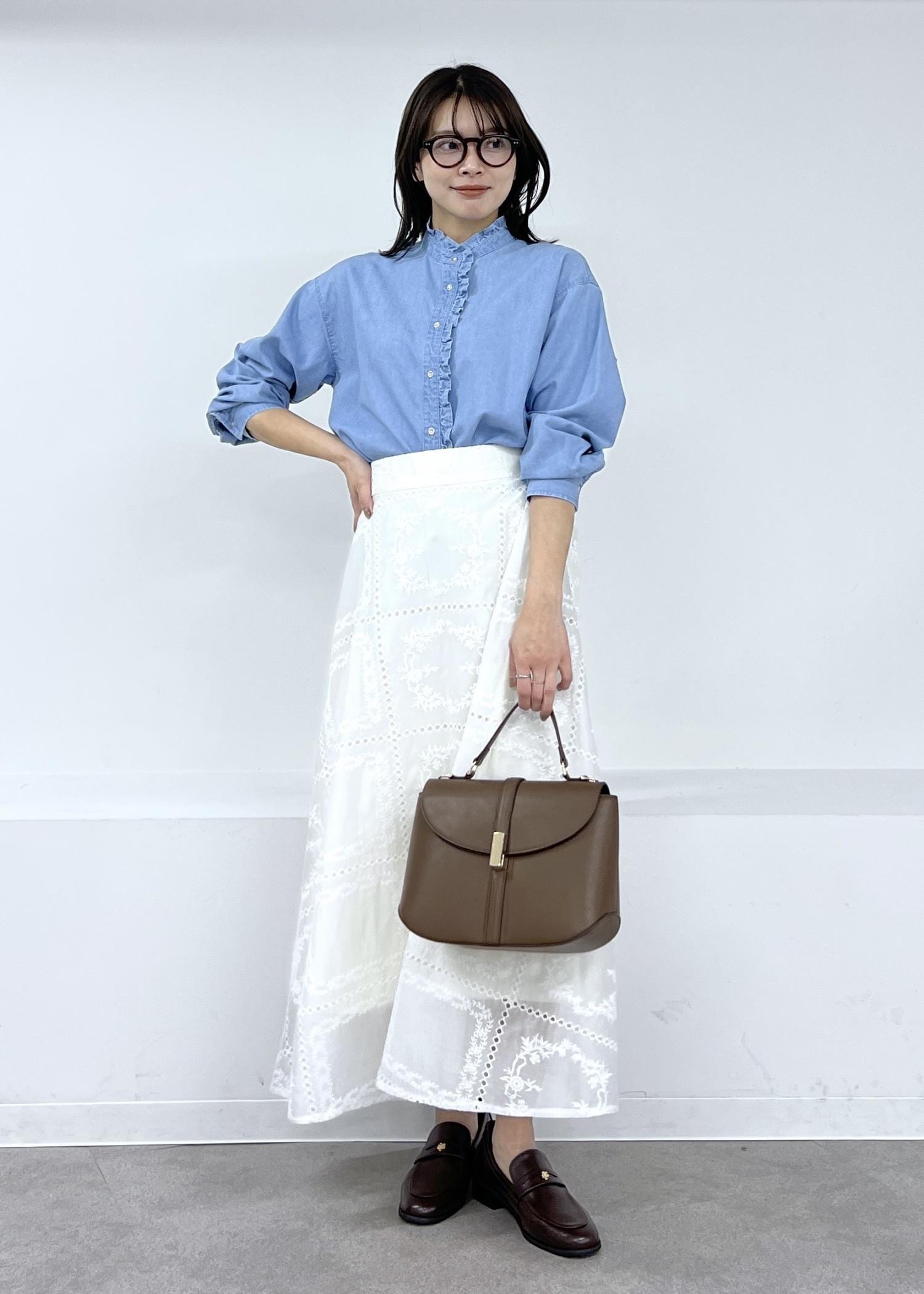 フリル襟のデニムシャツはメンズライクになりすぎないので、大人コーデにピッタリです。
