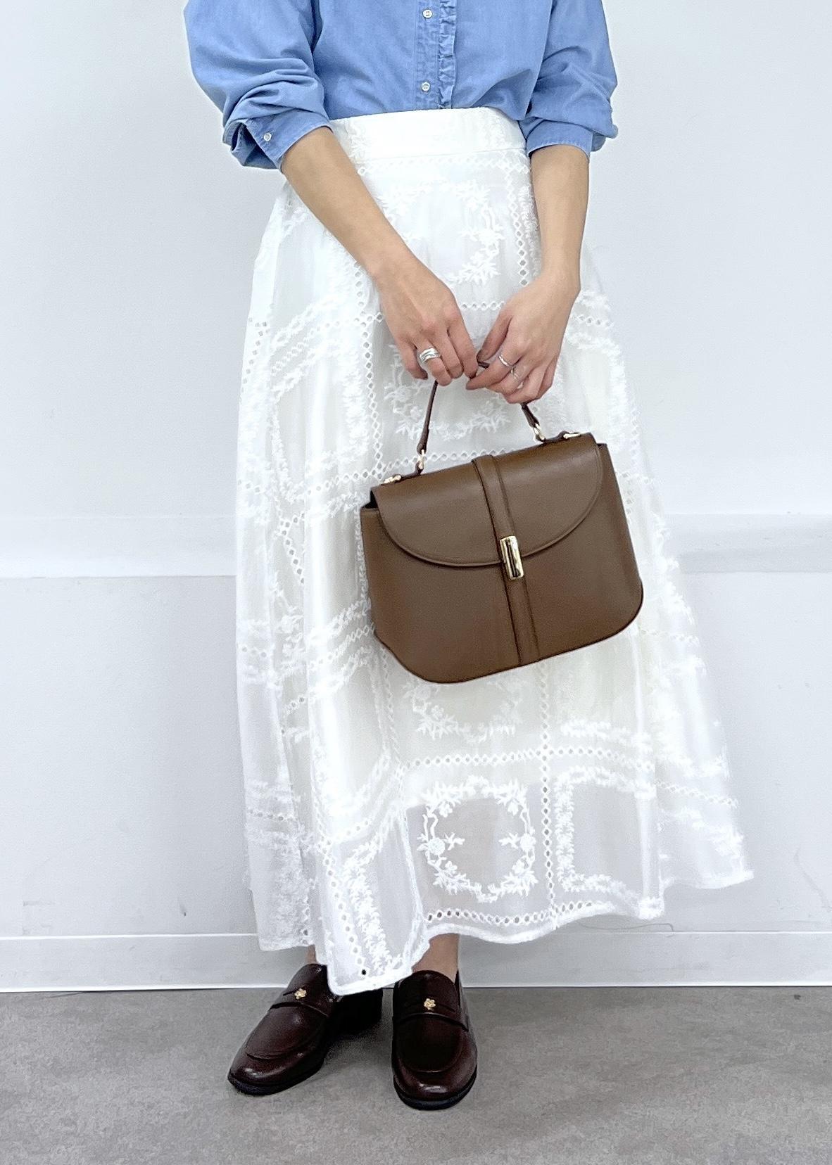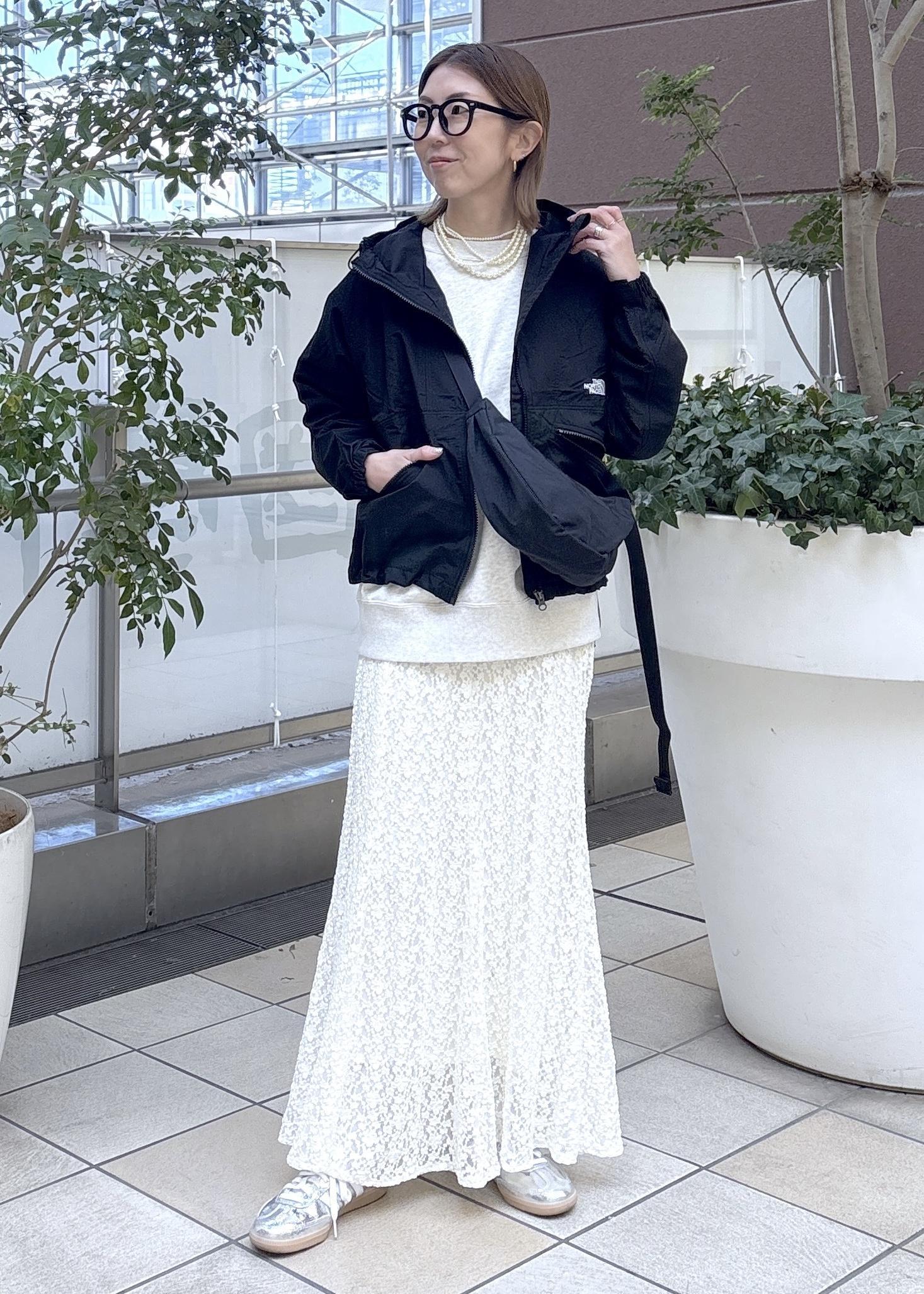 レーススカートはフレアシルエットで華やかさのあるデザインで、春コーデにおすすめ◎。